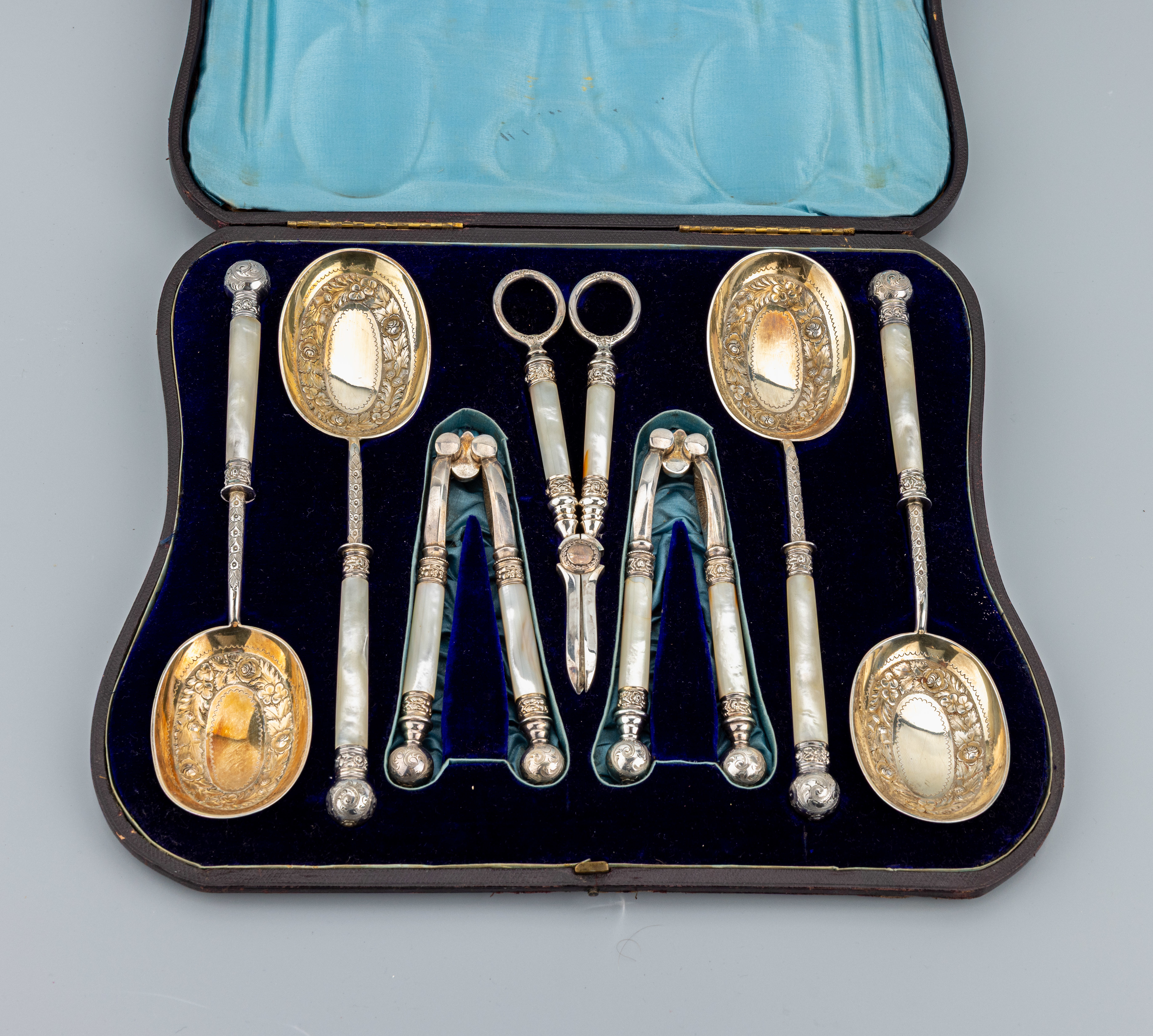 1 Traubenschere, Griffe Perlmuttoptik, in orig. Etui, innen hell- und dunkelblauer