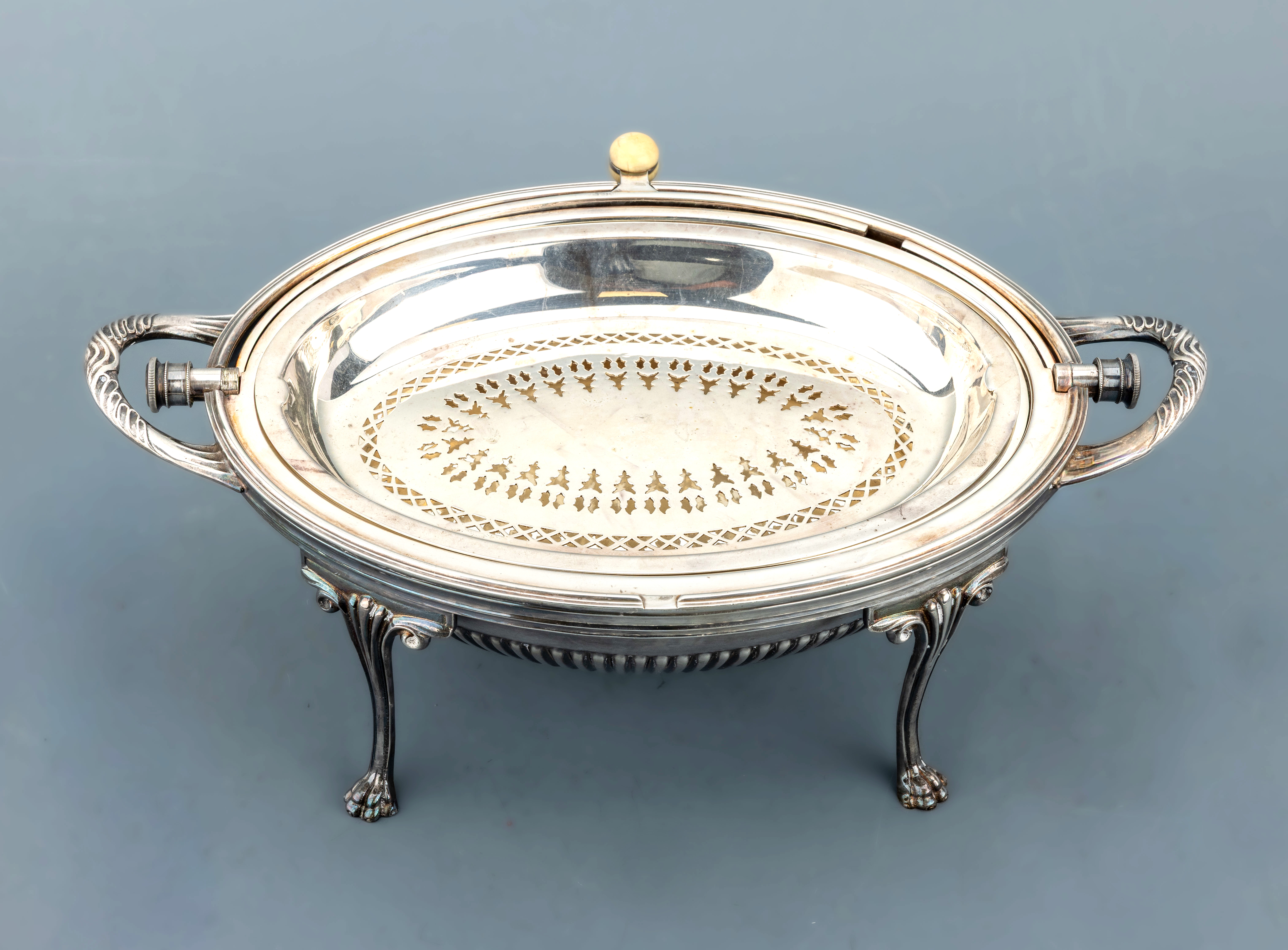 Warmhalteplatte, England London, um 1900-20, Metall versilbert, oval, aufwendig gearbeitet,