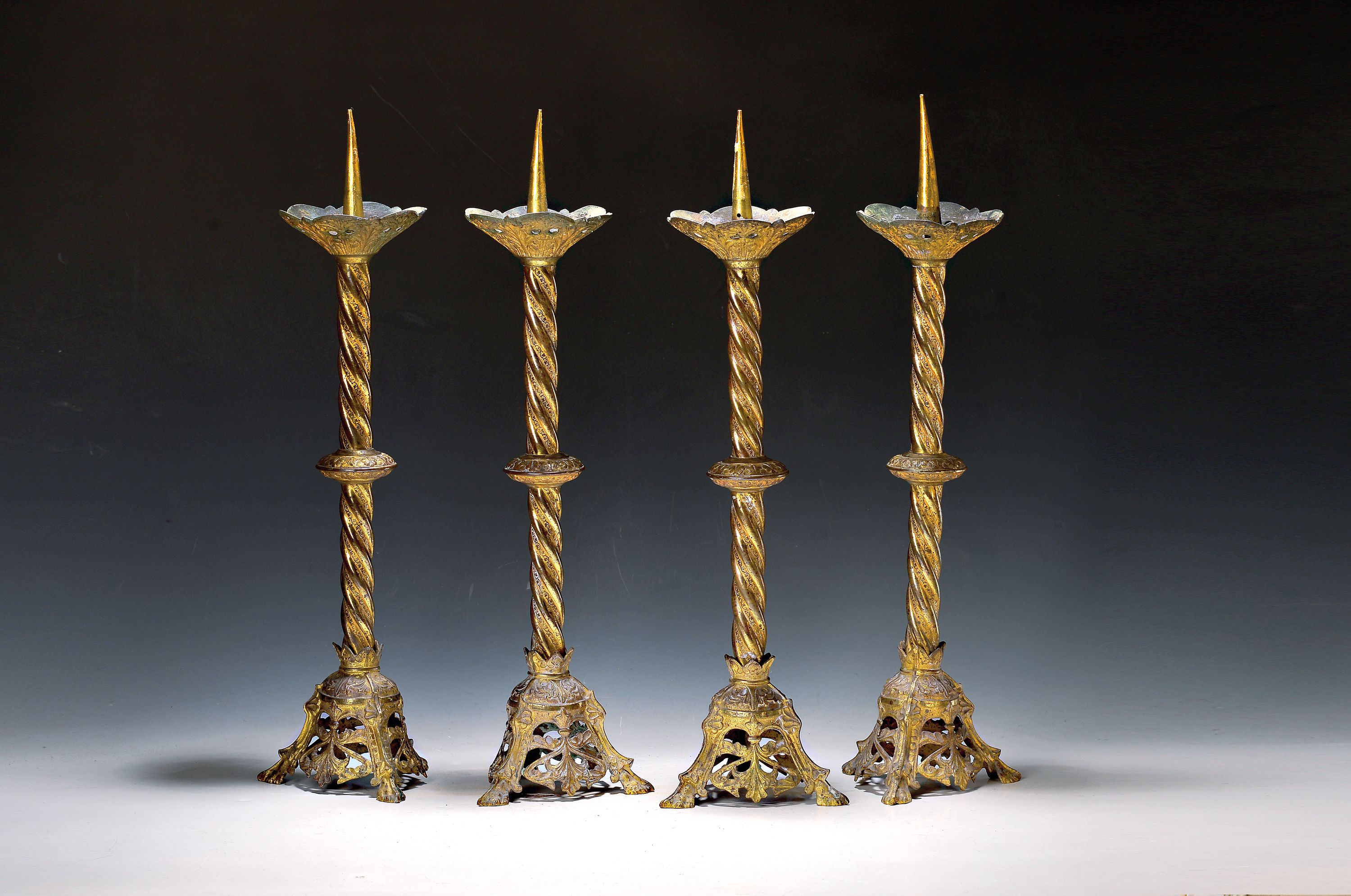 4 Kerzenleuchter/Altarleuchter, Frankreich, um 1870, Gelbguß in sich gedrehte Säulen,