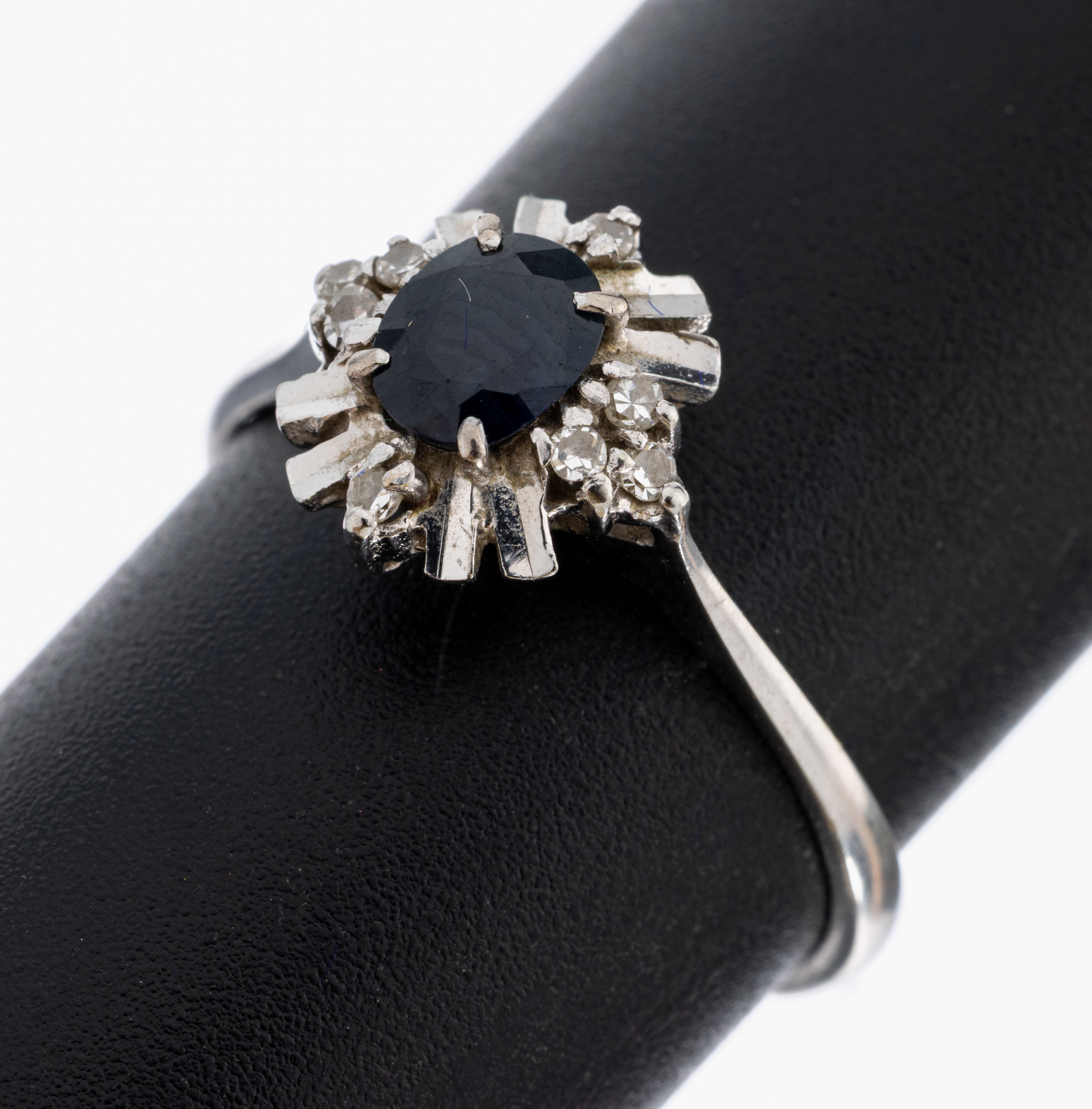 18 kt Gold Saphir-Diamant-Ring, WG 750/000,mittig ovalfacett. Saphir ca. 0.40 ct,
