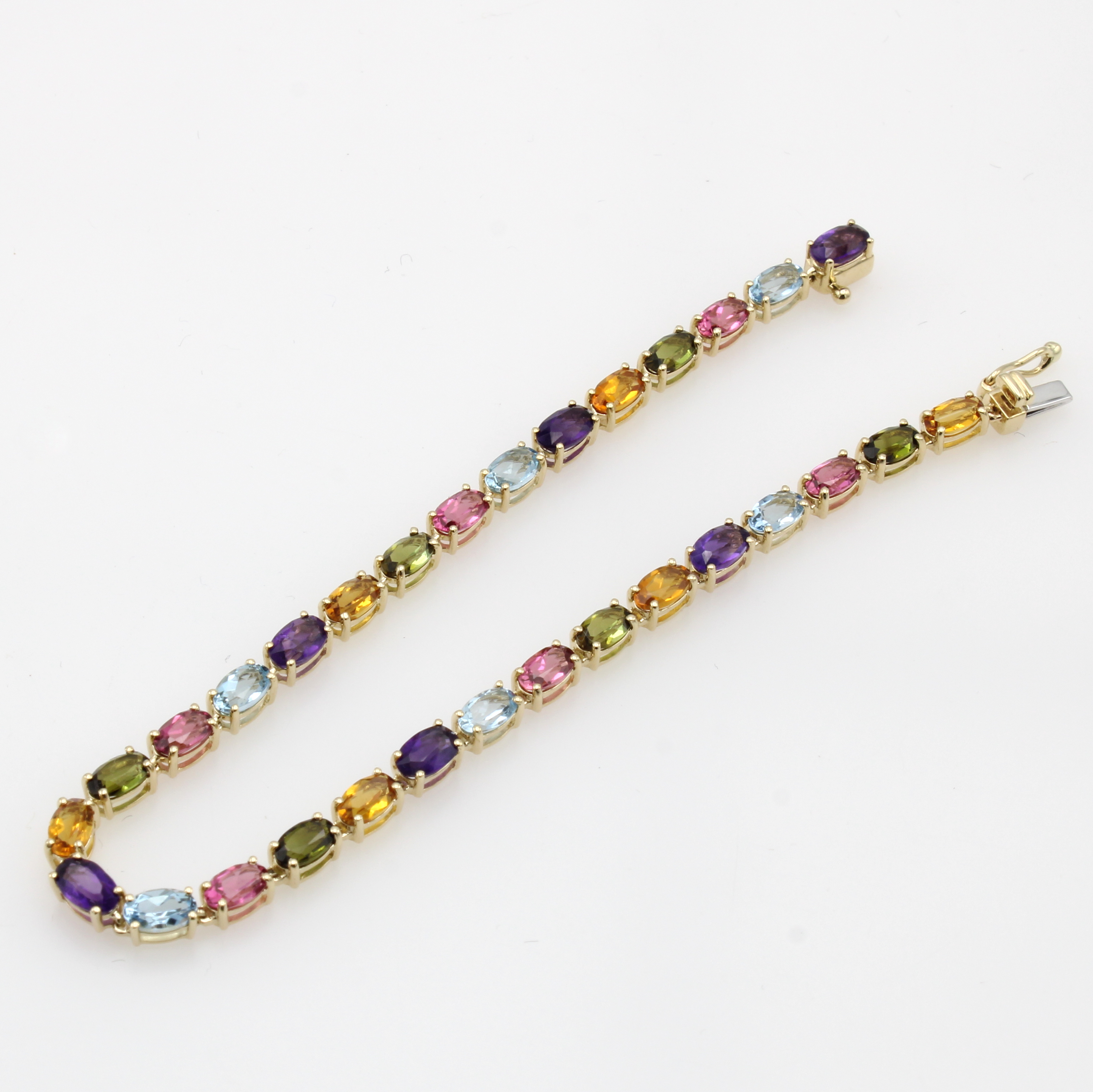 Armband mit Farbsteinen, GG 585/000, Turma- line, Aquamarine, Amethyste u. Citrine, Ka- stenschl. m. Sicherheitsachten, L. ca. 18 cm Schätzpreis: 2300, - EUR
