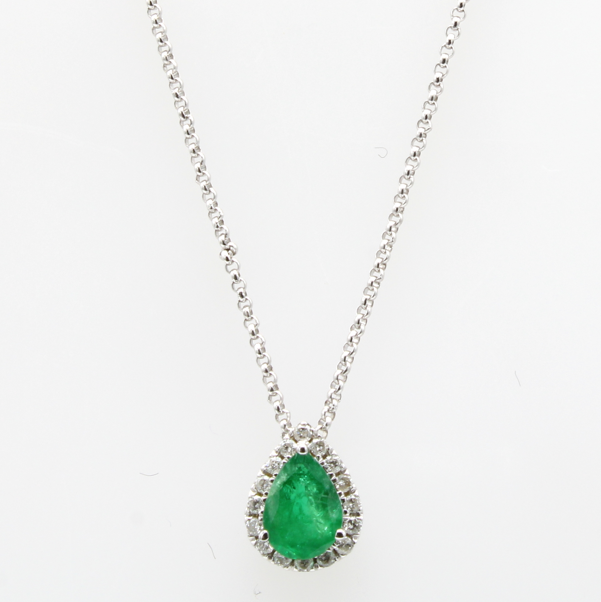 Anhänger mit Smaragd und Brillanten an Kette, WG 750/000, tropfenf. Smaragd ca. 0.59 ct, 16 Brill. zus. ca. 0.10 ct Weiß/si-p, in L. ca. 42 u. 45 cm tragbar Schätzpreis: 1970, - EUR