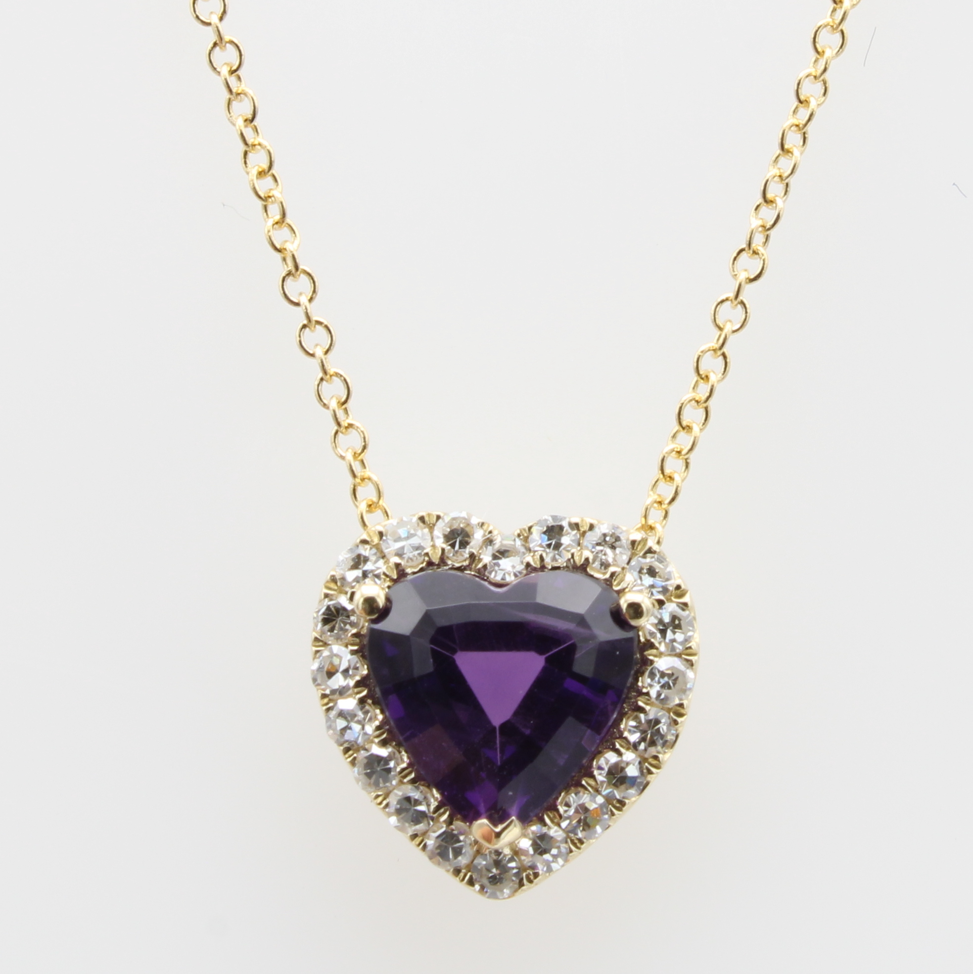 Herzanhänger mit Amethyst und Brillanten an Kette, GG 585/000, Amethystherz ca. 1.50 ct,20 Brill. zus. ca. 0.25 ct feines Weiß/vvs-vs,in L. ca. 42 u. 45 cm tragbar Schätzpreis: 1350, - EUR