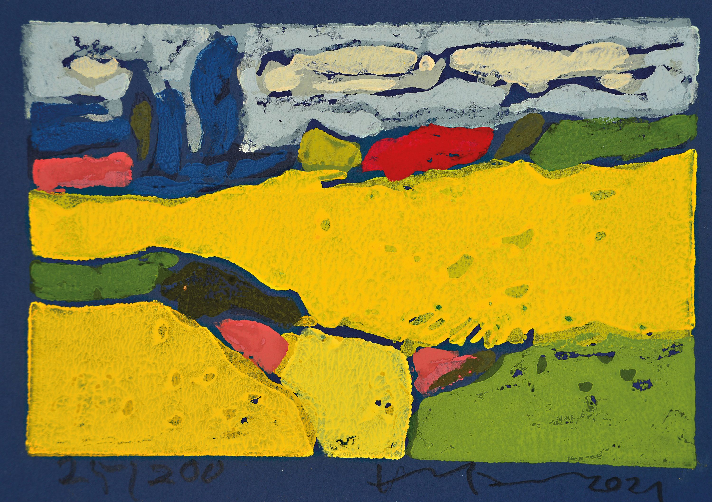 Klaus Fußmann, geb. 1938, Raps bei Gelting, Farblinolschnitt auf blauem Papier,