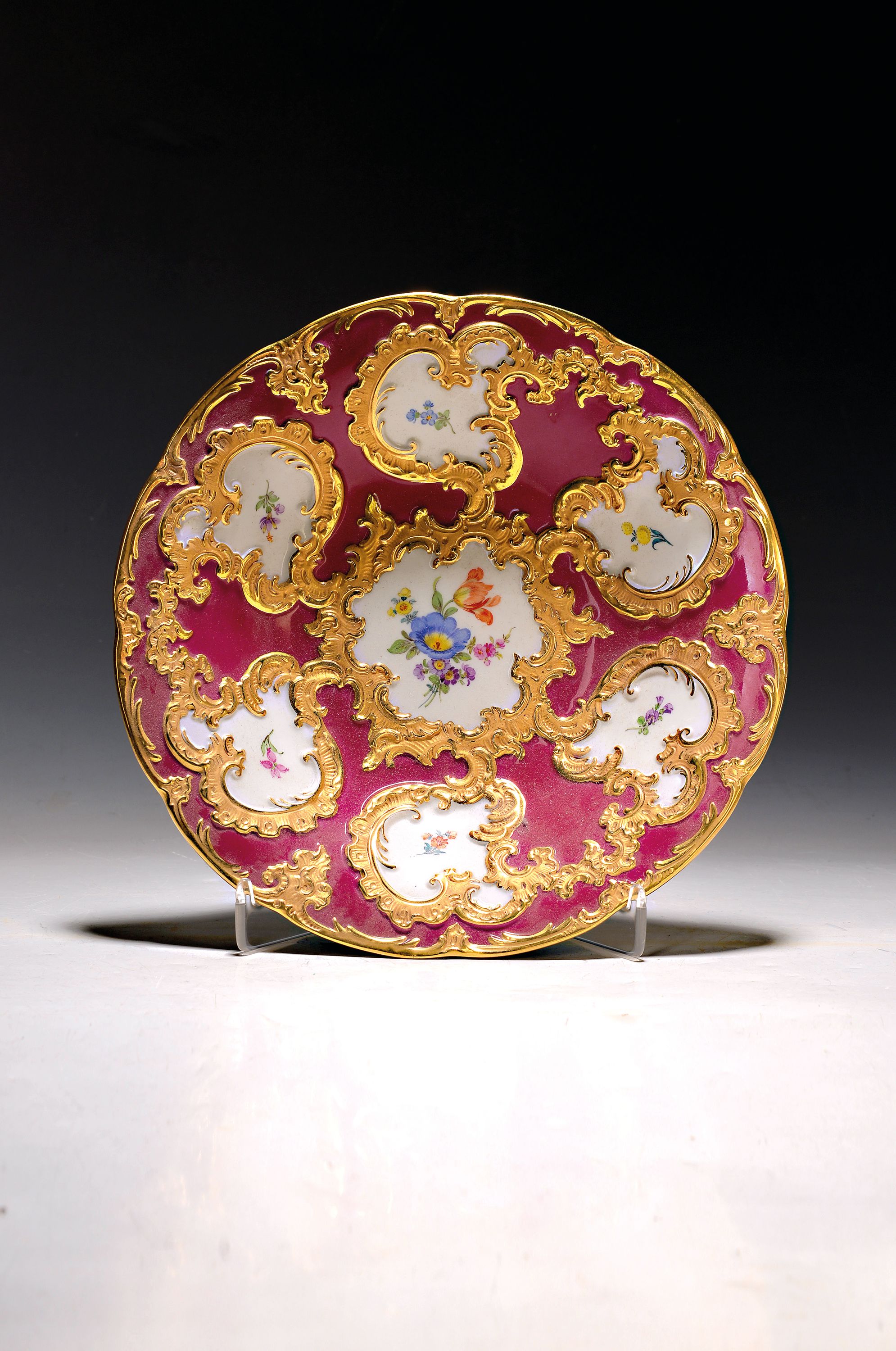 Prunkteller, Meissen, 20. Jh., 1. Wahl, partiell dunkelrot glasiert, reich reliefiert