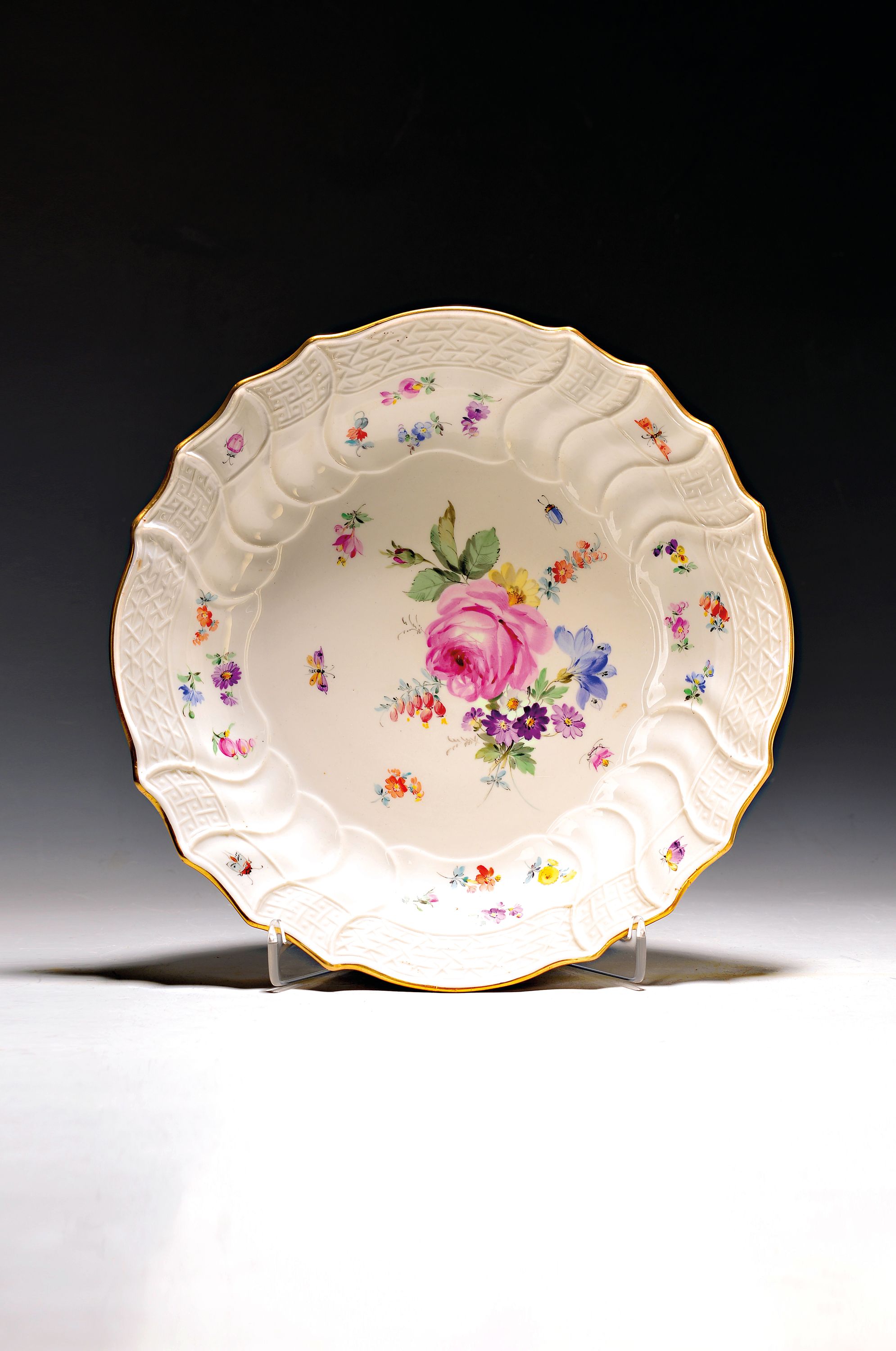 Große runde Schale, Meissen, 19. Jh., 1. Wahl, reliefierter Rand, reich bunt bemalt