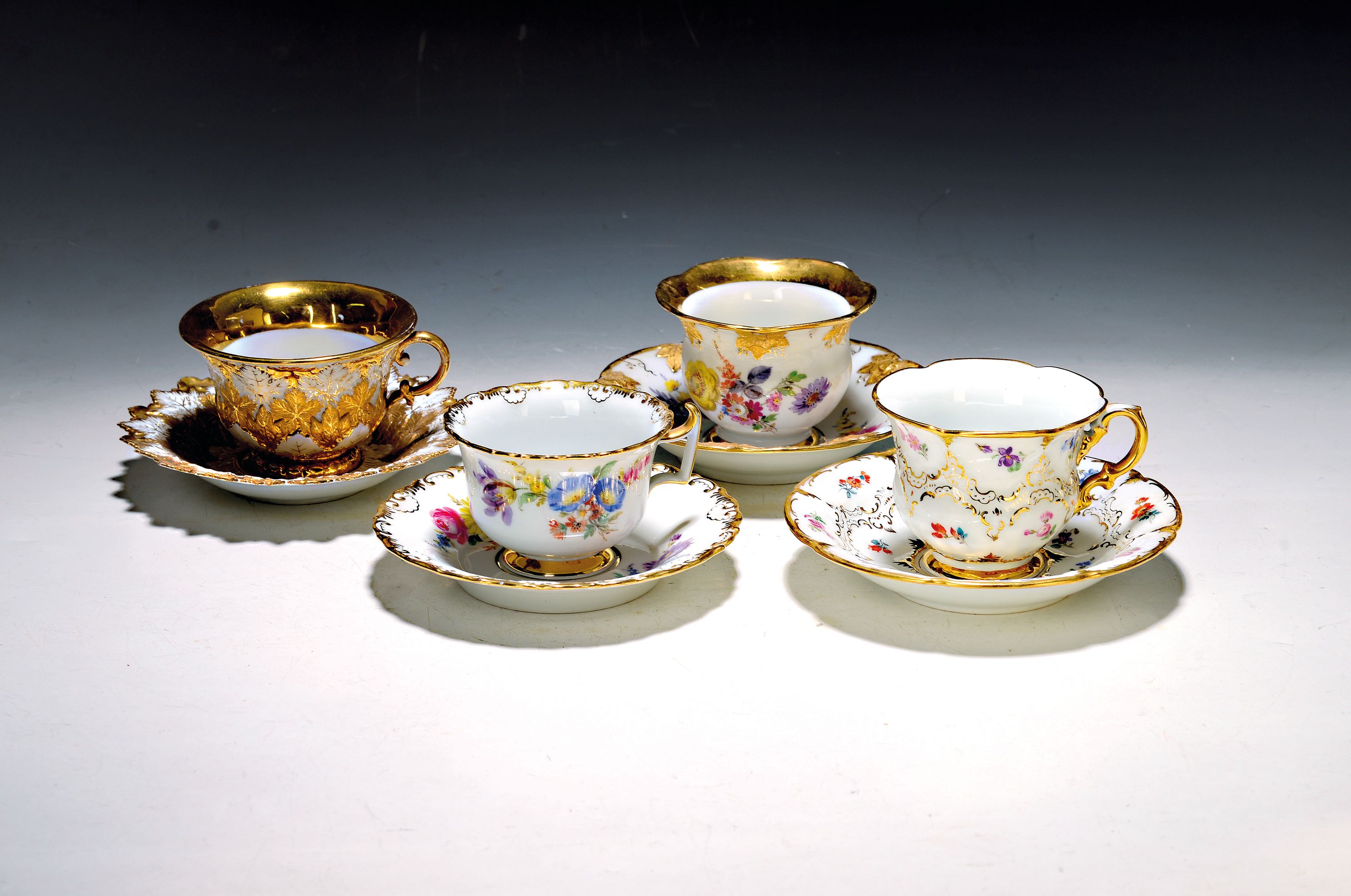 4 unterschiedliche Tassen mit Untertassen, Meissen, 20. Jh., 1. Wahl, 1x mit Blätterrelief,