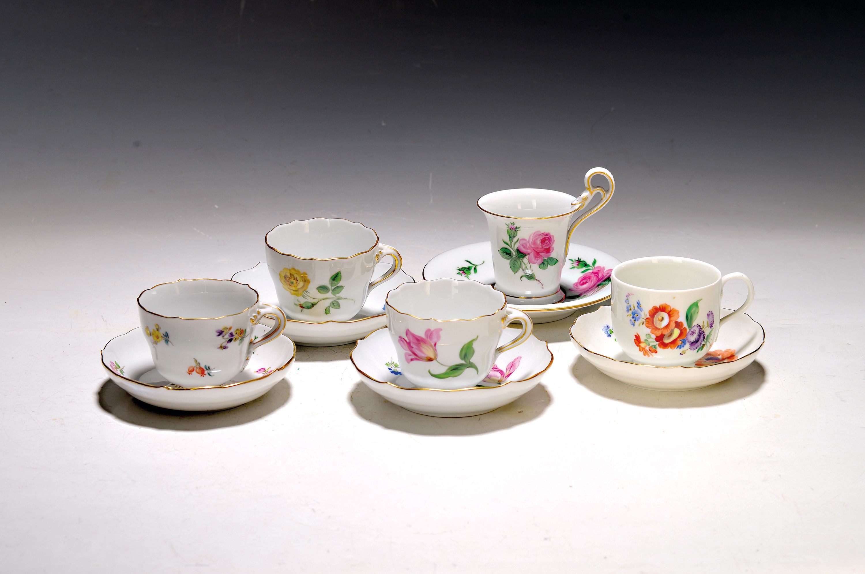 10 Mokkatassen mit 8 Untertassen, Meissen, 20. Jh., darunter gelbe Rose, rote Rose,