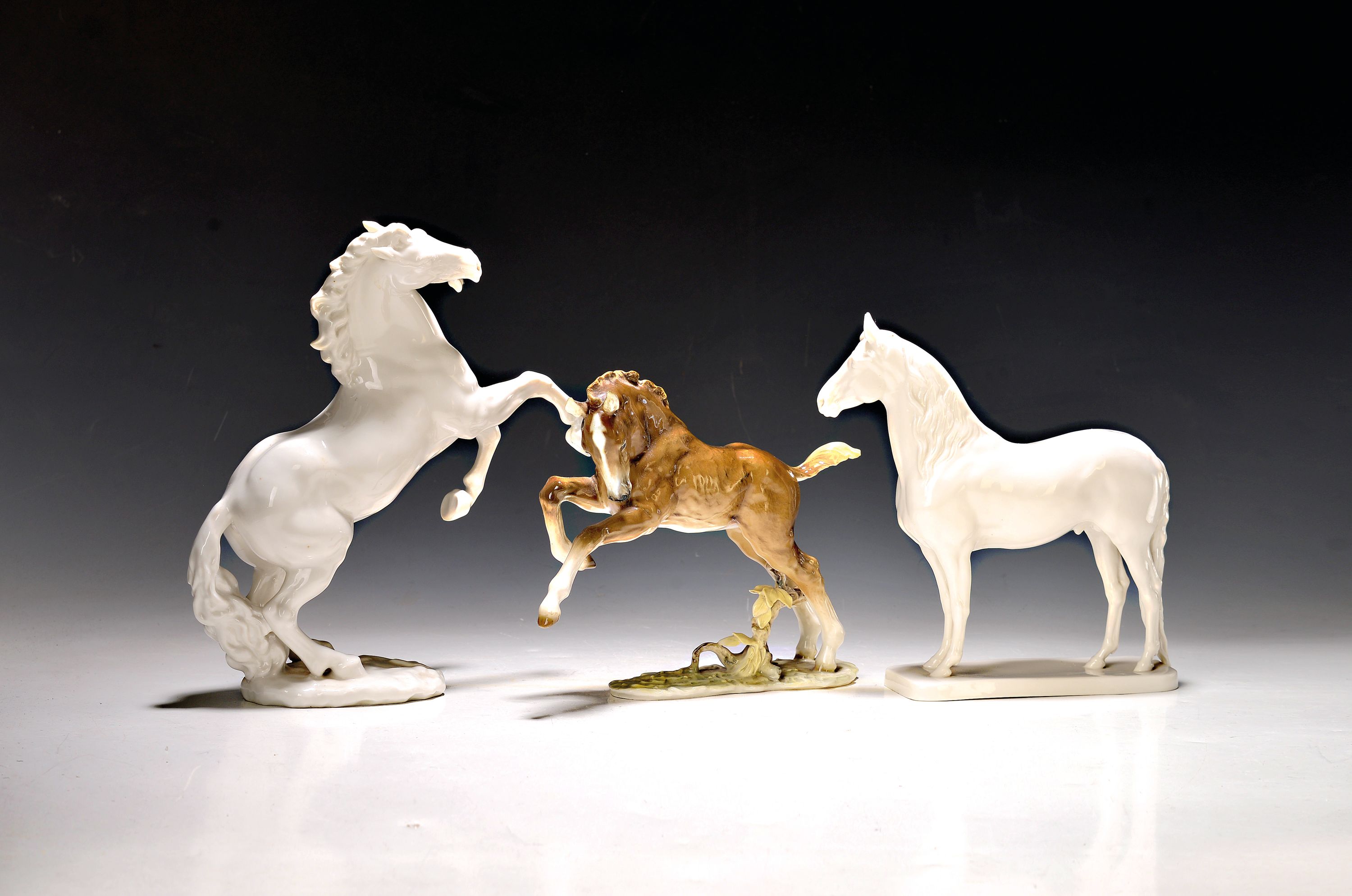 3 Porzellanfiguren von Pferden, 1x Nymphenburg, stehendes Pferd, weiß, H. ca. 21
