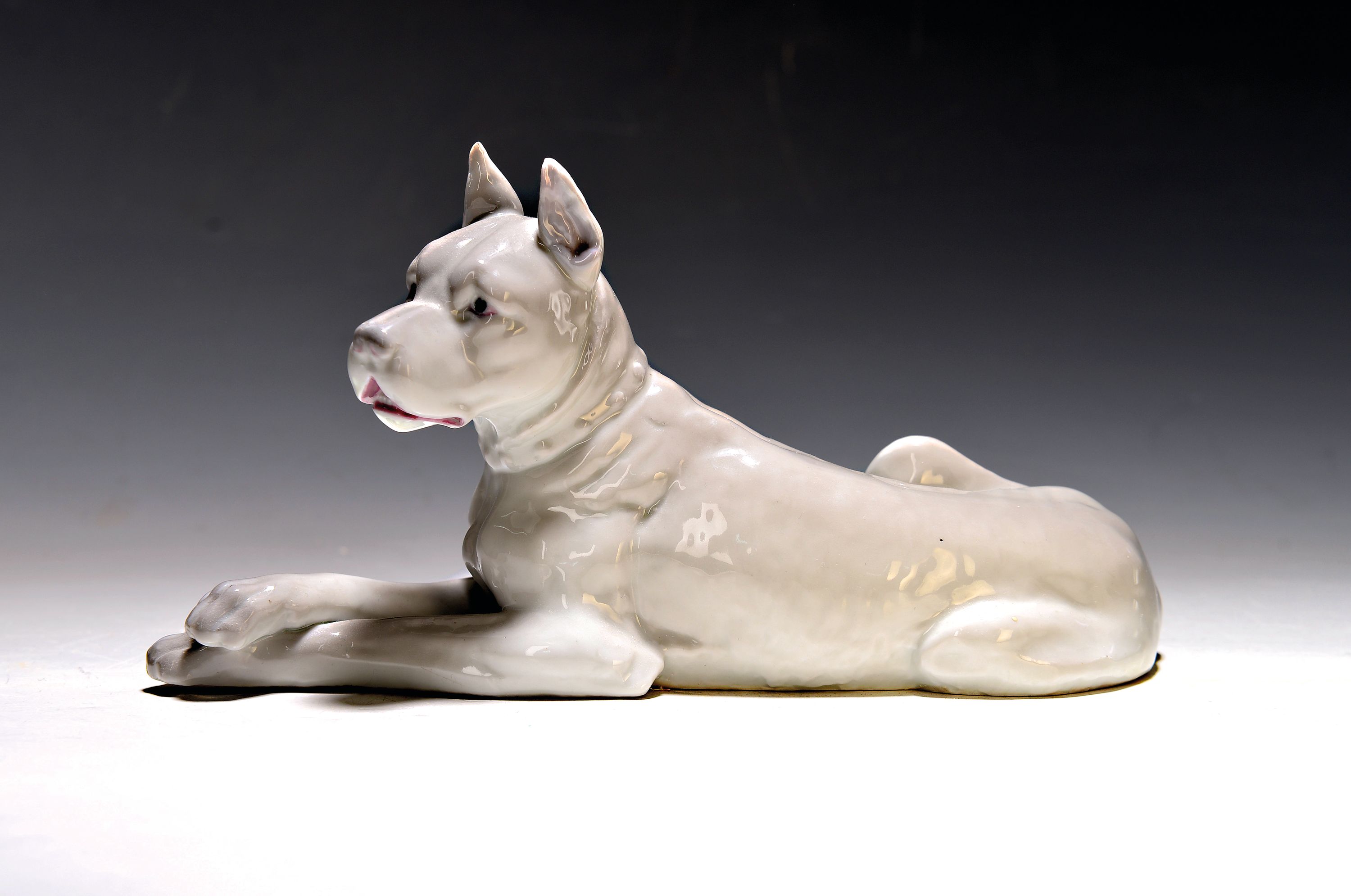 Porzellanfigur, Heubach, 1920er Jahre, liegende Dogge, naturalistisch bemalt, ca.