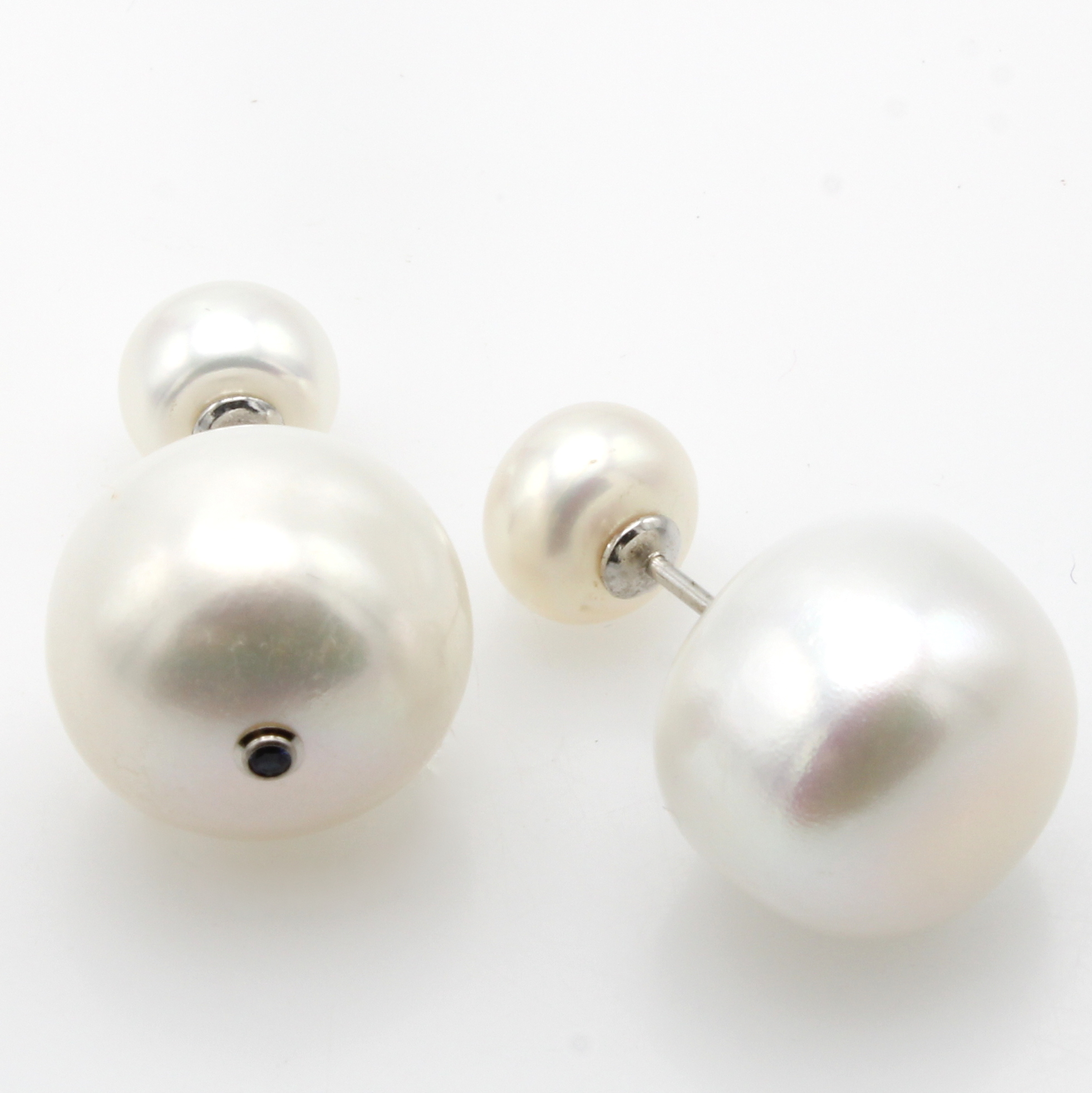 Paar Ohrstecker mit Süßwasserzuchtperlen "double face", 925er Silber, z.T. rhod., weiße, buttonf. Perlen, D. ca. 13-14 u. 7-8 mm
