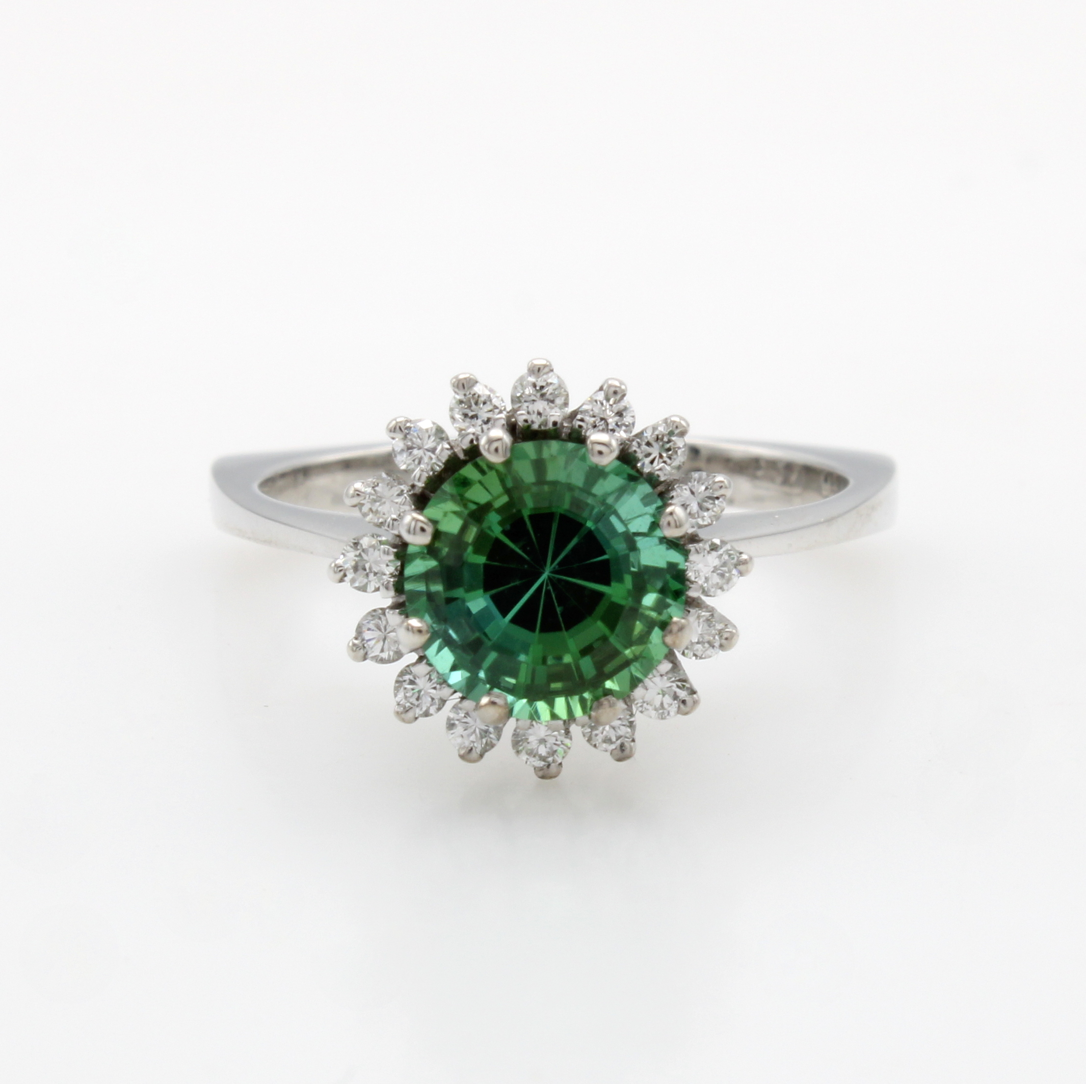 Ring mit Turmalin und Brillanten, WG 750/000, fac., grüner Turmalin erhöht gef., 16 Brill.zus. ca. 0.48 ct feines Weiß/vs, Unterteil d. Ringschiene abgeeckt, RW ca. 54 Schätzpreis: 2800, - EUR