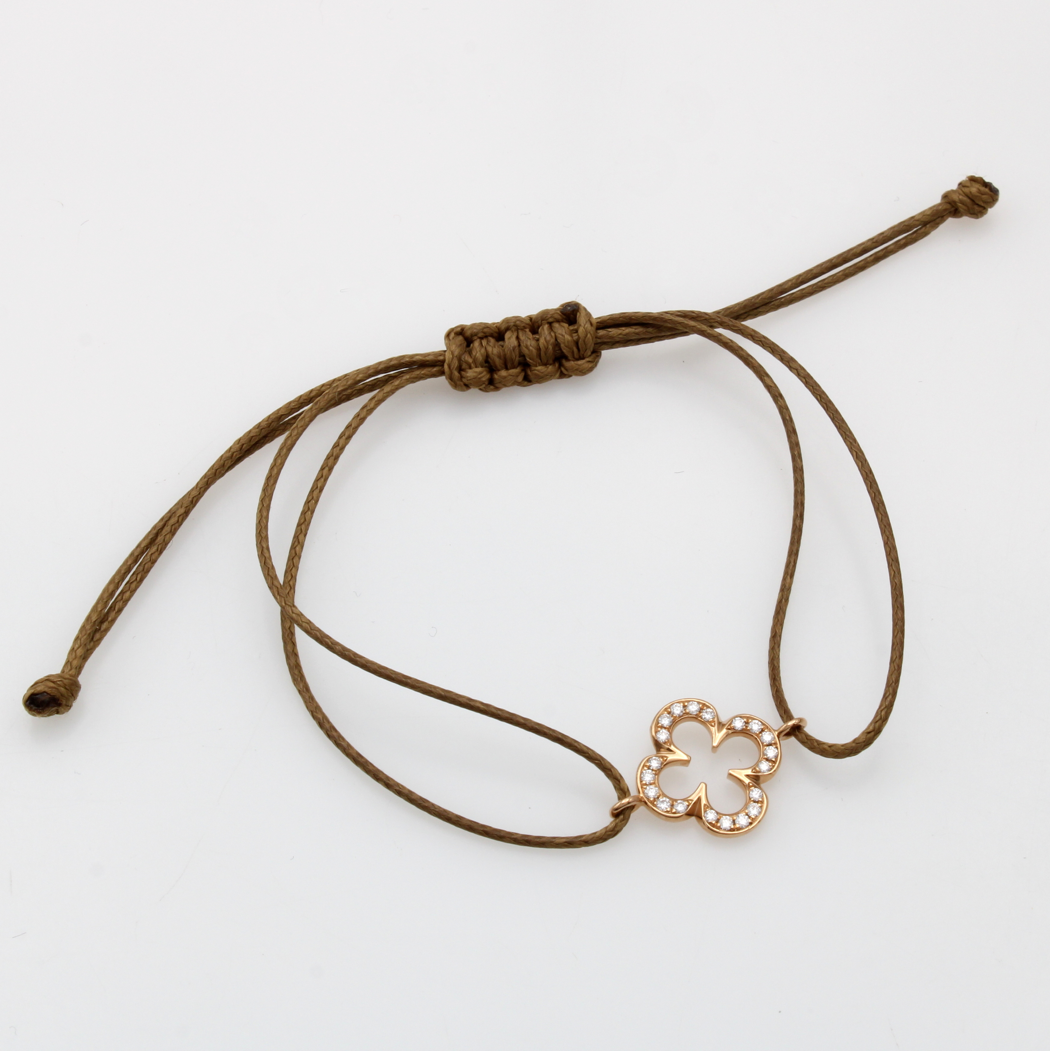 Stoffarmband "Kleeblatt" mit Brillanten, RG 750/000, hellbrauner Stoff, Mittelteil bes. m. Brill. zus. ca. 0.15 ct feines Weiß/si, L. variabel verstellbar Schätzpreis: 1300, - EUR