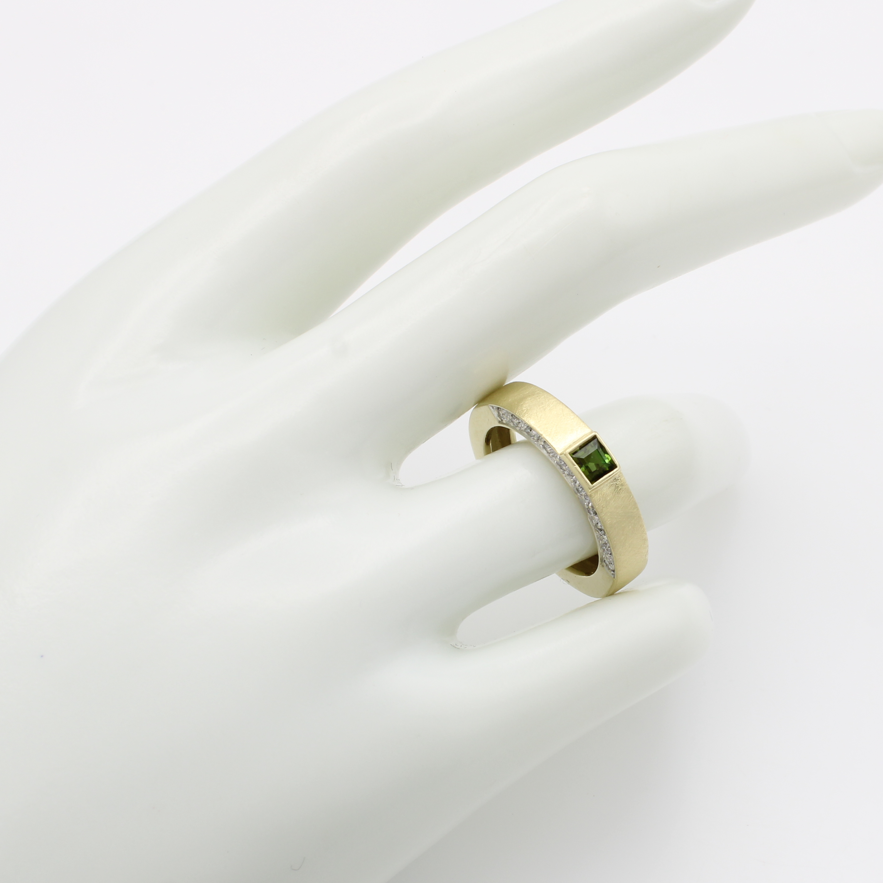 Ring mit Turmalin und Brillanten, GG 585/000, Turmalin ca. 0.15 ct, Brill. seitl. in Ring-schiene gef. zus. ca. 0.20 ct feines Weiß/vs, Ringschiene gebürstet, RW ca. 55 Schätzpreis: 1400, - EUR