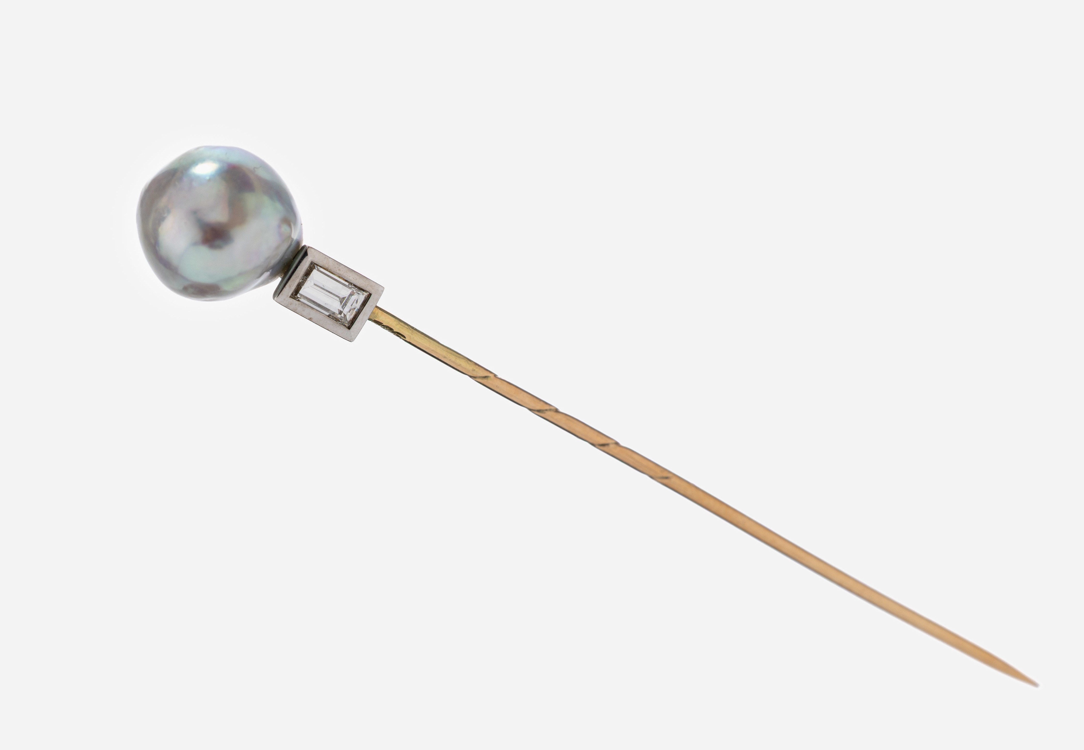 14 kt Gold Perl-Diamant-Krawattennadel, GG/WG 585/000, barocke Zuchtperle, D. ca.
