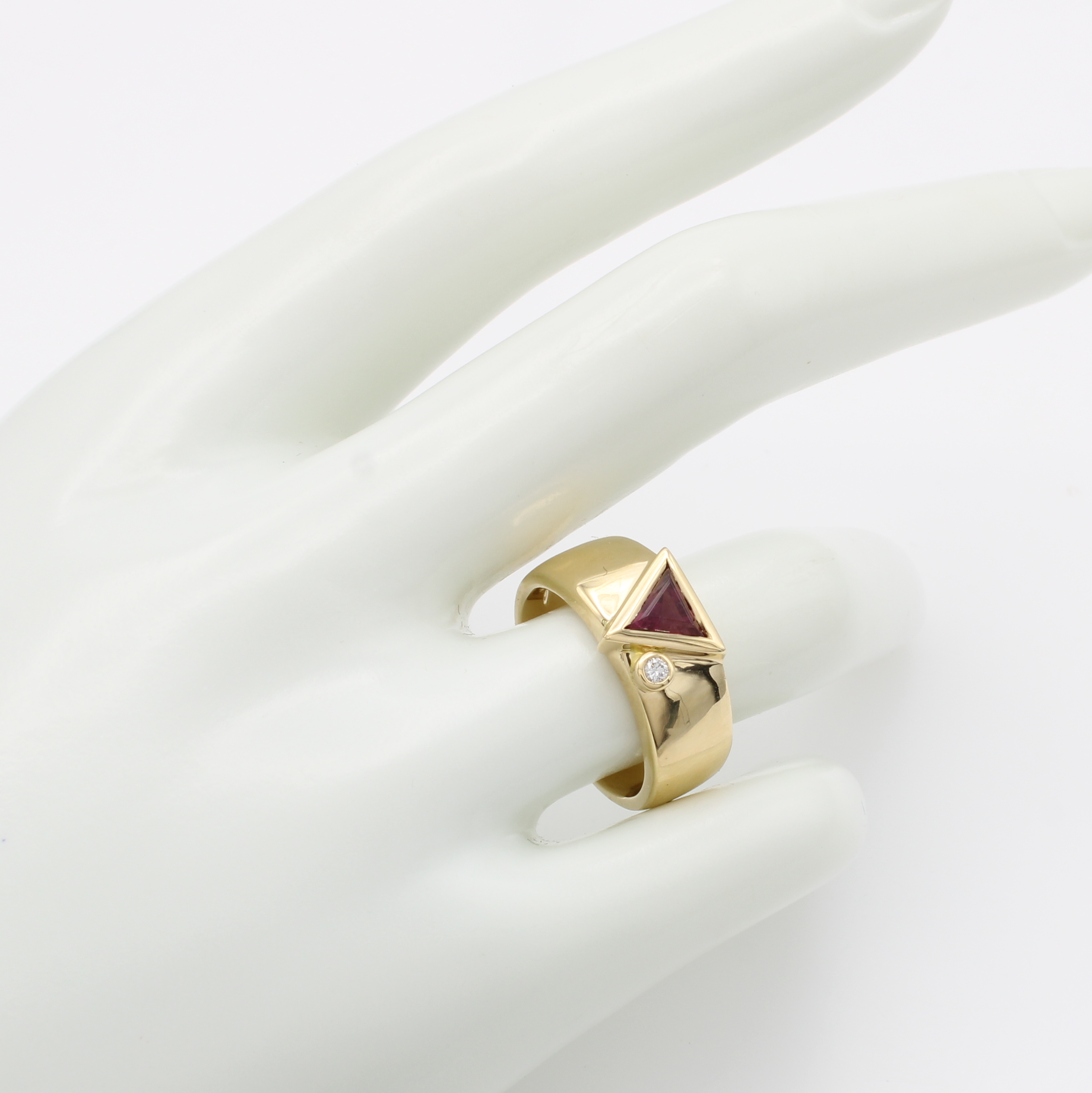Ring mit Turmalin und Brillant, GG 750/000, Brill. ca. 0.03 ct feines Weiß/vs2, rosa Turmalindreieck, massive Ausführung, RW ca. 54 Schätzpreis: 1850, - EUR