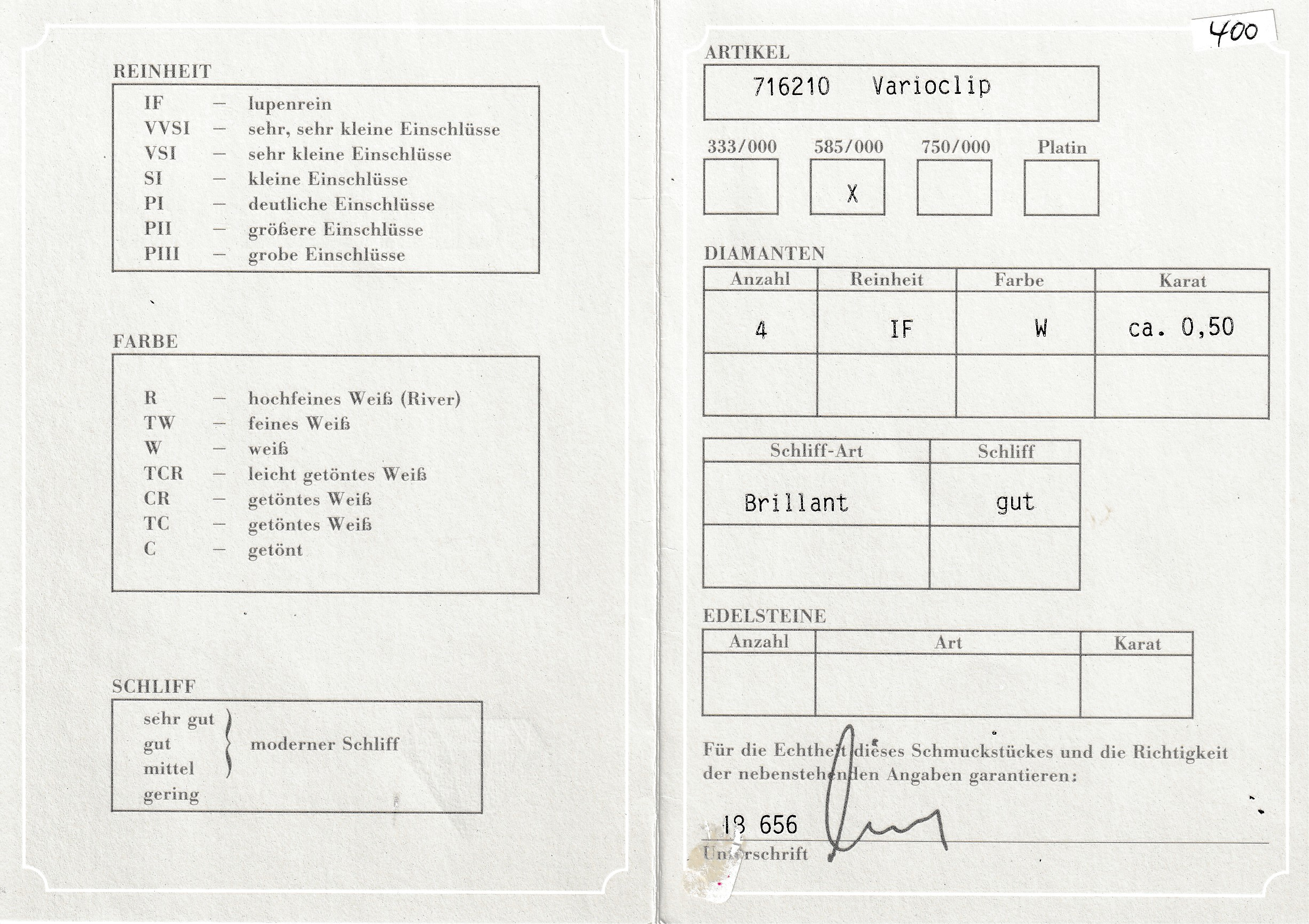 3 Brillanten in Öse zus. ca. 0.18 ct Weiß/vvs, ca. 4 g Schätzpreis: 2400, - EUR