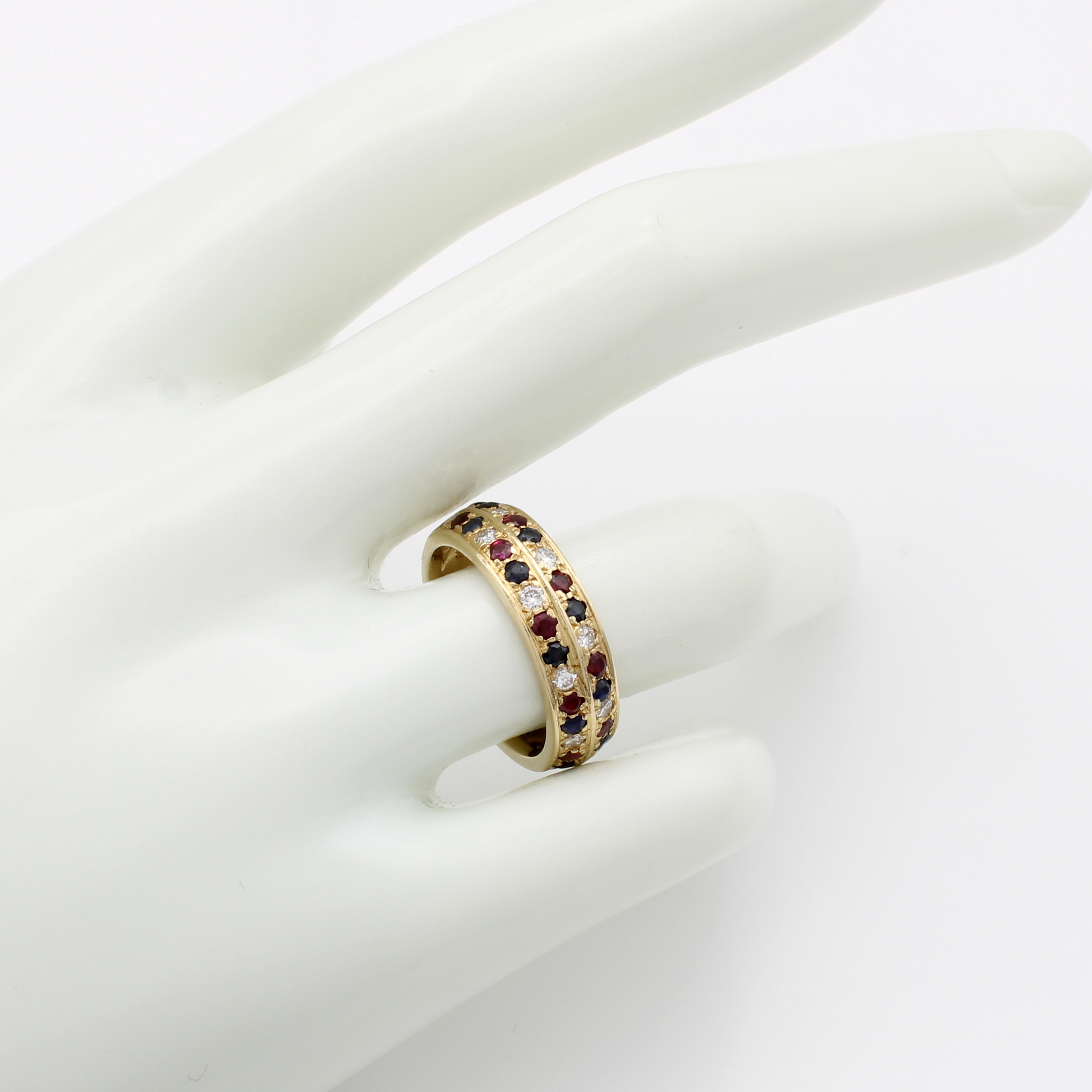 Ring mit Rubinen, Saphiren und Brillanten, GG 585/000, Rubine zus. ca. 0.36 ct, Saphire zus. ca. 0.36 ct u. Brill. zus. ca. 0.36 ct feines Weiß/vs, RW ca. 54 Schätzpreis: 1600, - EUR