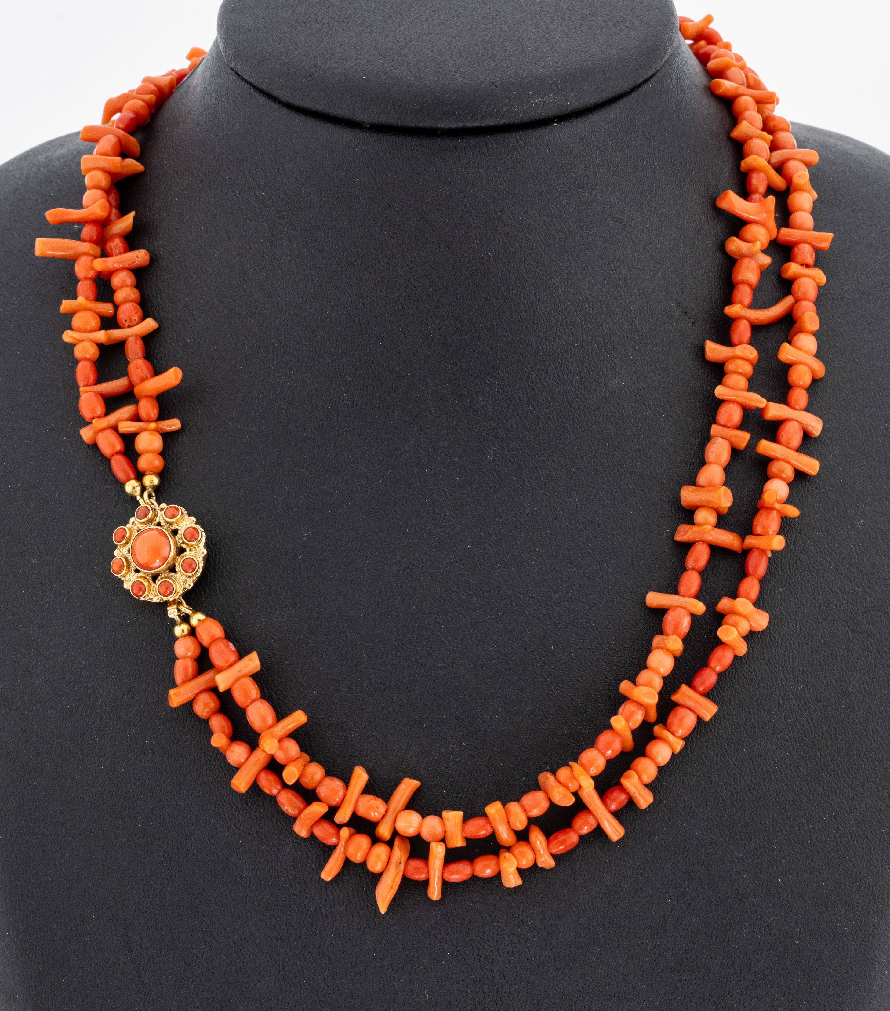 Korallen-Collier mit 14 kt Gold Schließe, GG 585/000, 2 rhg., kl. Korallen-Kugeln