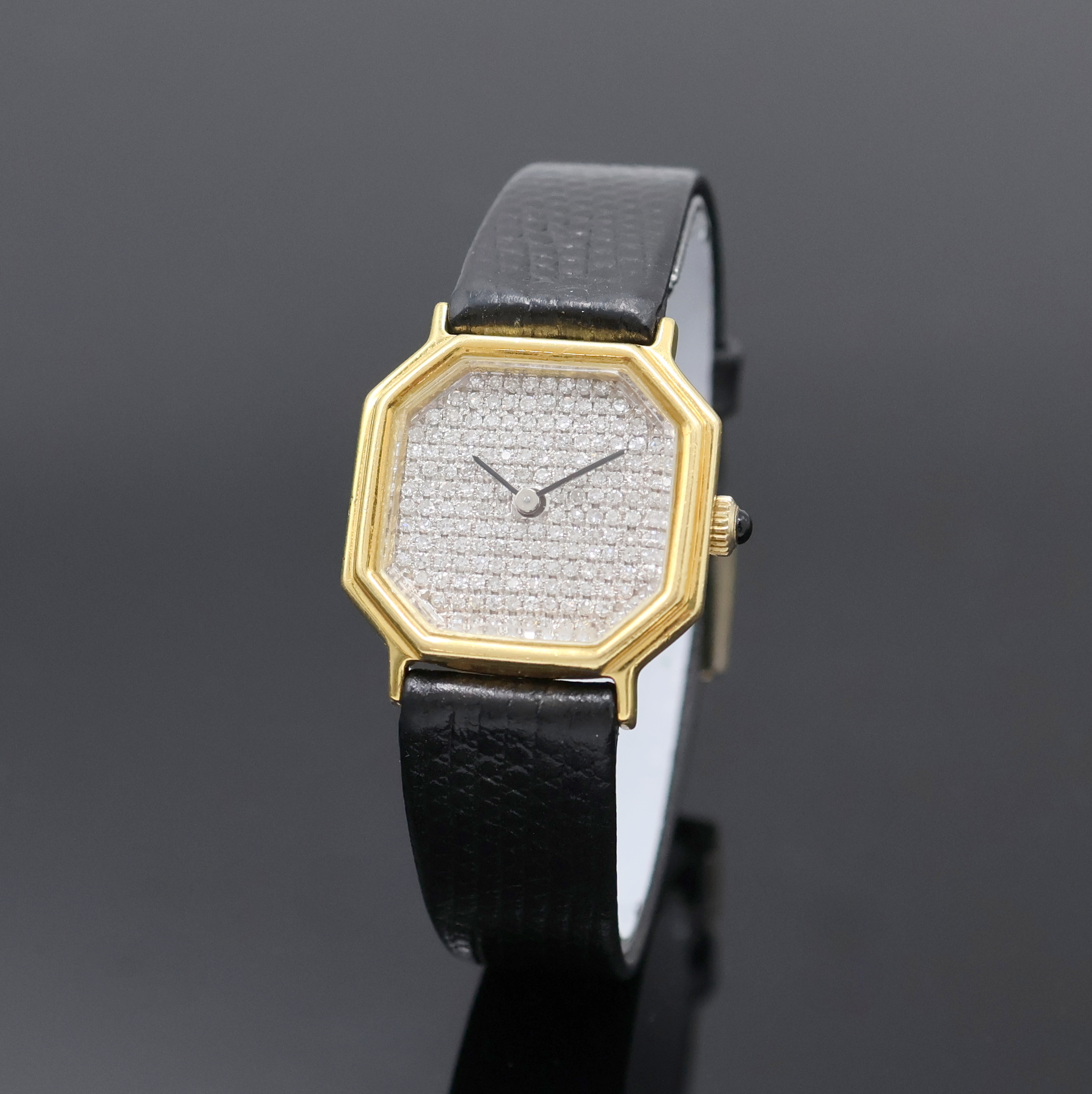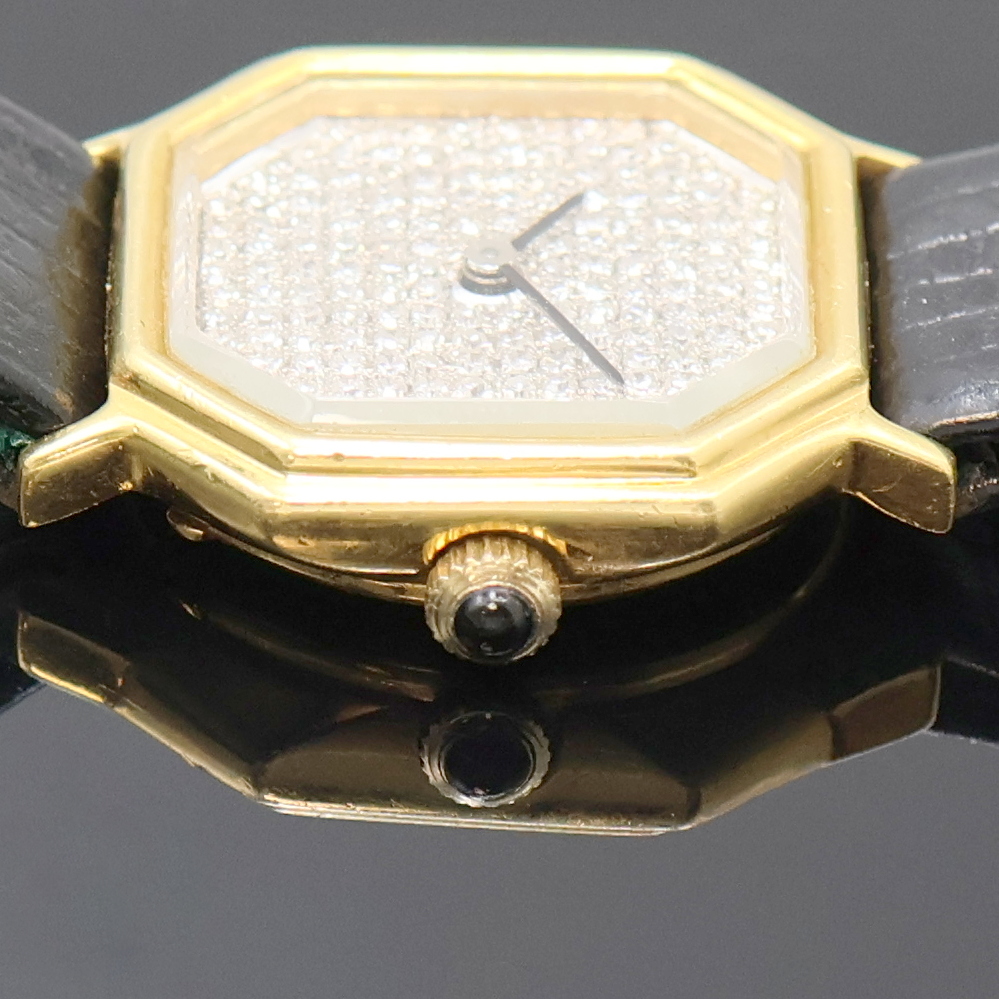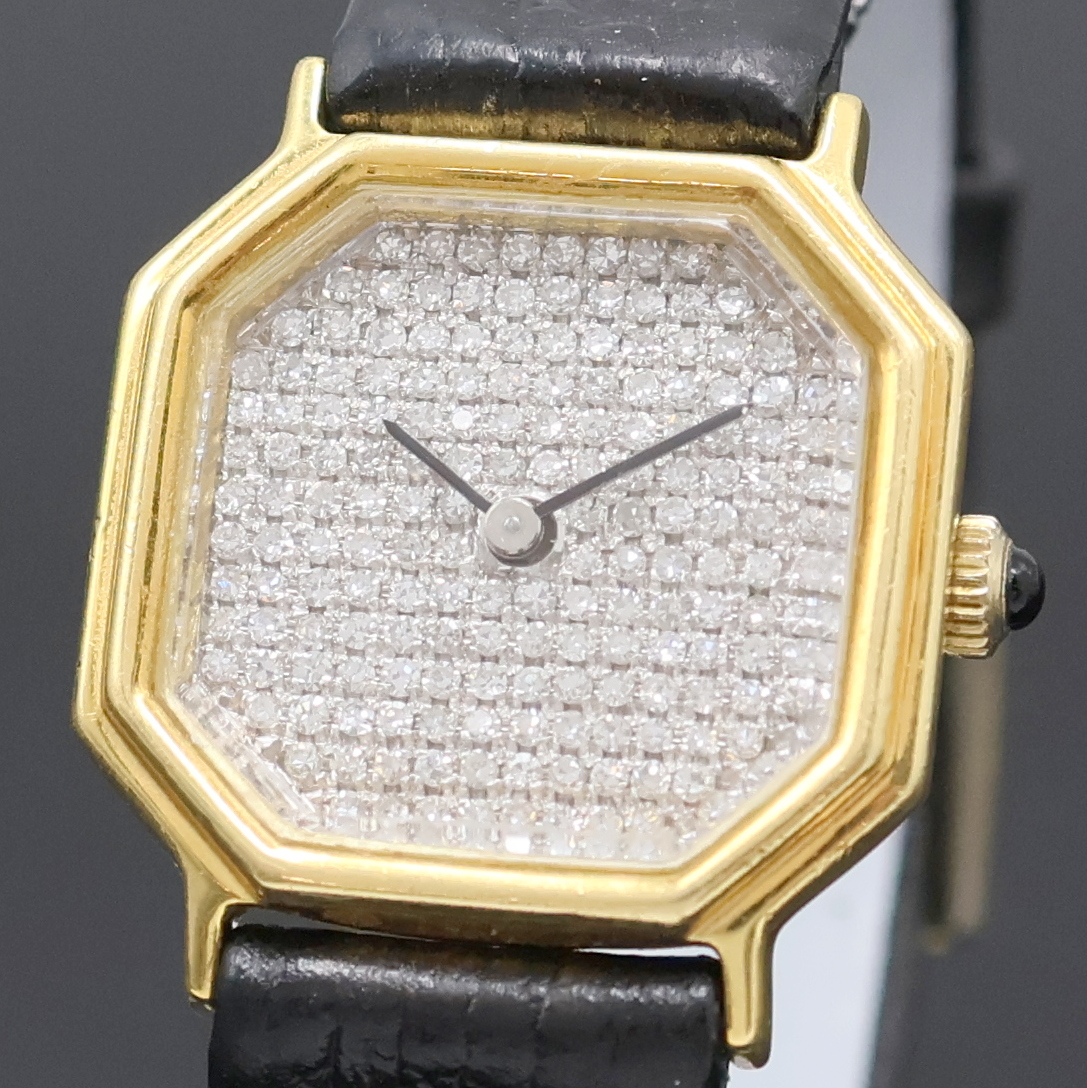 Damenschmuckuhr in GG 750/000, Schweiz um 1975, Handaufzug, Boden aufgedr., Schmuckkrone,