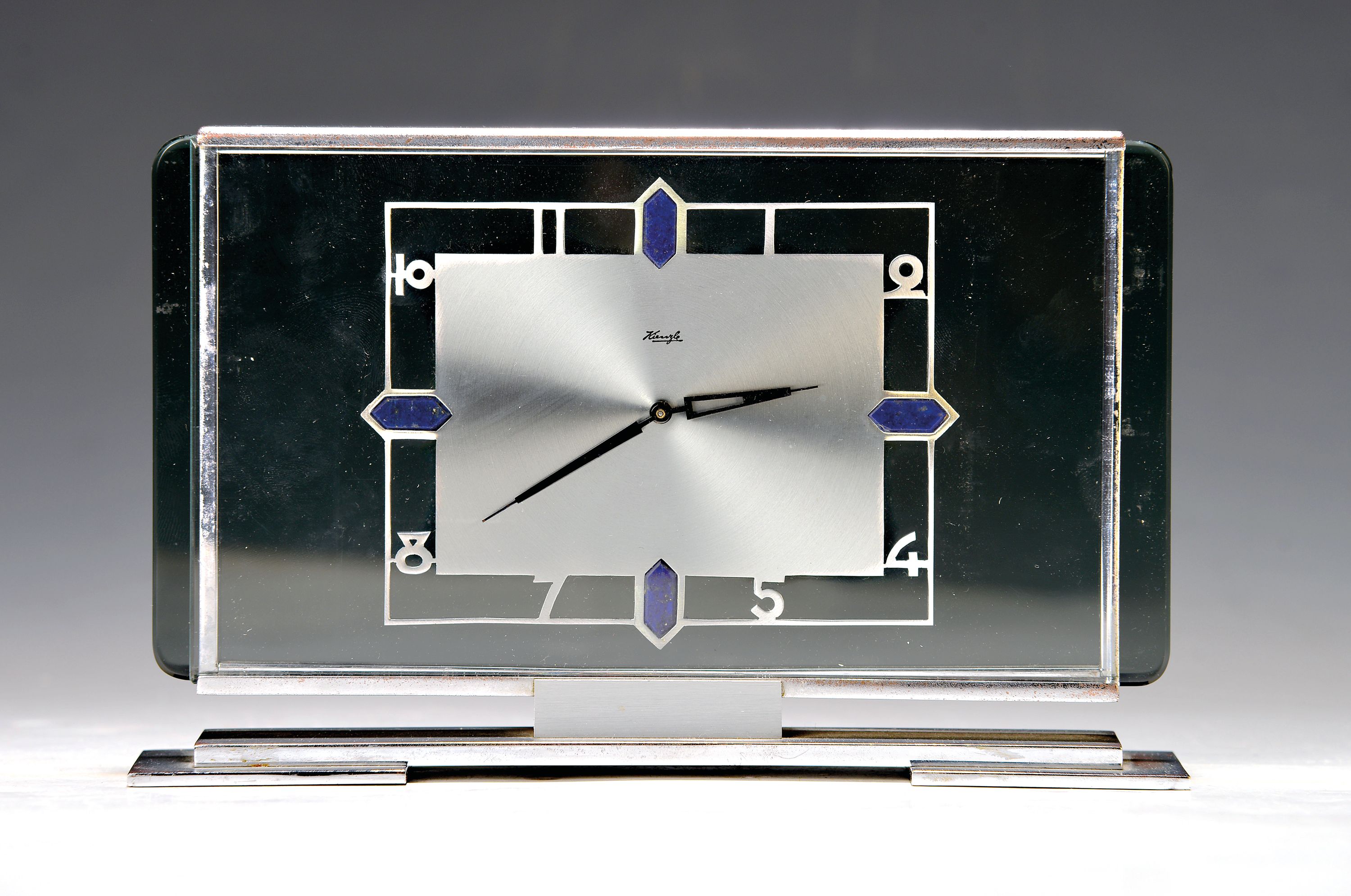 Tischuhr, Kienzle, Entw. Heinrich Möller, um 1935, Metallgehäuse verchromt, Zifferblatt