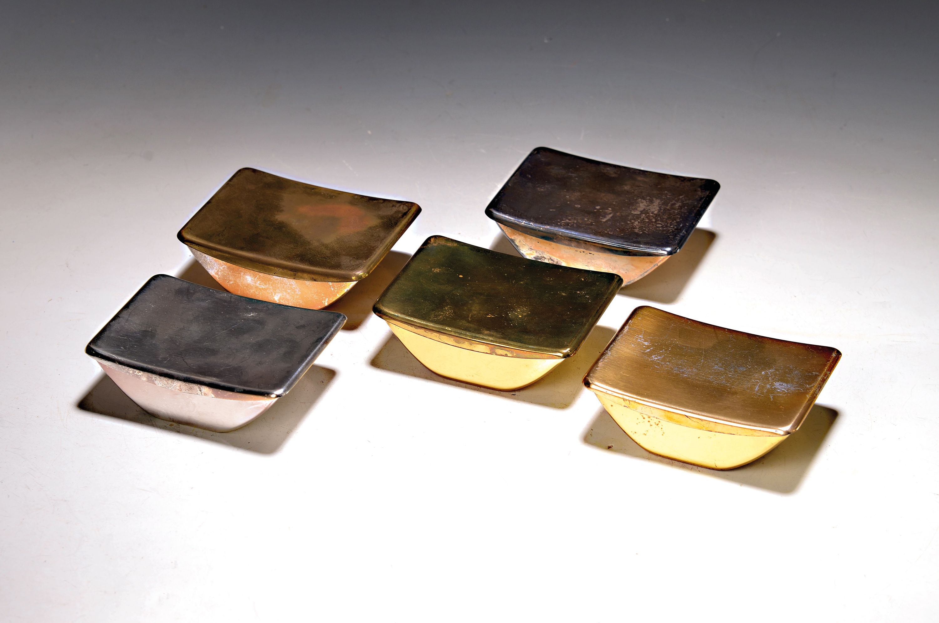 5 Deckeldosen wohl für Zigaretten, Entw. Wilhelm Wagenfeld (1900-1990) für WMF,