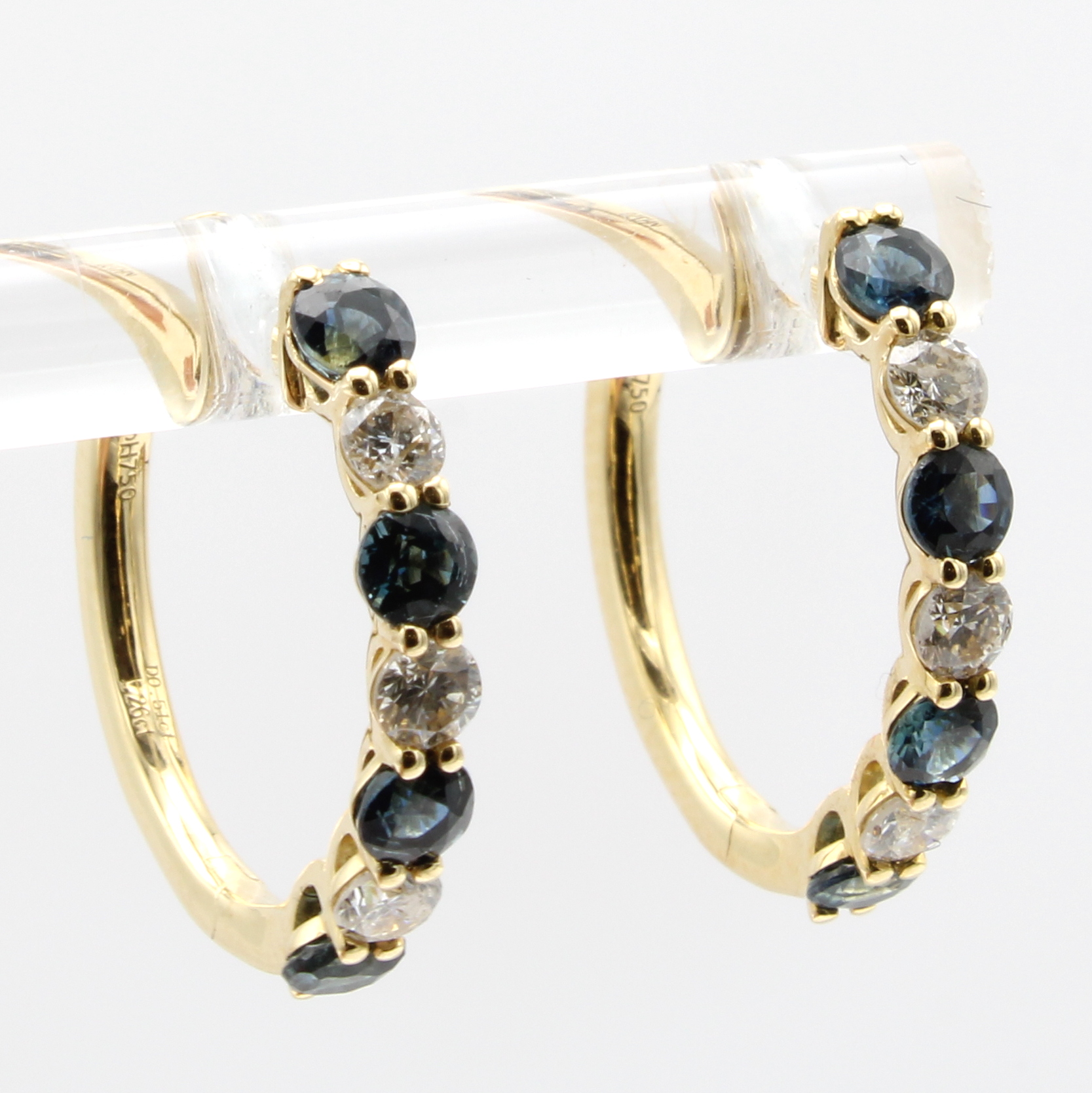 Paar Creolen mit Saphiren und Brillanten, GG 750/000, 8 Saphire zus. ca. 1.26 ct, 6 Brill. zus. ca. 0.51 ct feines Weiß+/vs, D. ca. 1.5 cm Schätzpreis: 2500, - EUR