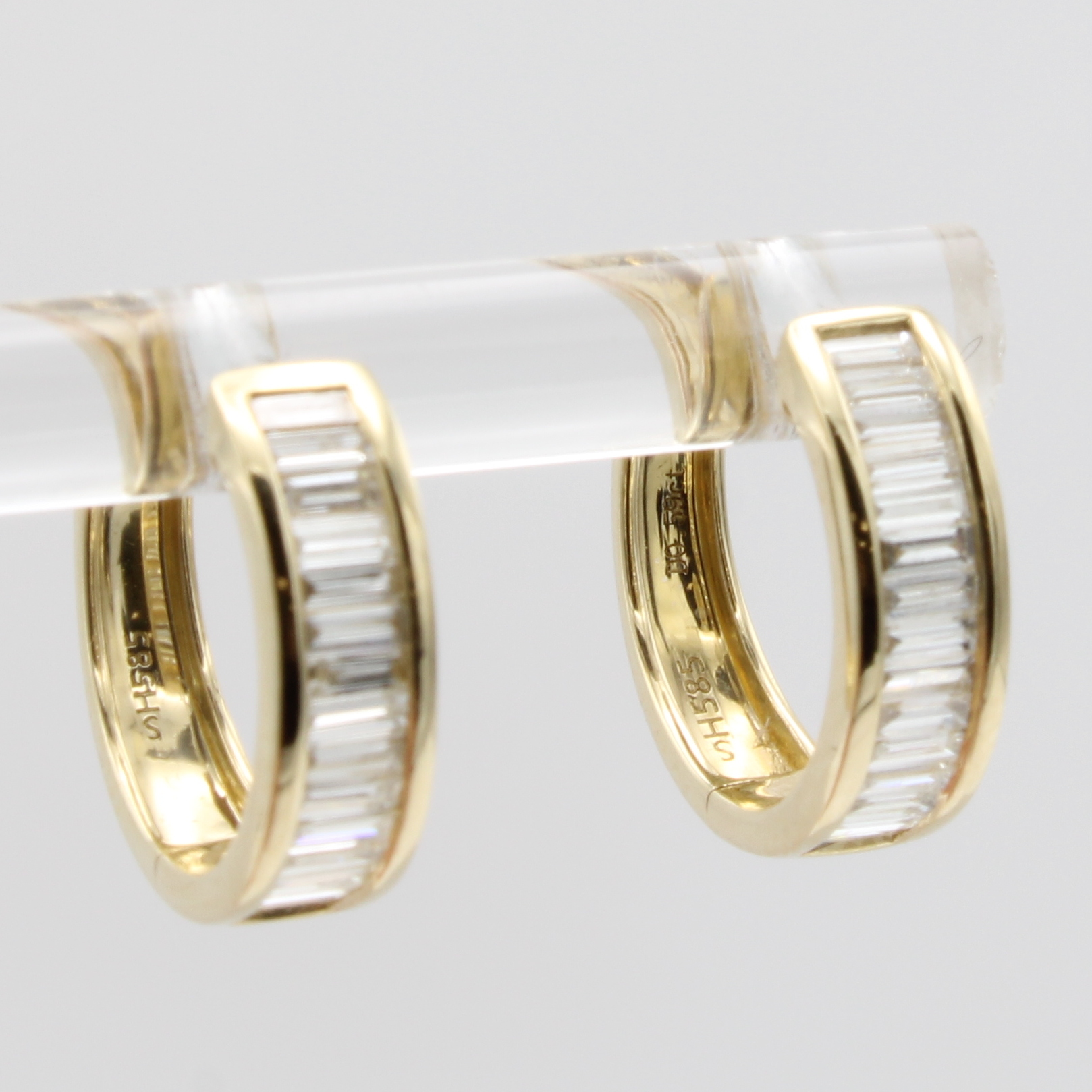 Paar Creolen mit Diamantbaguettes, GG 585/ 000, 30 Diam. zus. ca. 0.59 ct feines Weiß+/ vvs-vs, D. ca. 1.2 cm Schätzpreis: 2190, - EUR