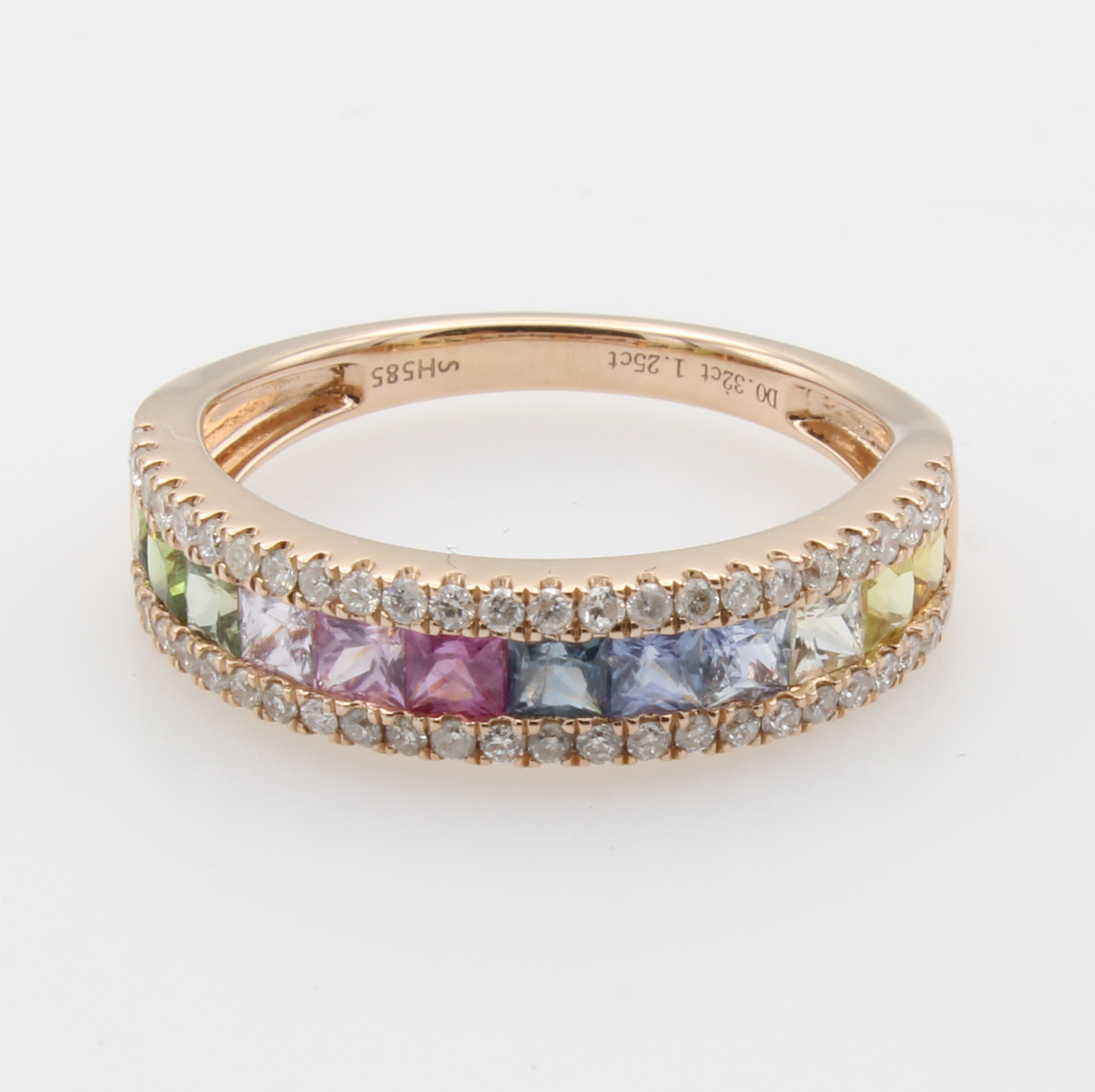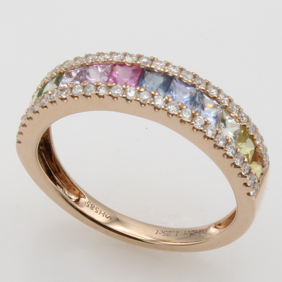 Ring "Rainbow" mit Saphiren und Brillanten, RoséG 585/000, 12 bunte Saphirecarrées zus. ca. 1.25 ct, 50 Brill. zus. ca. 0.32 ct feines Weiß/si-p, RW ca. 55 Schätzpreis: 1670, - EUR