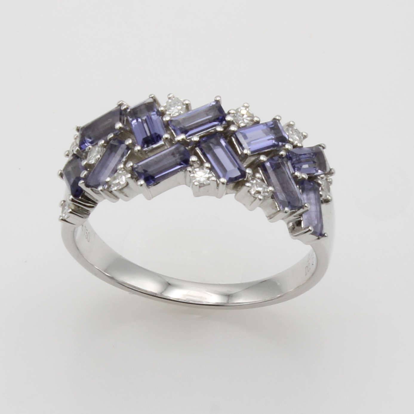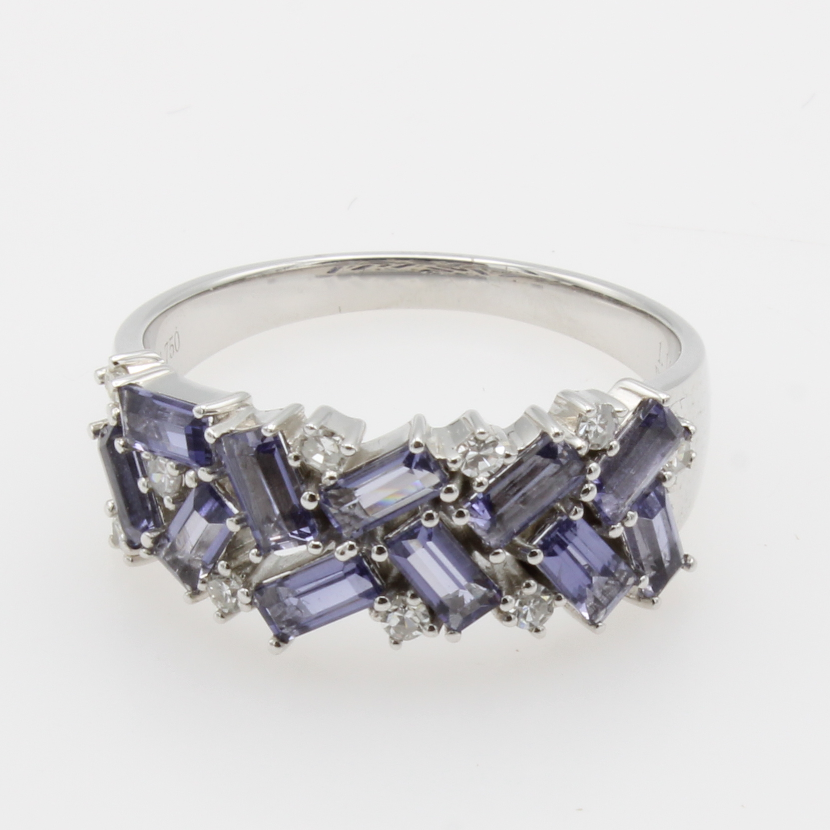 Ring mit Iolithen und Brillanten, WG 750/000, 11 Iolithe zus. ca. 1.14 ct, 10 Brill. zus. ca. 0.15 ct feines Weiß/vs-si, RW ca. 55 Schätzpreis: 1990, - EUR