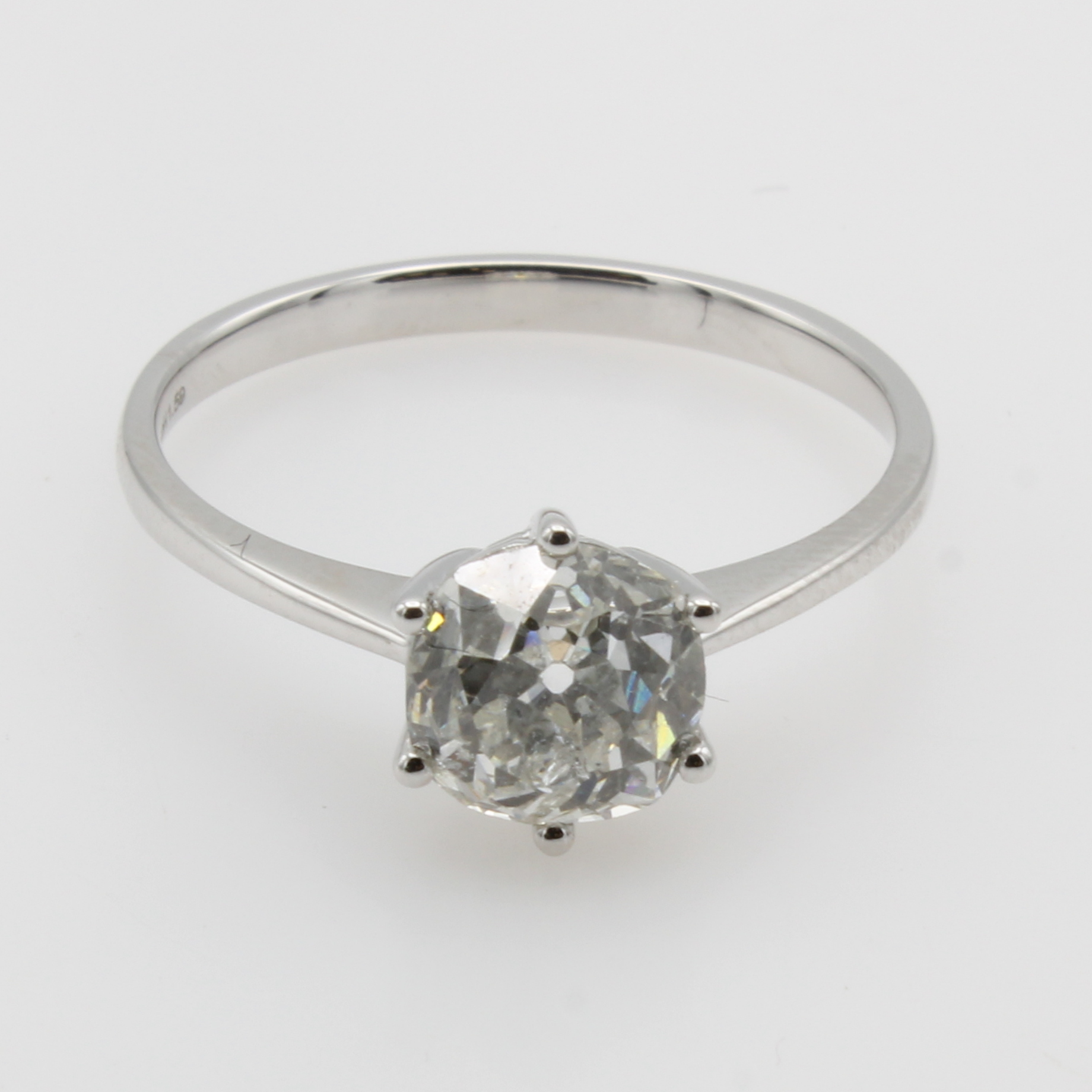 Ring mit Brillantsolitär, WG 750/000, Brill.ca. 1.59 ct feines Weiß/p2 in Krappenfassung, RW ca. 55 Schätzpreis: 4790, - EUR