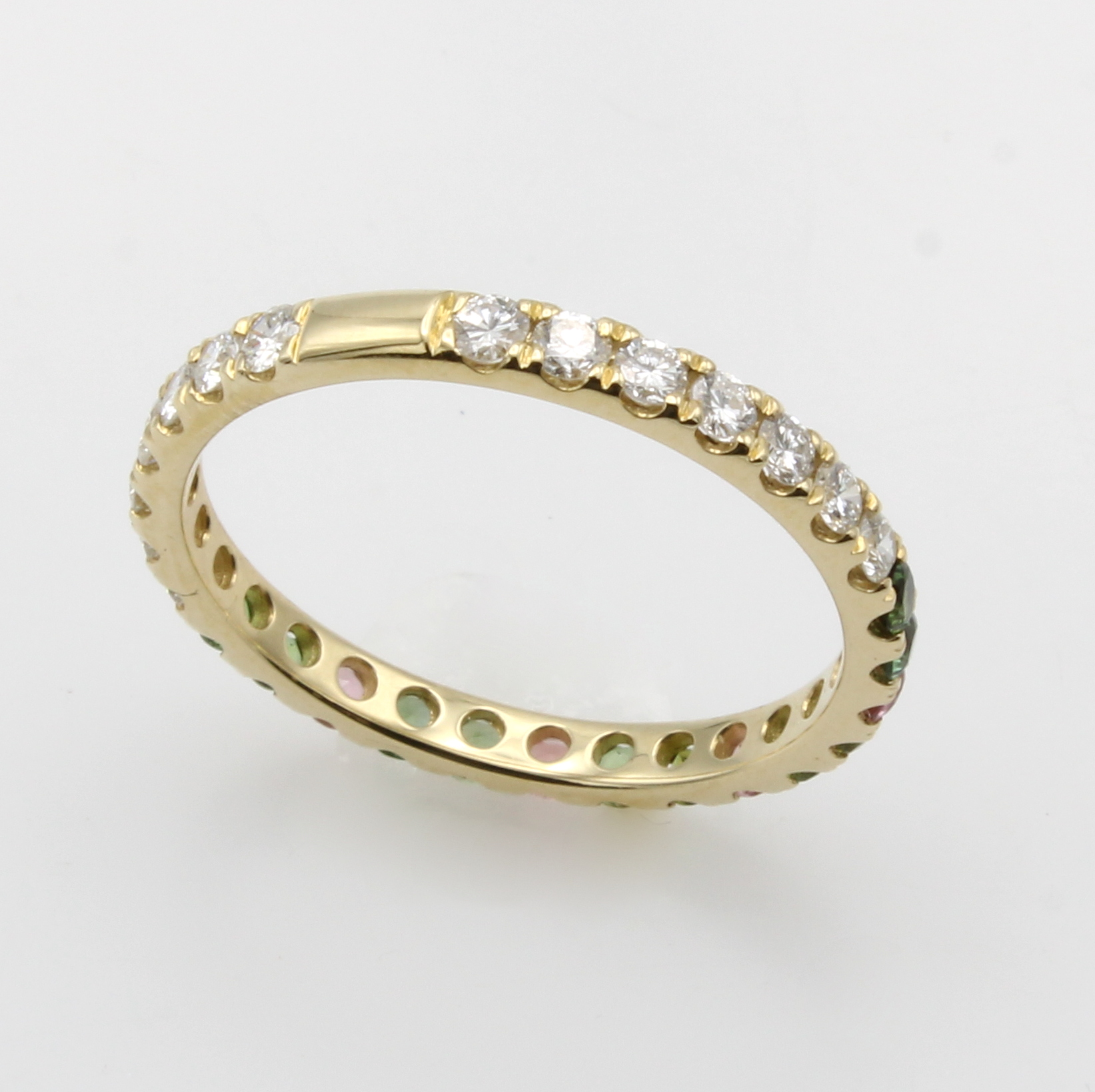 Ring mit Turmalinen und Brillanten, GG 585/ 000, Turmaline in versch. Farben zus. ca. 0.46ct, 14 Brill. zus. ca. 0.40 ct feines Weiß/vs-si, RW ca. 55 Schätzpreis: 1570, - EUR