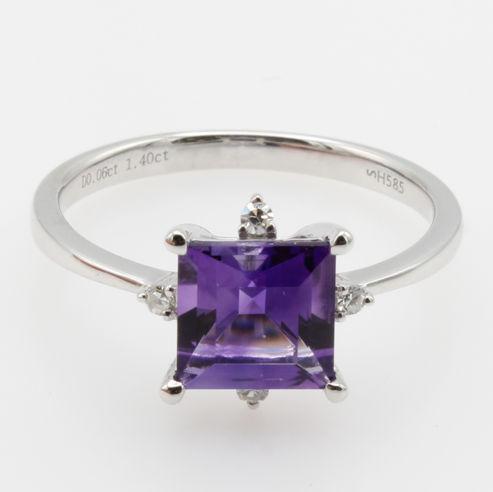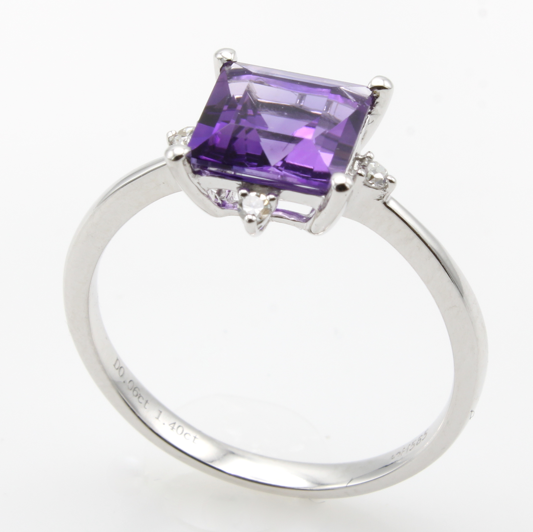 Ring mit Amethyst und Brillanten, WG 585/000, 4 Brill. zus. ca. 0.06 ct Weiß/vs-si, Ame- thyst ca. 1.40 ct, RW ca. 55 Schätzpreis: 1040, - EUR