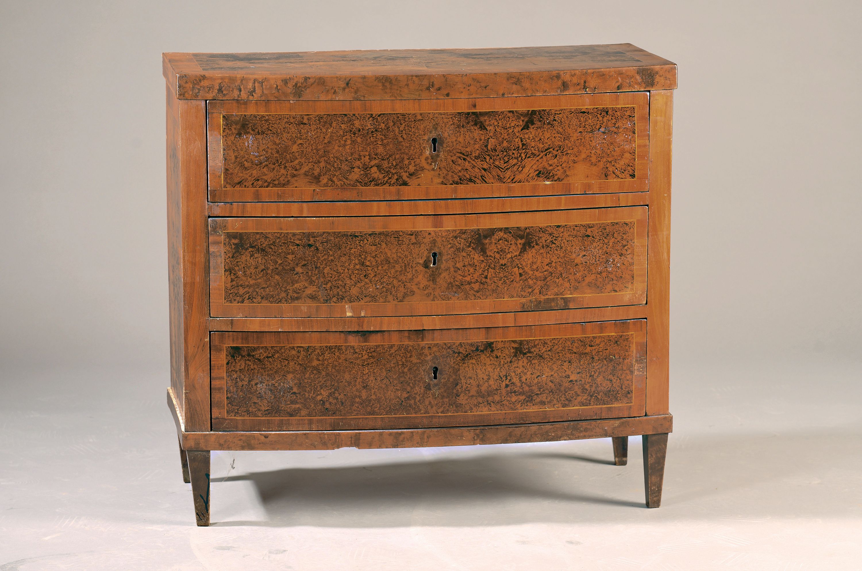 z.T. Wurzelnußfurnier, Bowfront, 3-schübig, 82x90x45 cm, ein Schlüssel, EZ 3