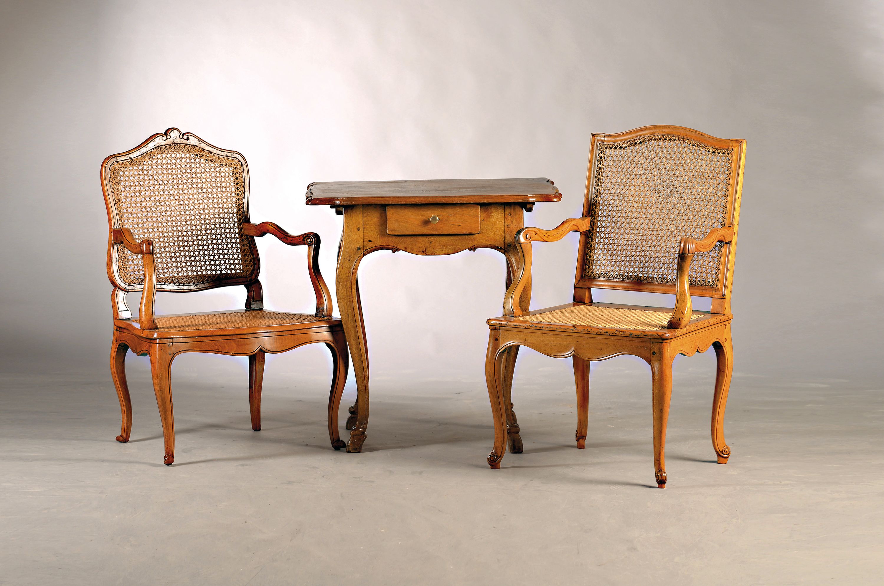 Kleiner Barocktisch und zwei Armlehnstühle, deutsch, um 1760/70, Tisch mit einer