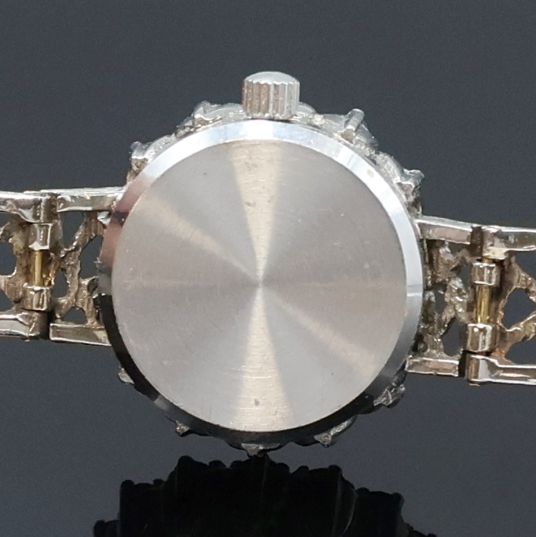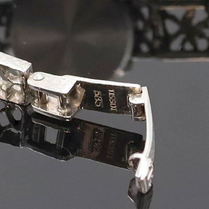 orig. Goldband, Lünette m. Saphiren bes., Boden aufgedr., silb. Zifferbl. m. aufges.