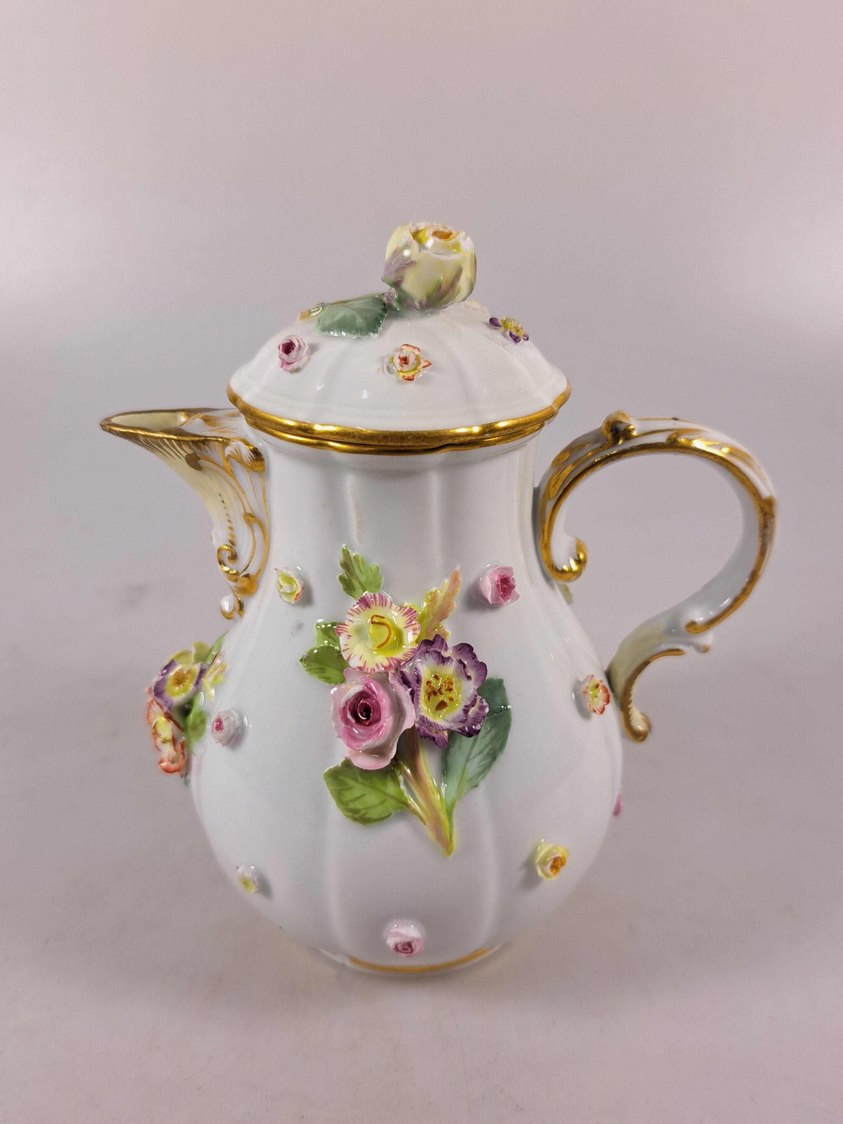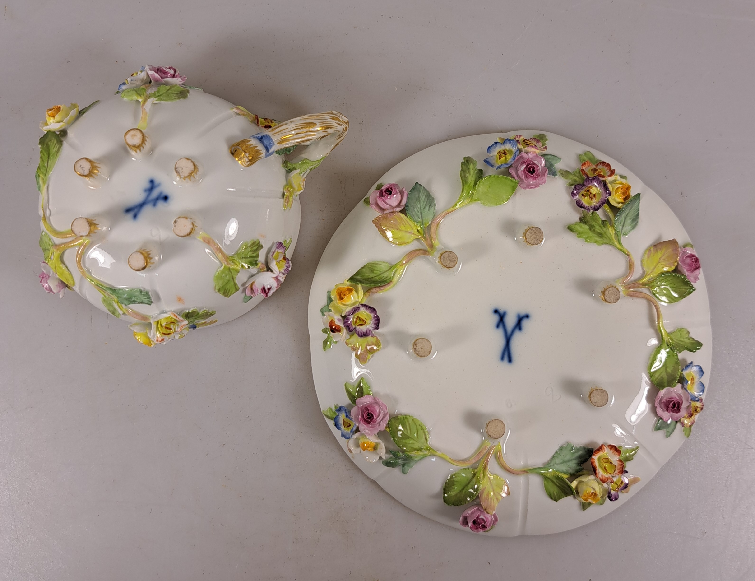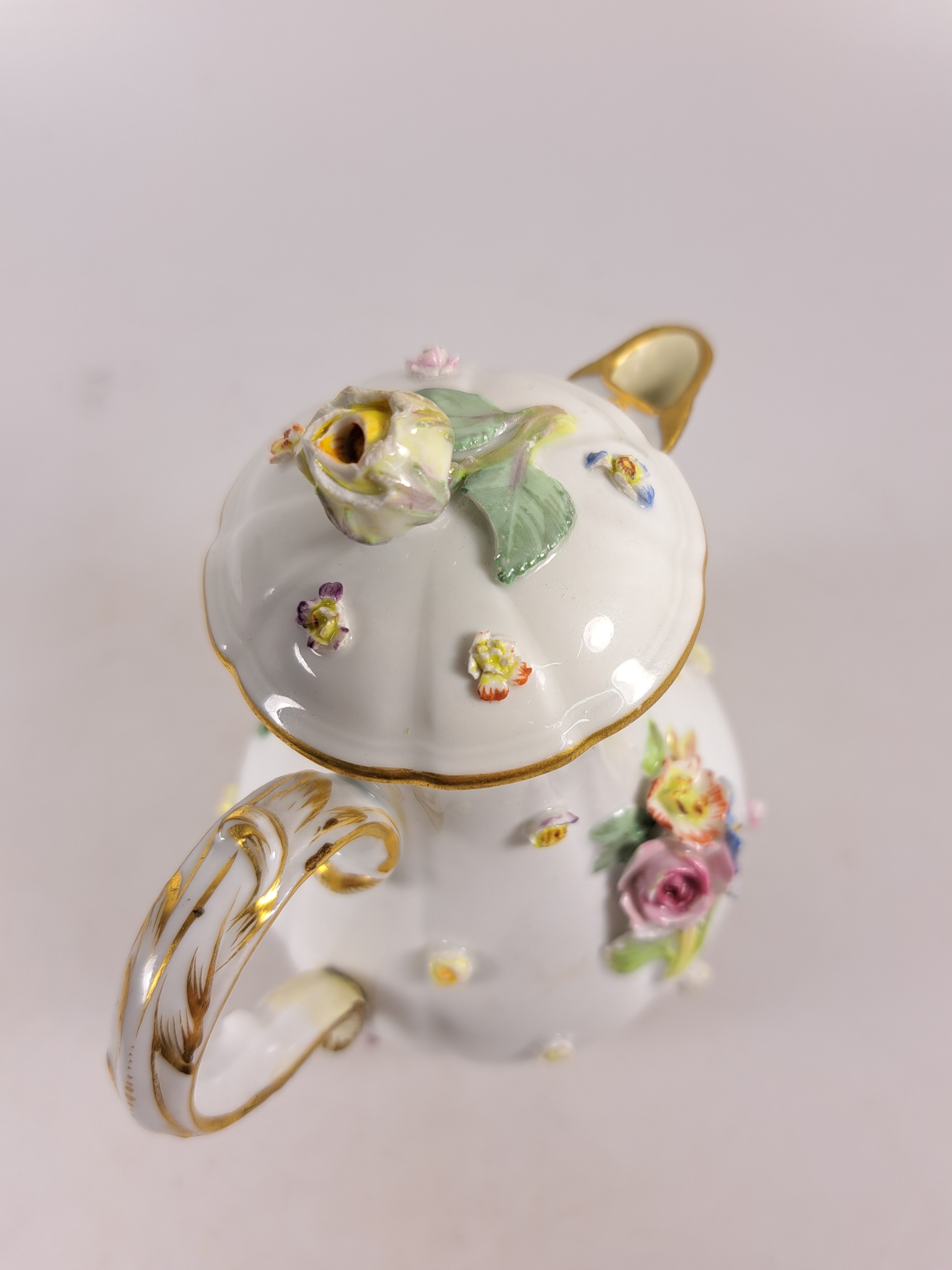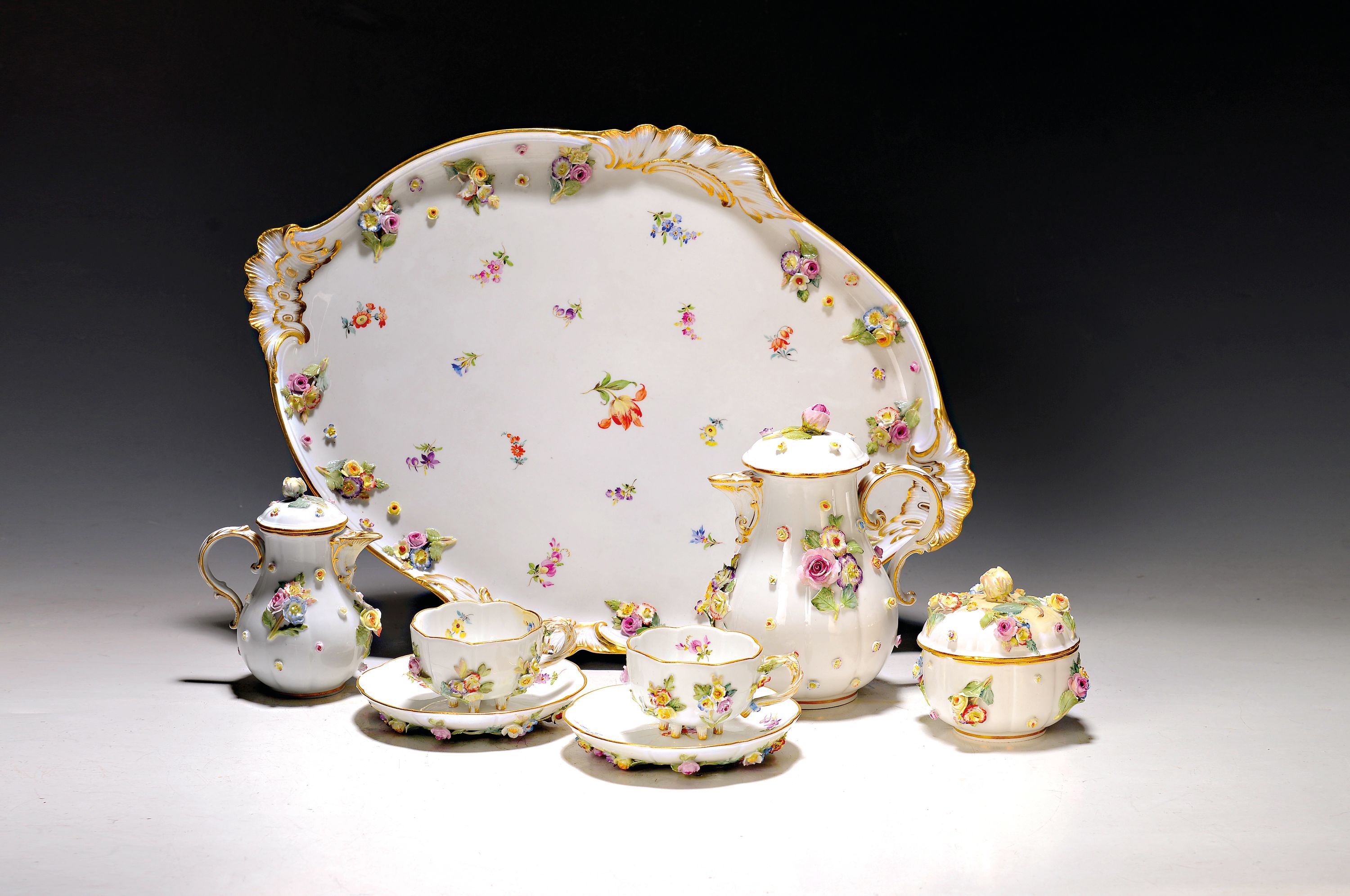 Tete-a-tete, Meissen, Knaufzeit/Anfang 20.Jh., Porzellan, gestreute Blümchen, applizierte Blüten und Blätter mehrfach best., mehrfach restauriert, Tablett, 2 Tassen mit UT, Milchkanne, Zuckerdose und Mokkakännchen mit Deckel