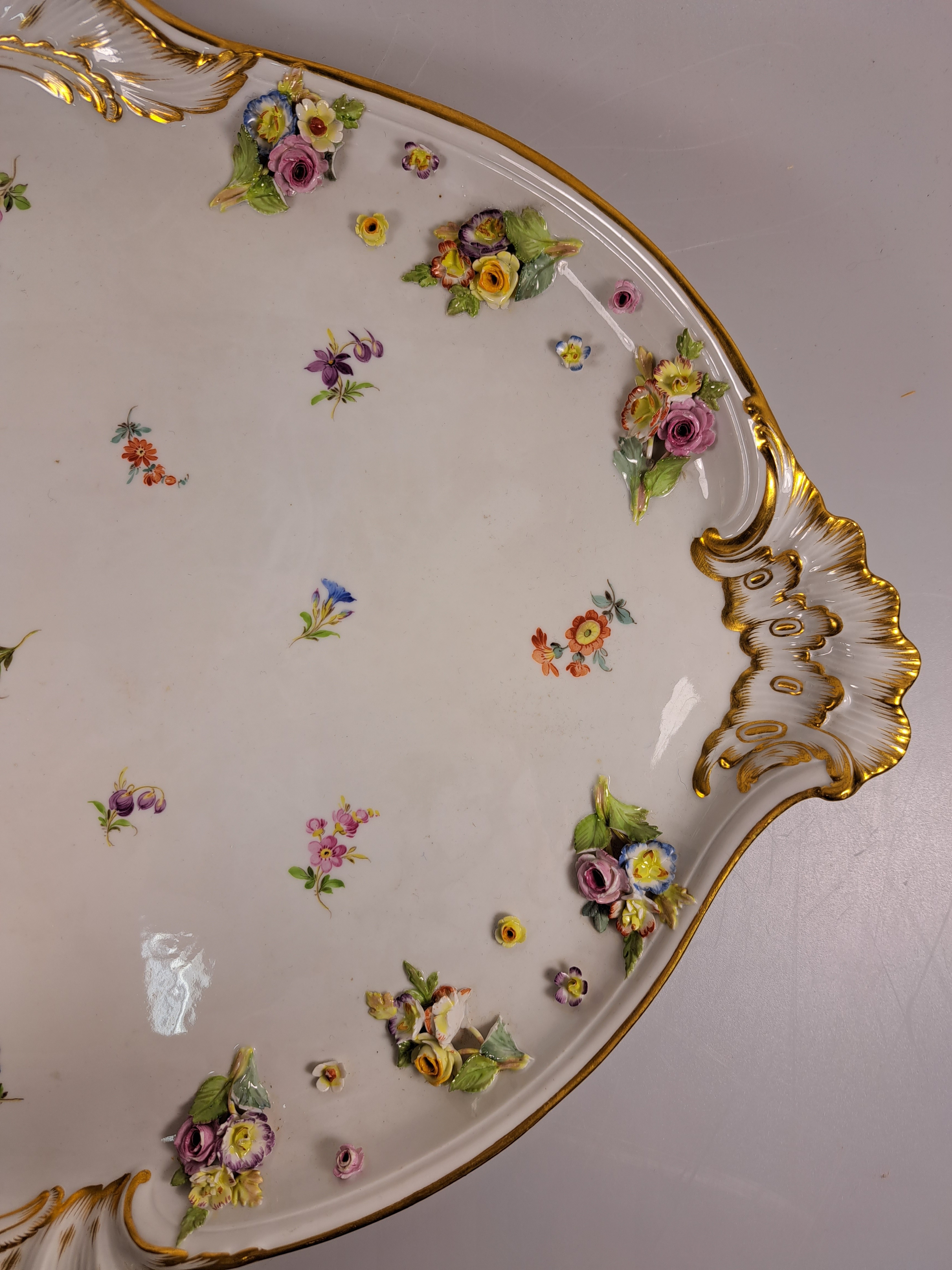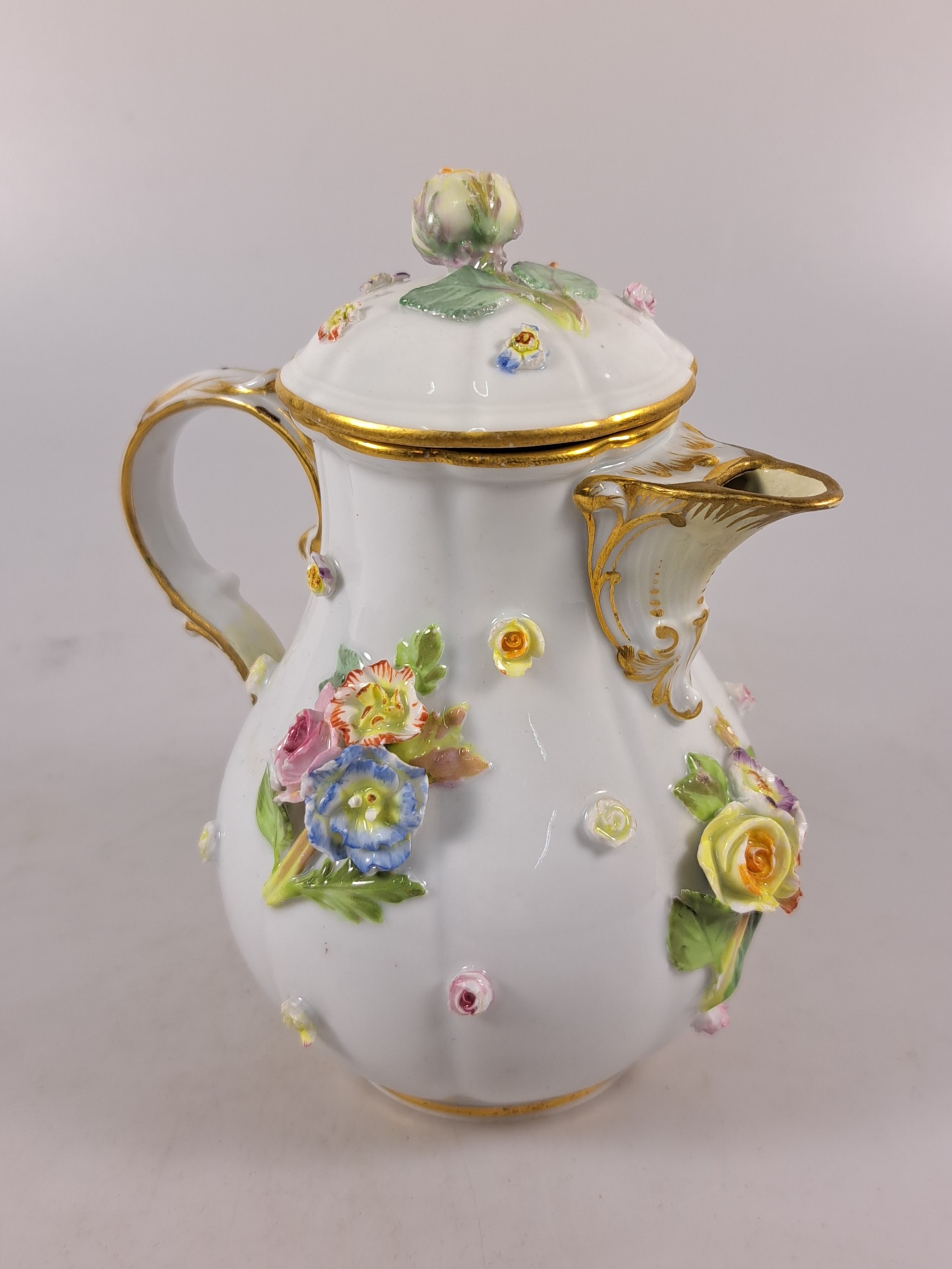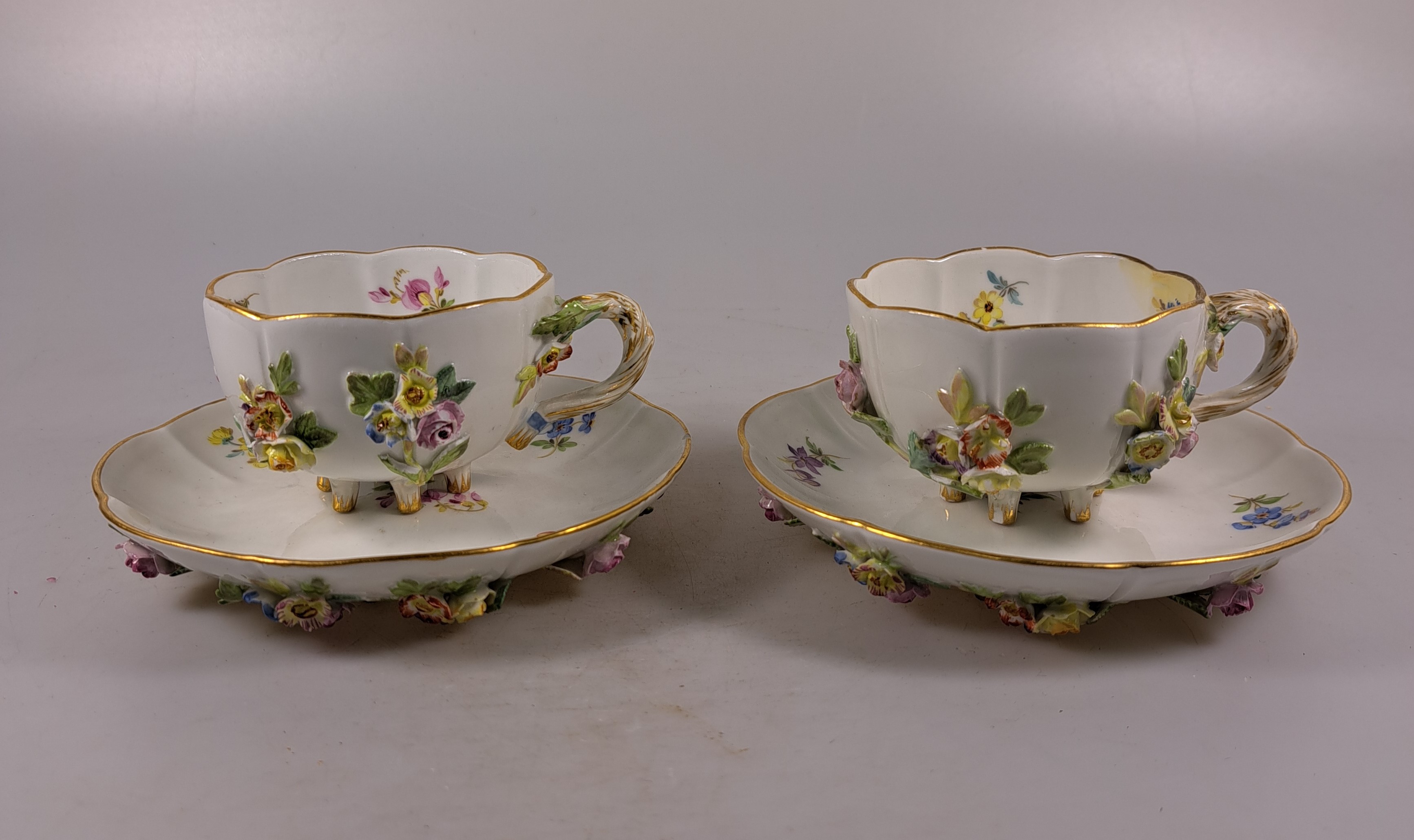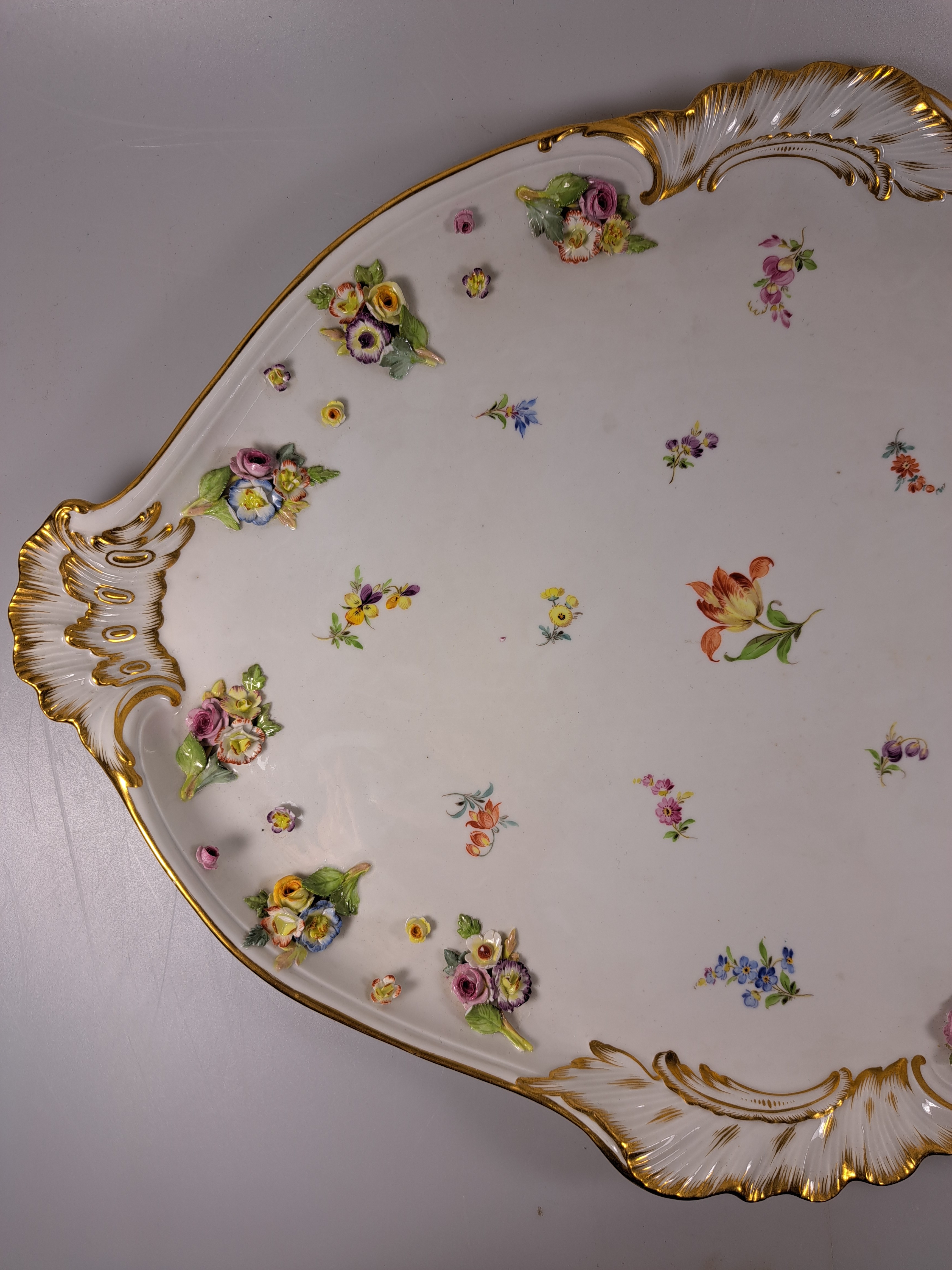 Tete-a-tete, Meissen, Knaufzeit/Anfang 20.Jh., Porzellan, gestreute Blümchen, applizierte Blüten und Blätter mehrfach best., mehrfach restauriert, Tablett, 2 Tassen mit UT, Milchkanne, Zuckerdose und Mokkakännchen mit Deckel