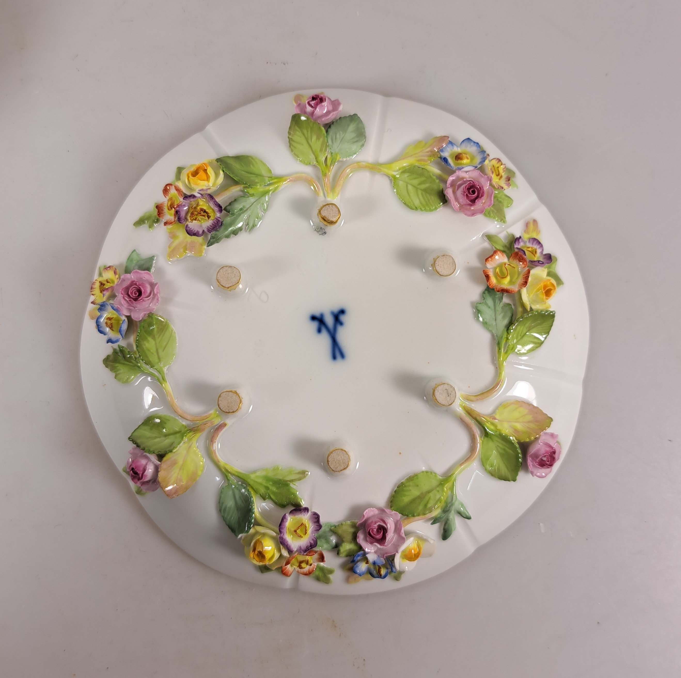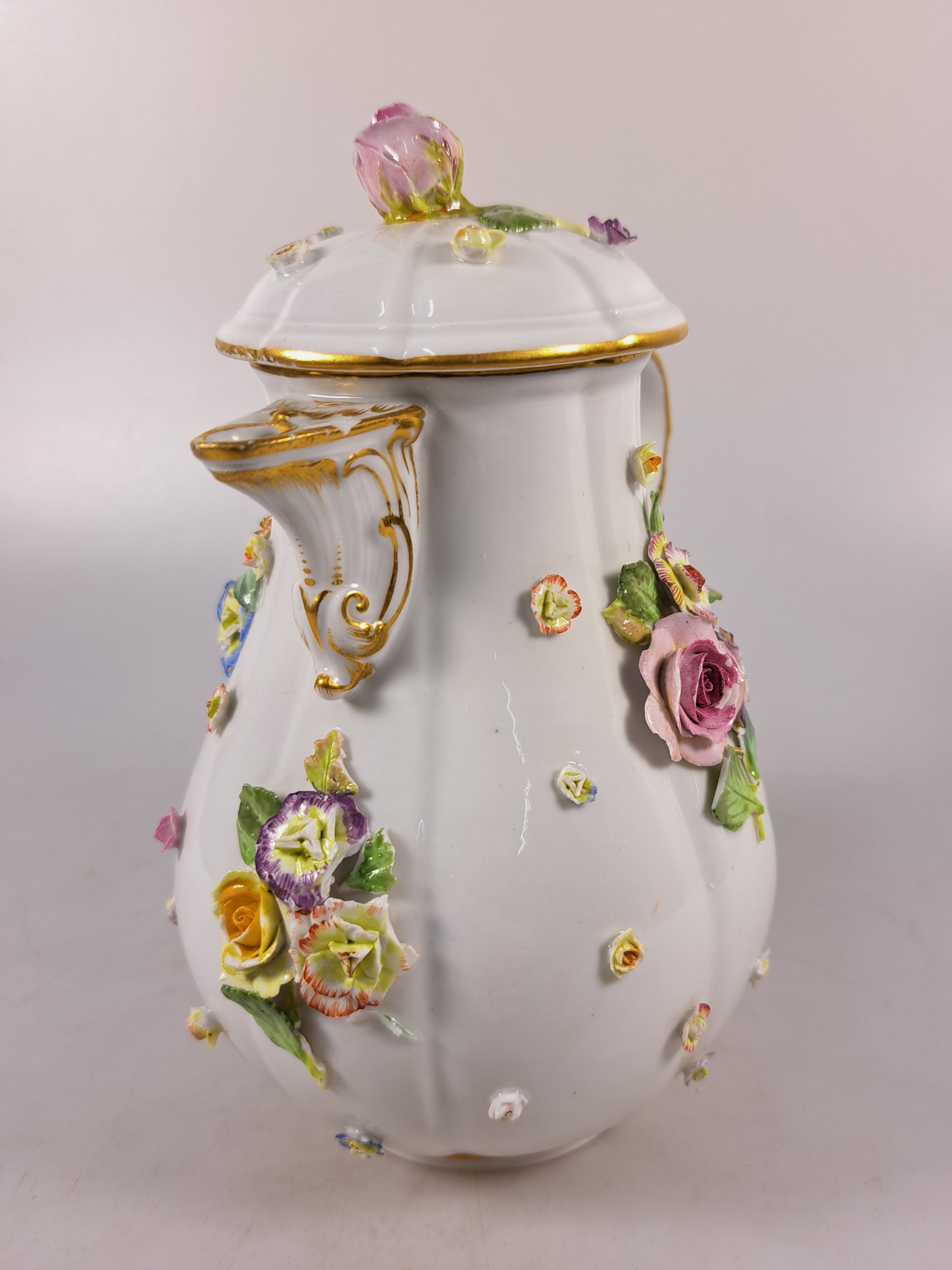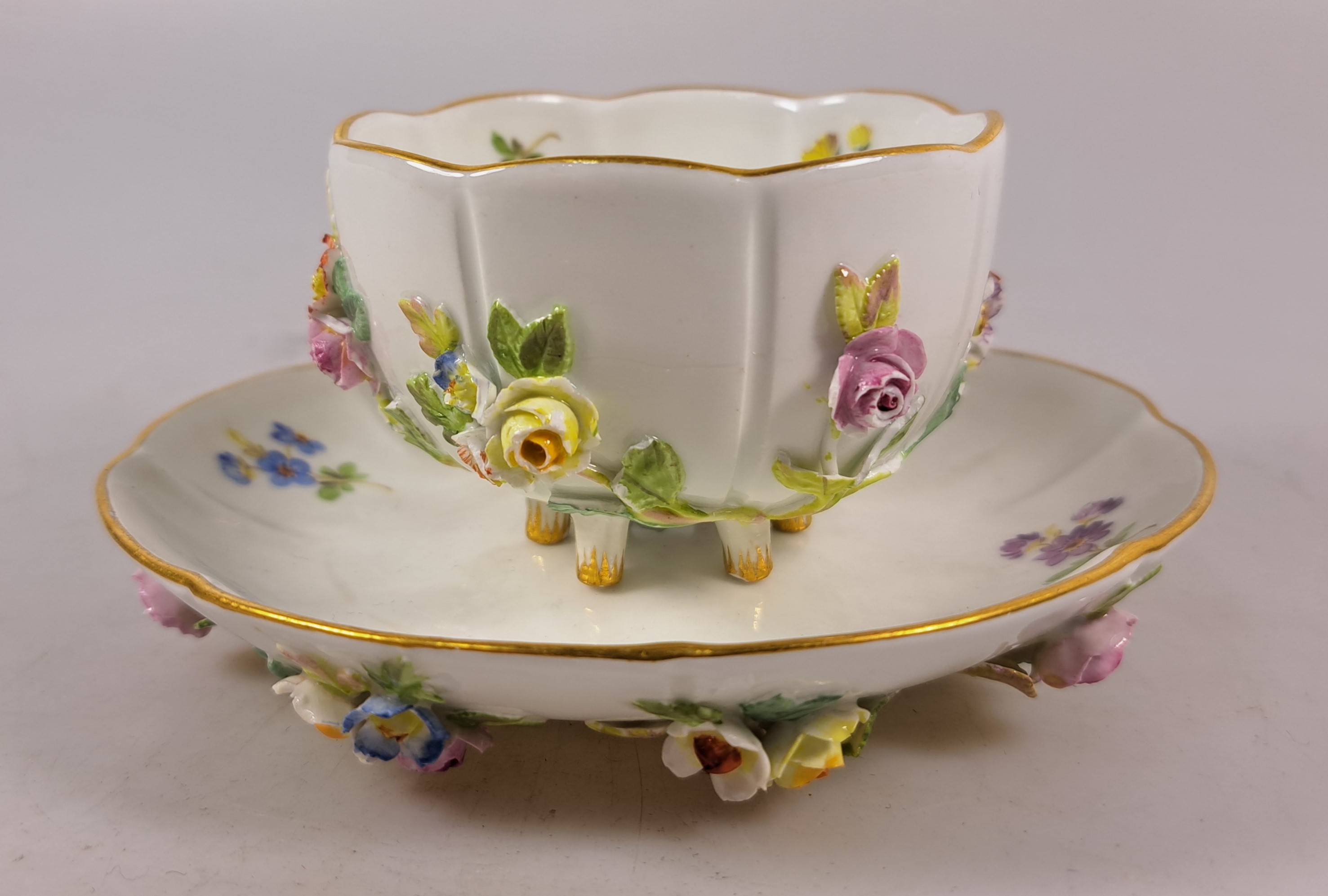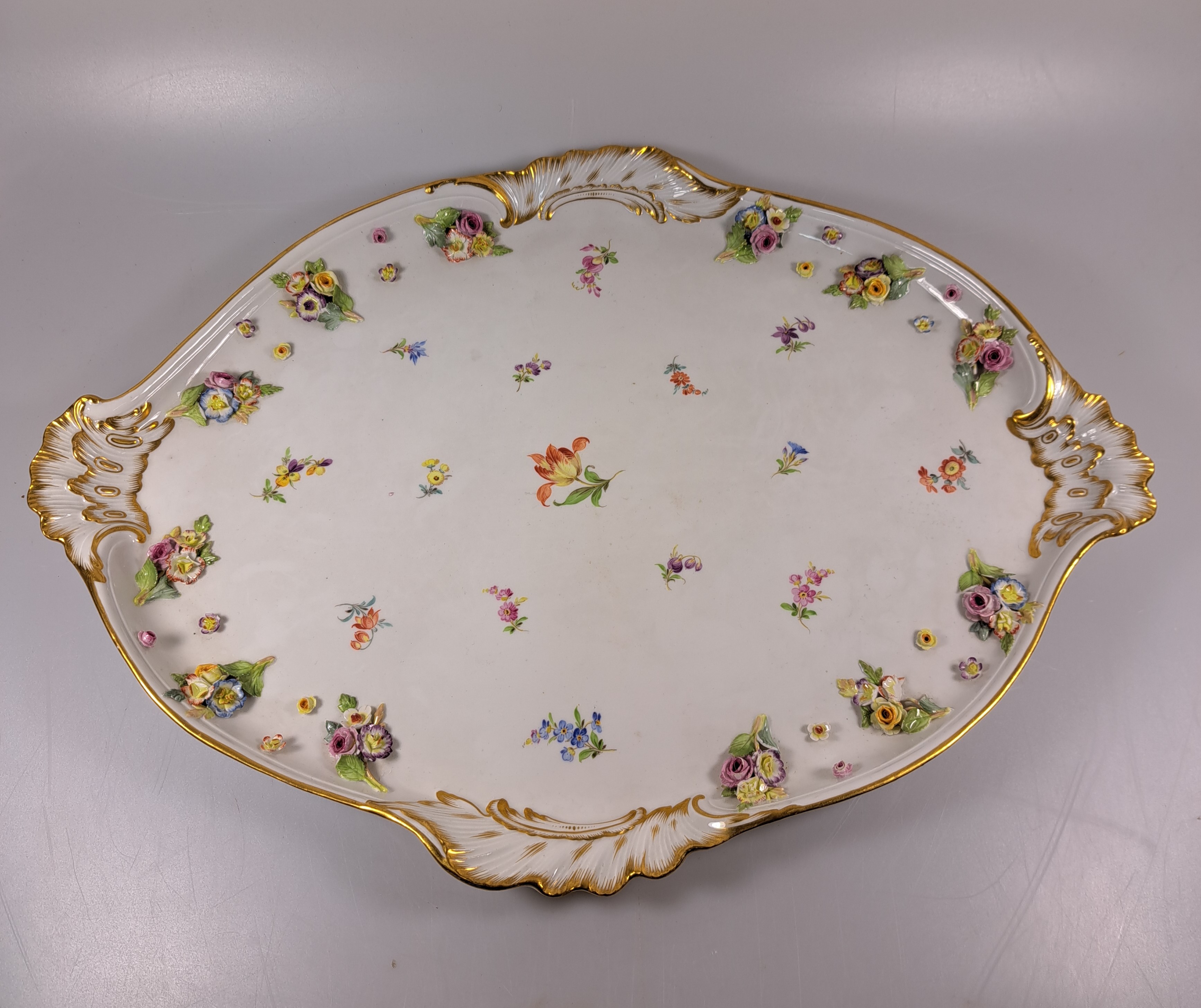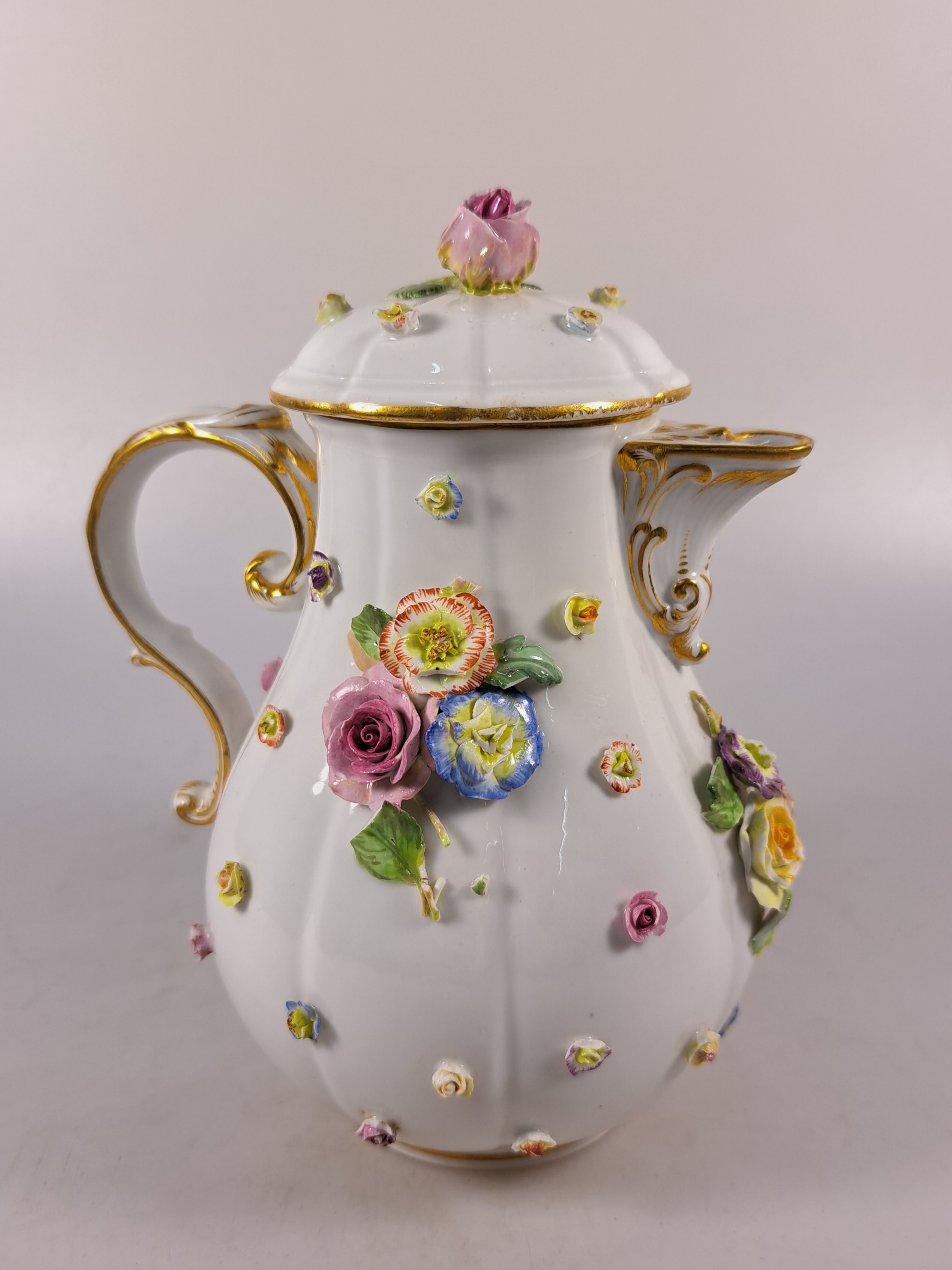 Tete-a-tete, Meissen, Knaufzeit/Anfang 20.Jh., Porzellan, gestreute Blümchen, applizierte Blüten und Blätter mehrfach best., mehrfach restauriert, Tablett, 2 Tassen mit UT, Milchkanne, Zuckerdose und Mokkakännchen mit Deckel