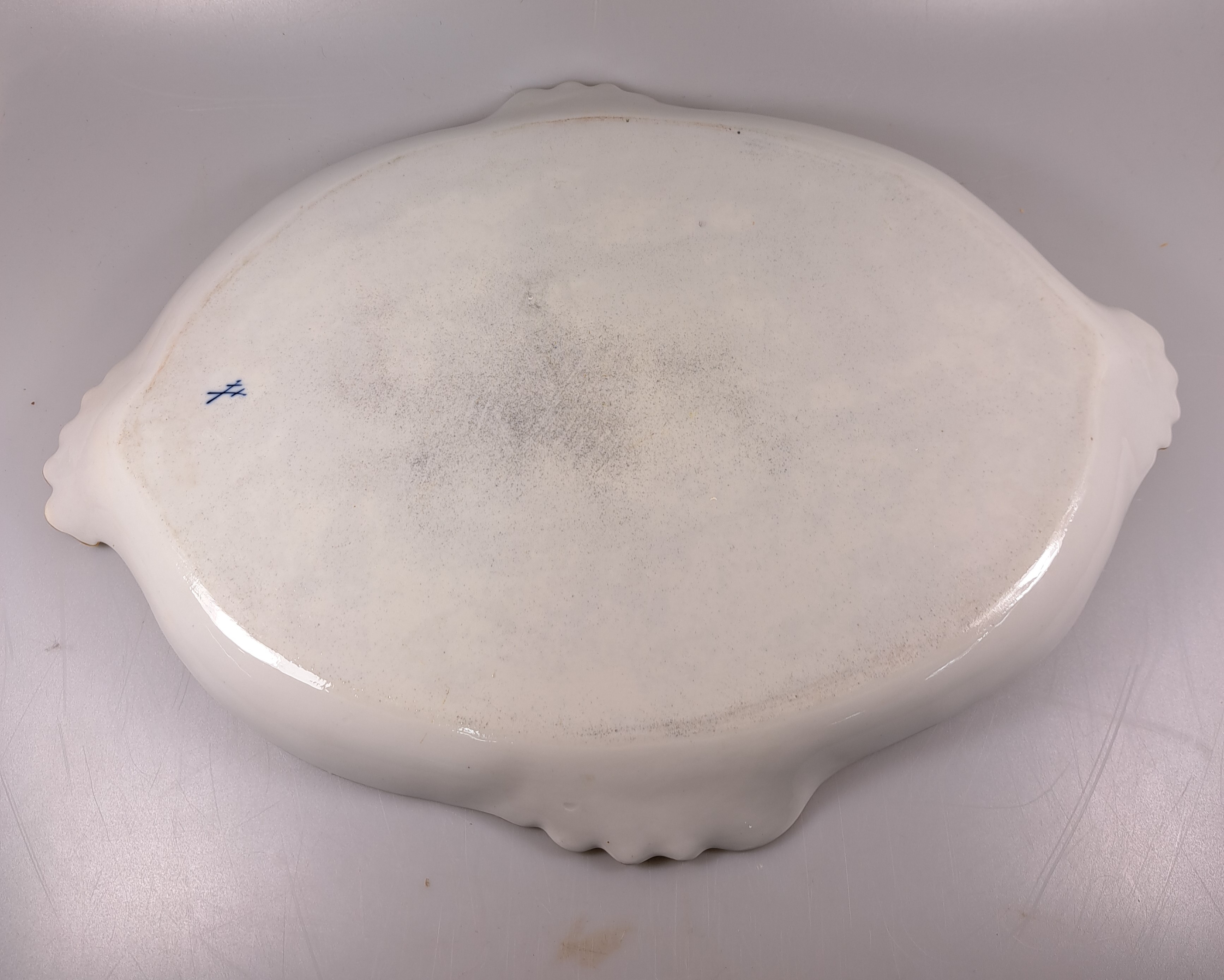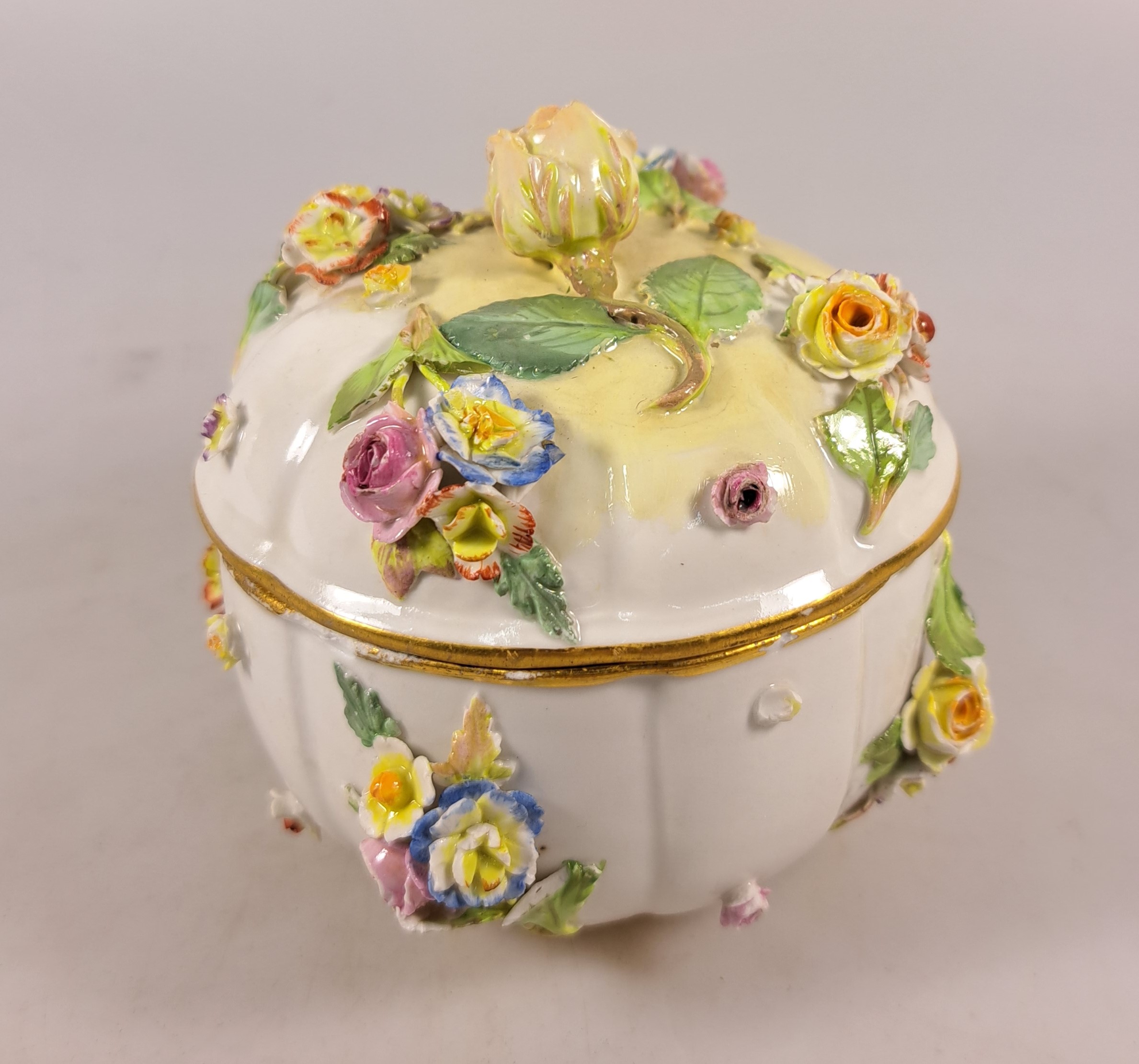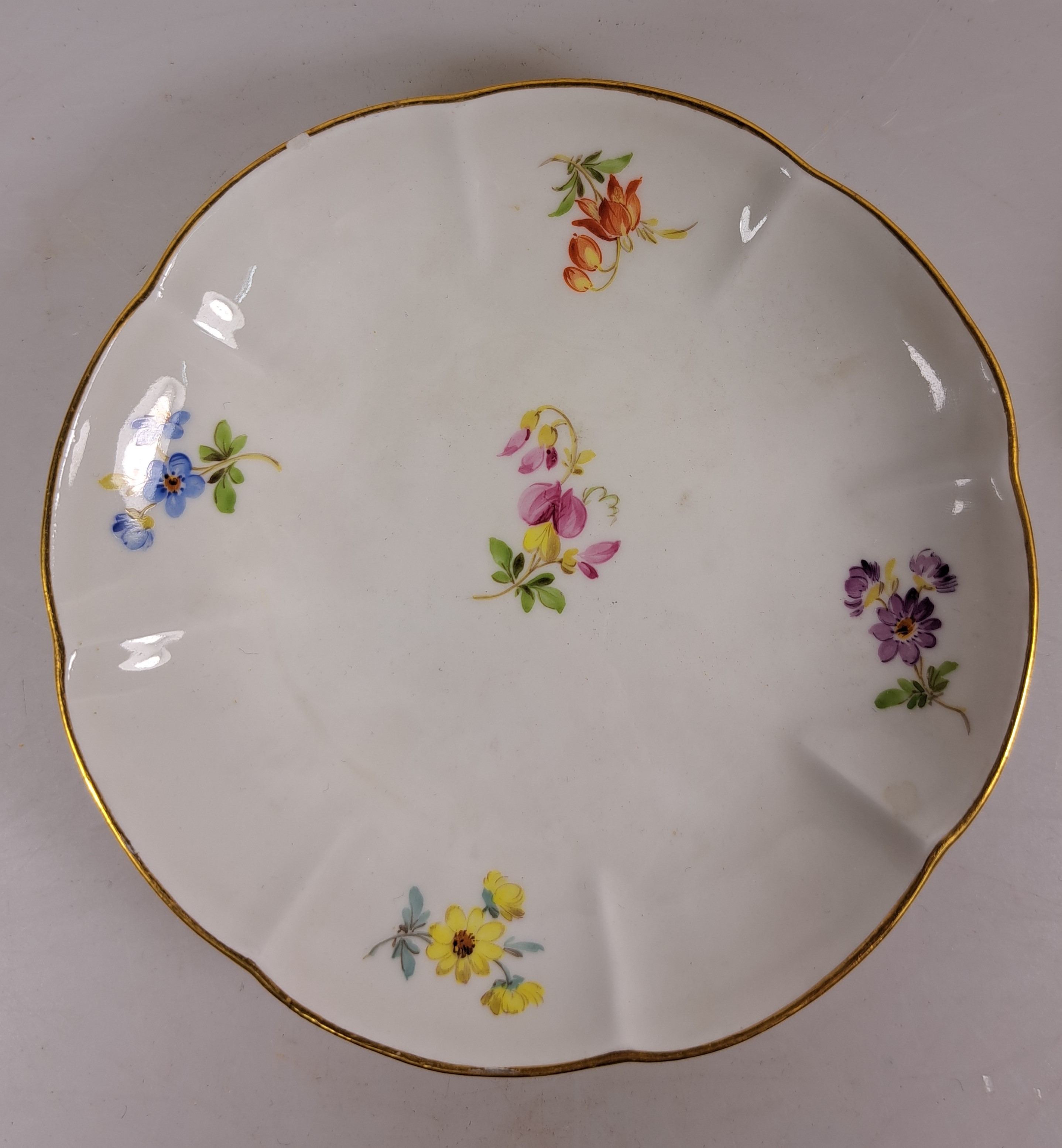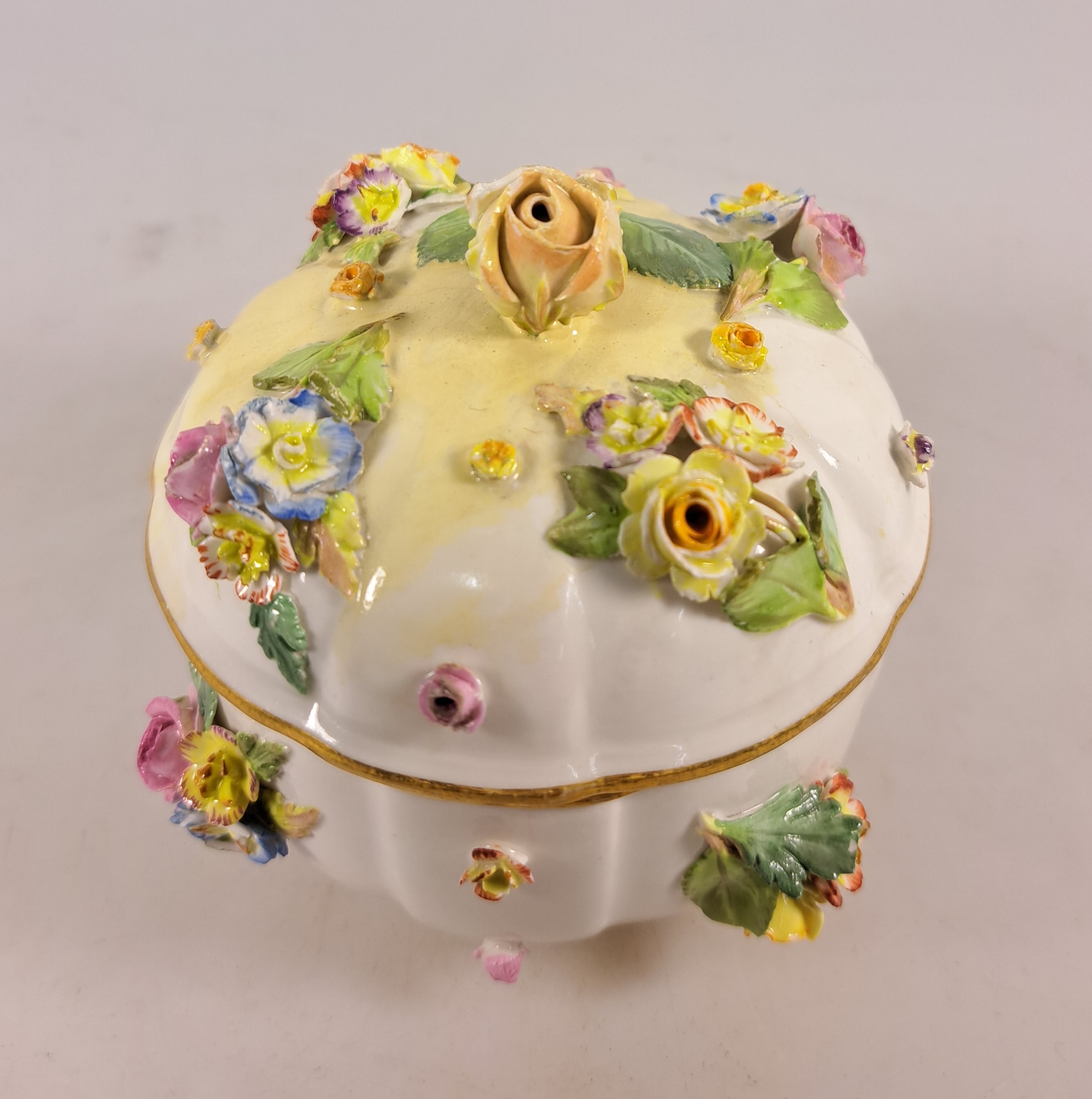 Tete-a-tete, Meissen, Knaufzeit/Anfang 20.Jh., Porzellan, gestreute Blümchen, applizierte Blüten und Blätter mehrfach best., mehrfach restauriert, Tablett, 2 Tassen mit UT, Milchkanne, Zuckerdose und Mokkakännchen mit Deckel