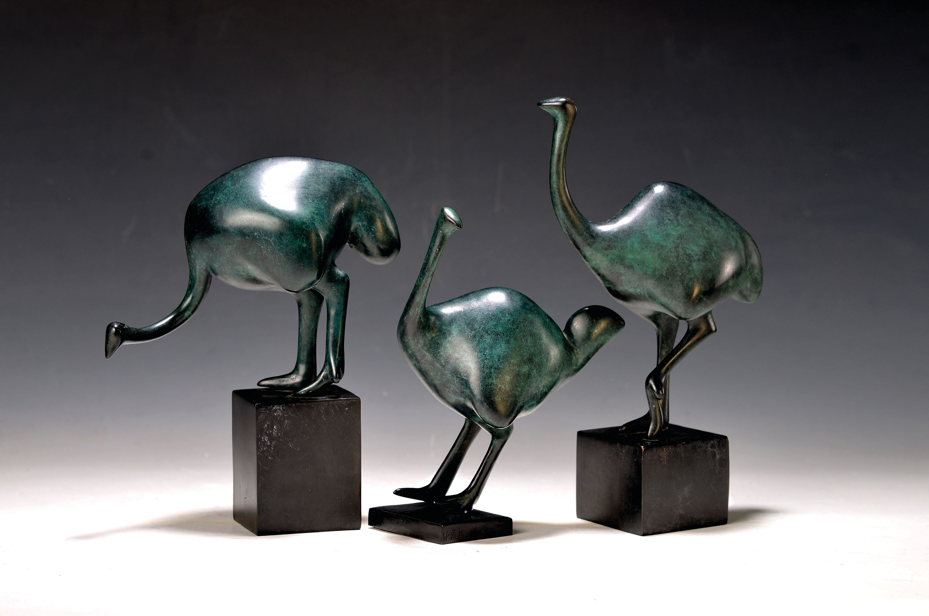Peter Woytuk, geb. 1958, 3 Bronzeskulpturen von Straußen, alle sign., H. ca. 24/21/18cm