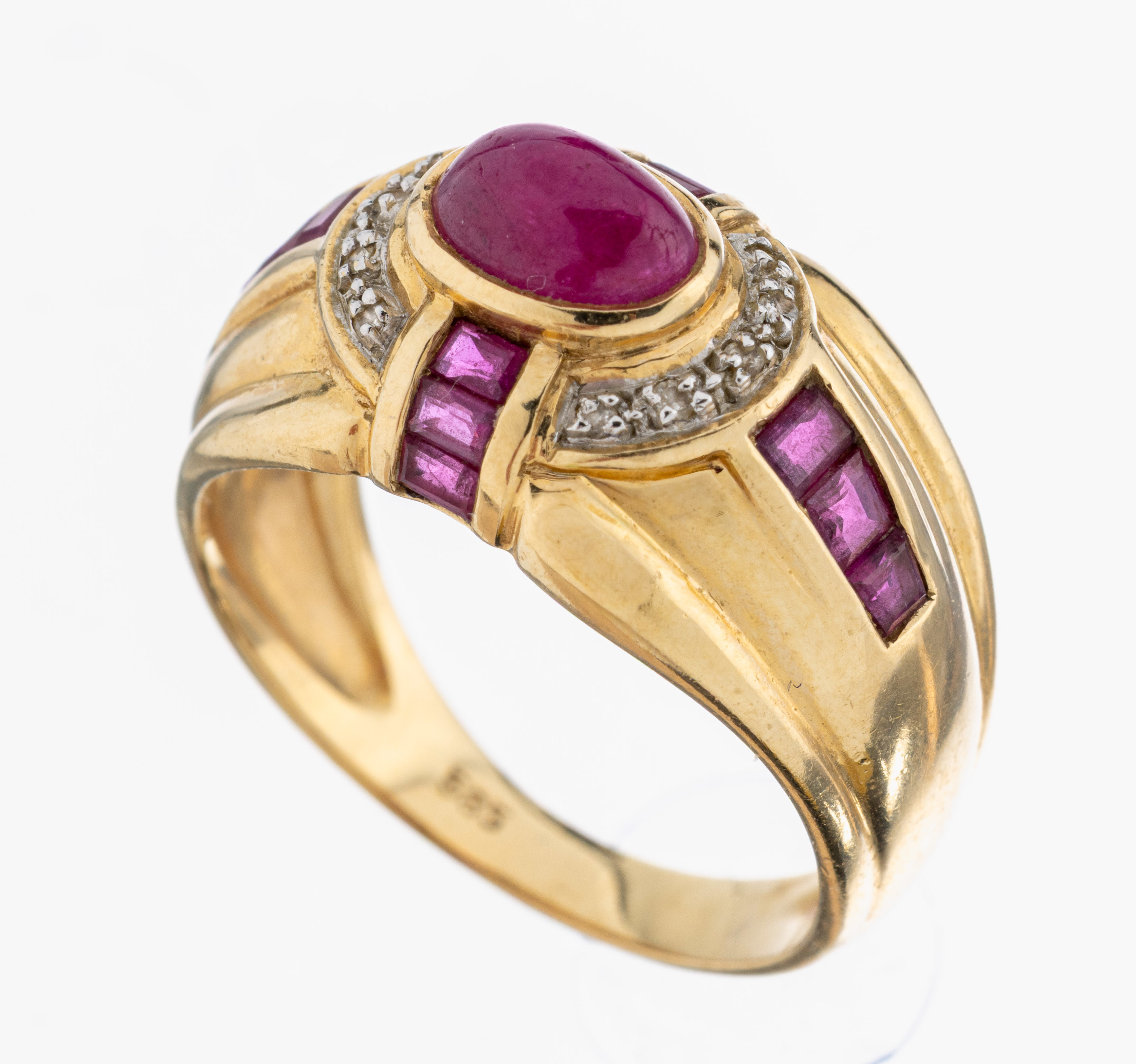 14 kt Gold Rubin-Diamant-Ring, GG 585/000, Rubin-Cabochon und 12 Rubin-Carrees zus.