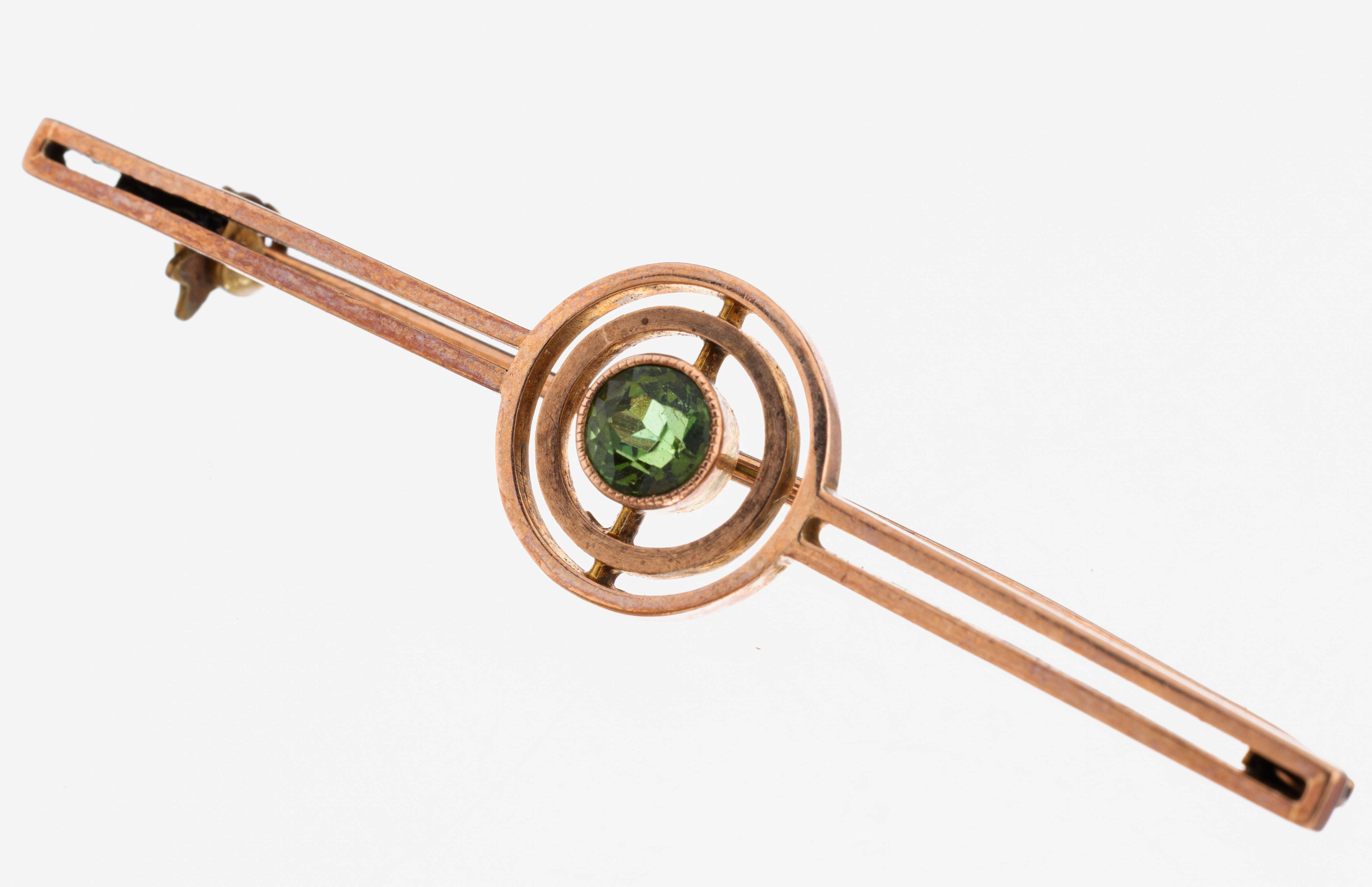 9 kt Gold Turmalin-Brosche, RG 375/000, mittig ein rundfacett. Turmalin, L. ca. 6