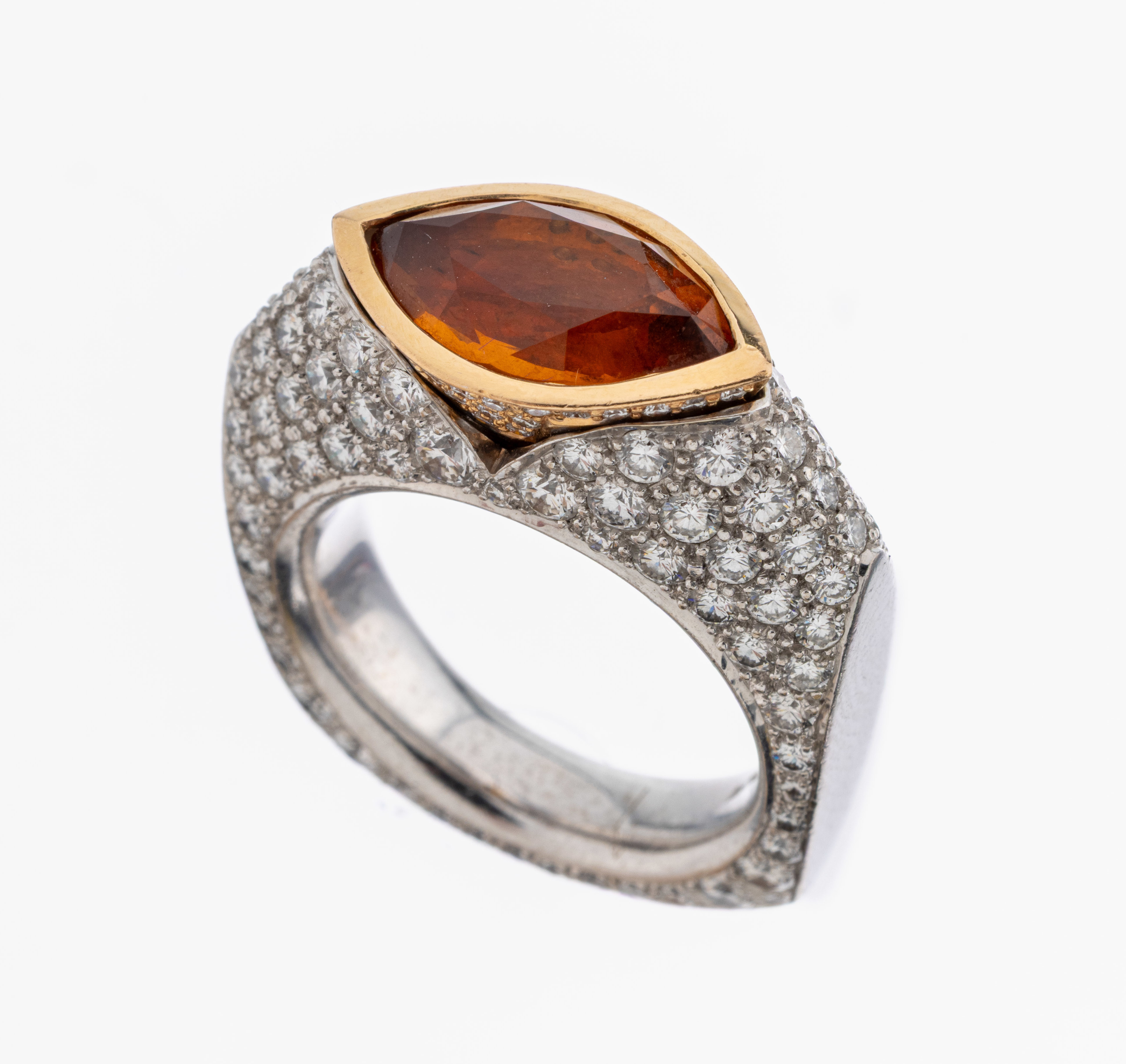 Ausgefallener 18 kt Gold Citrin-Brillant-Ring, WG/RG 750/000, schwere qualitätvolle