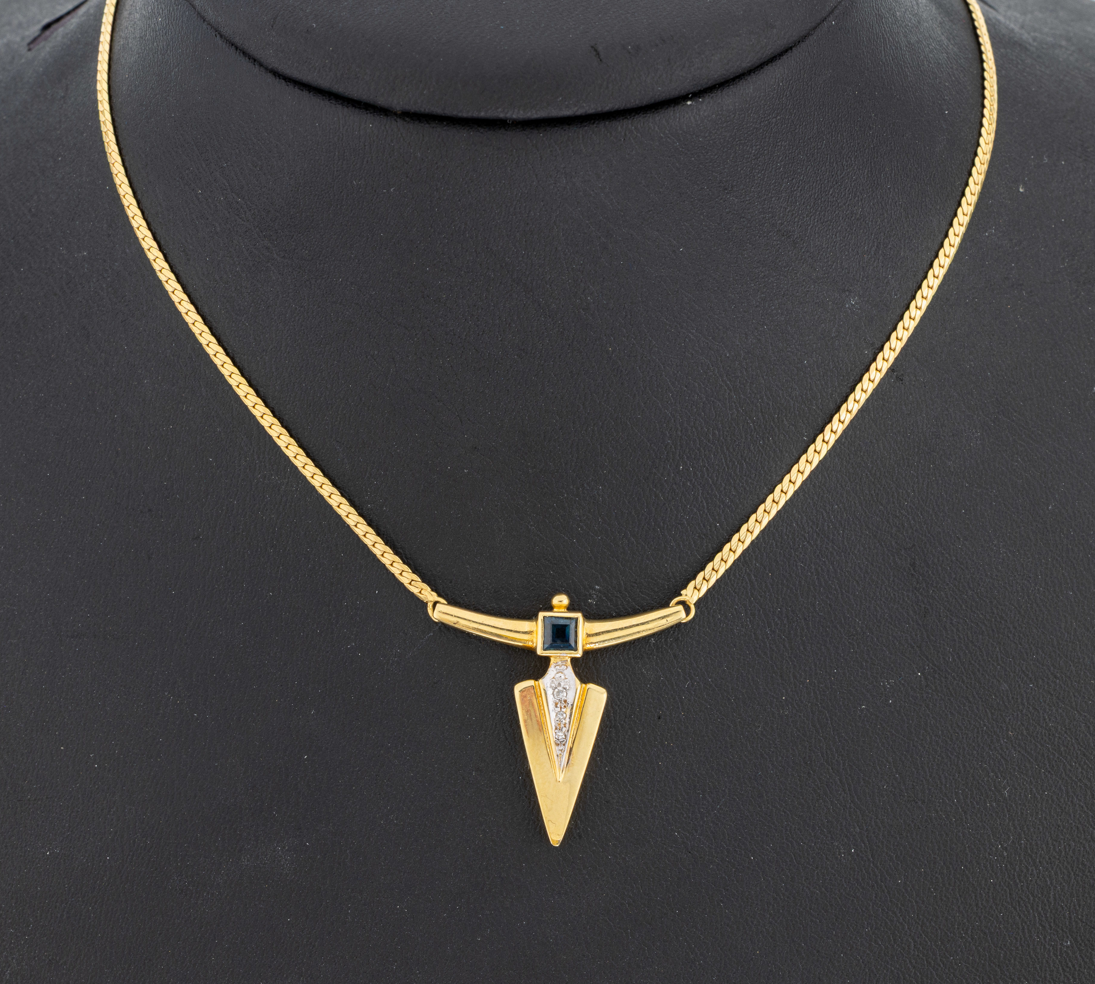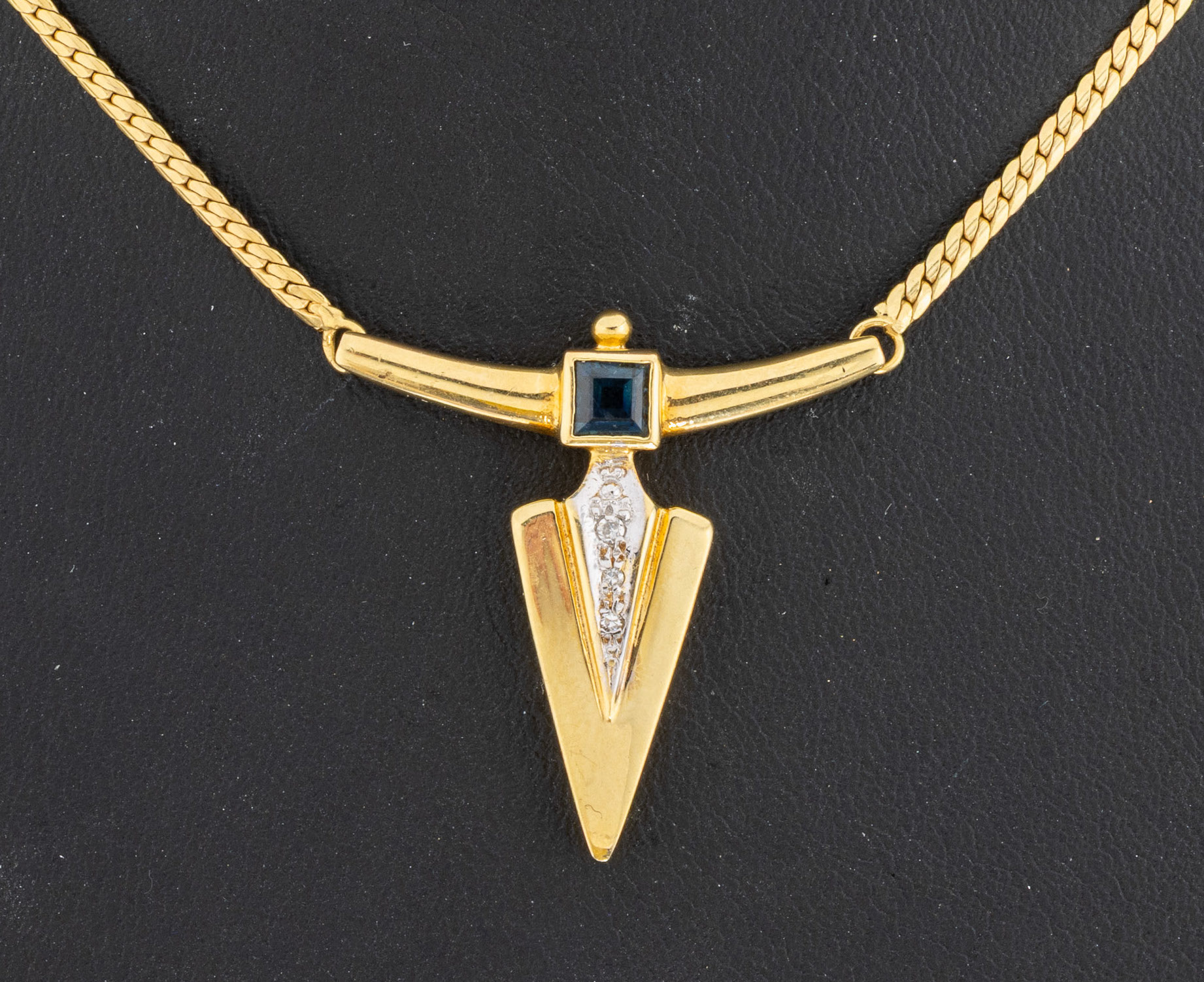 14 kt Gold Saphir-Diamant-Collier, GG 585/000, geometrisches Mittelteil, Saphir -Carree