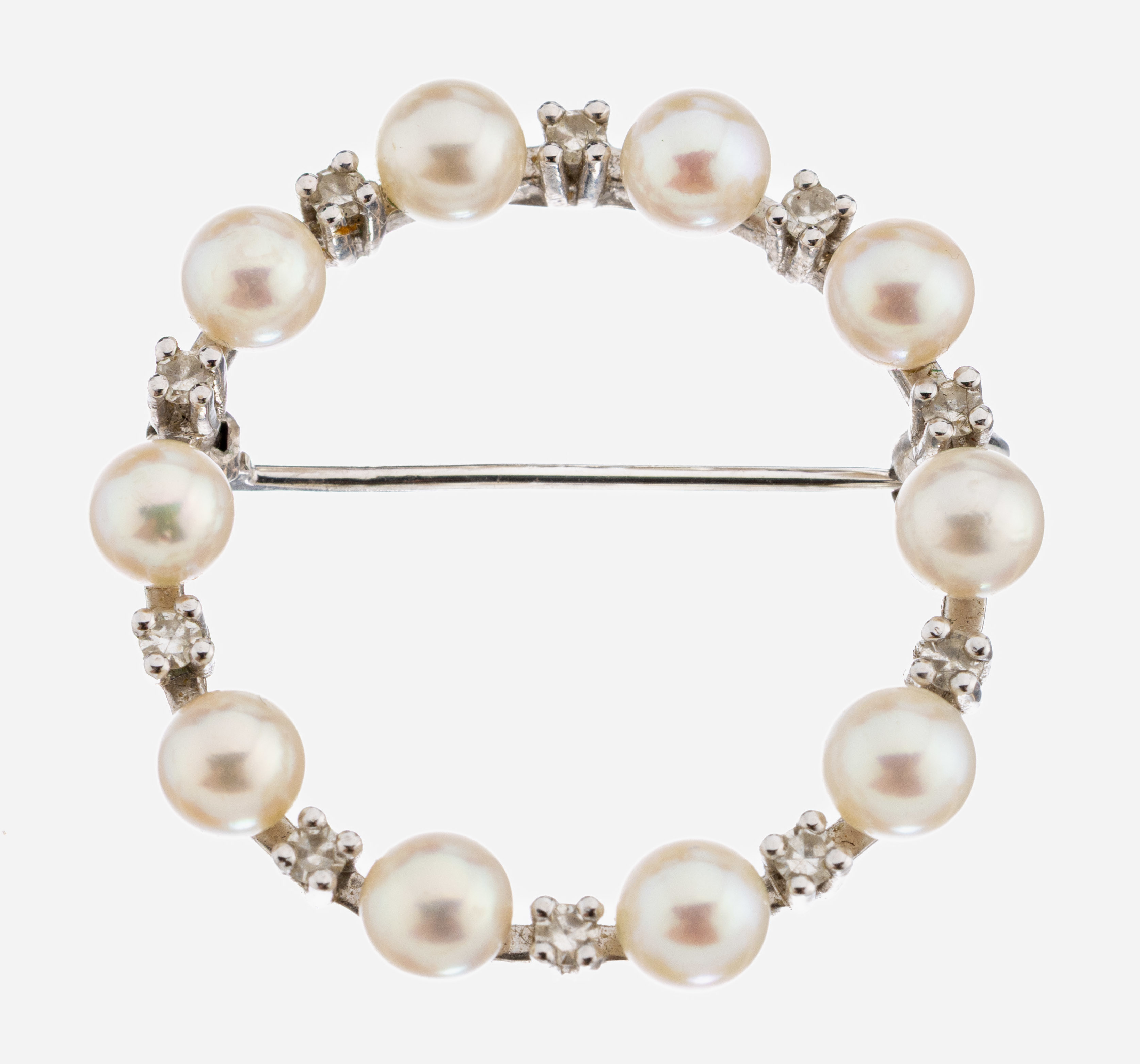 14 kt Gold Perl-Brillant-Brosche, WG 585/000, kreisförm., weiße Süßwasserzuchtperlen
