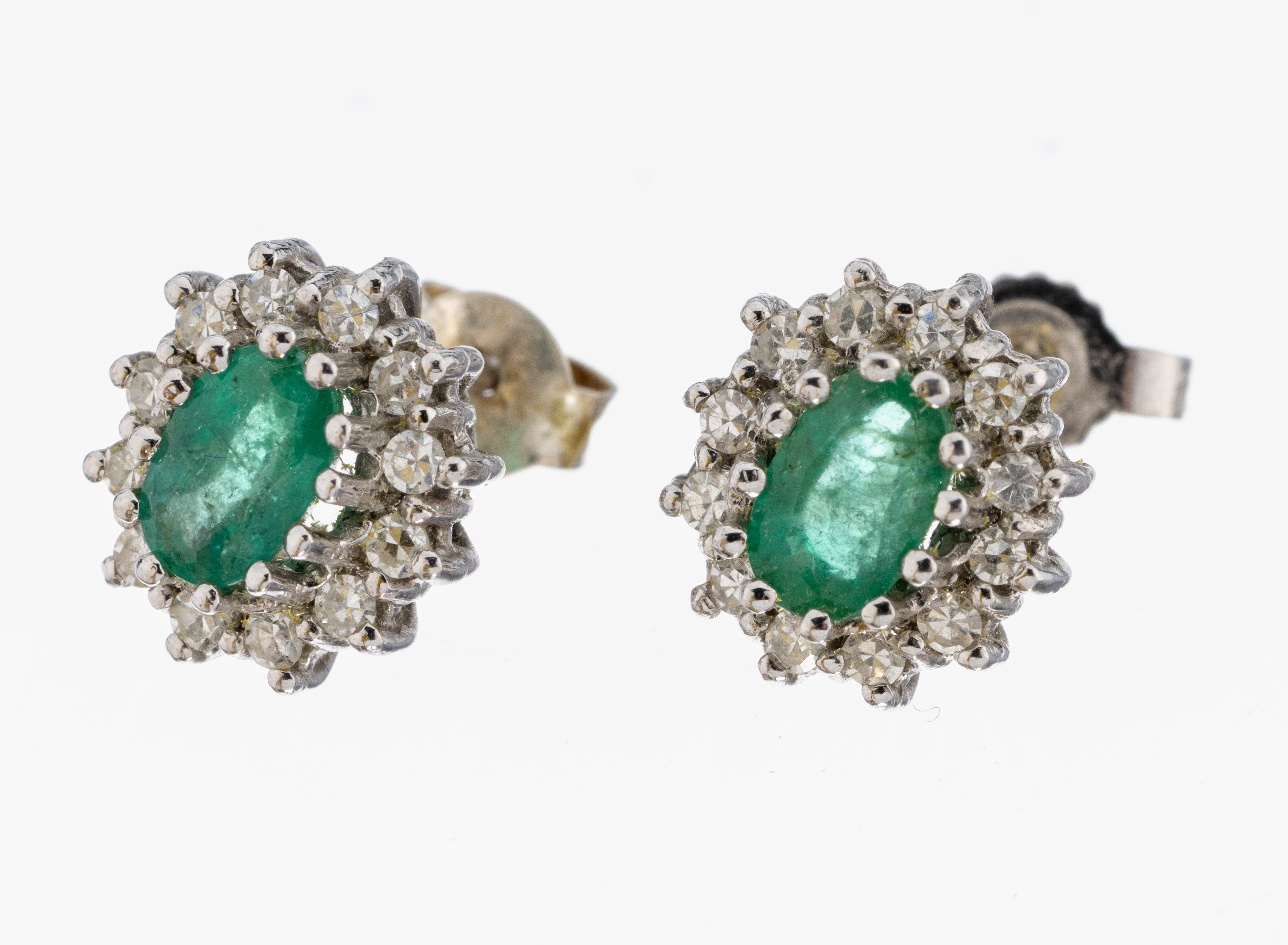 Paar 14 kt Gold Smaragd-Brillant-Ohrstecker, WG 585/000, 2 ovalfacett. Smaragde zus.