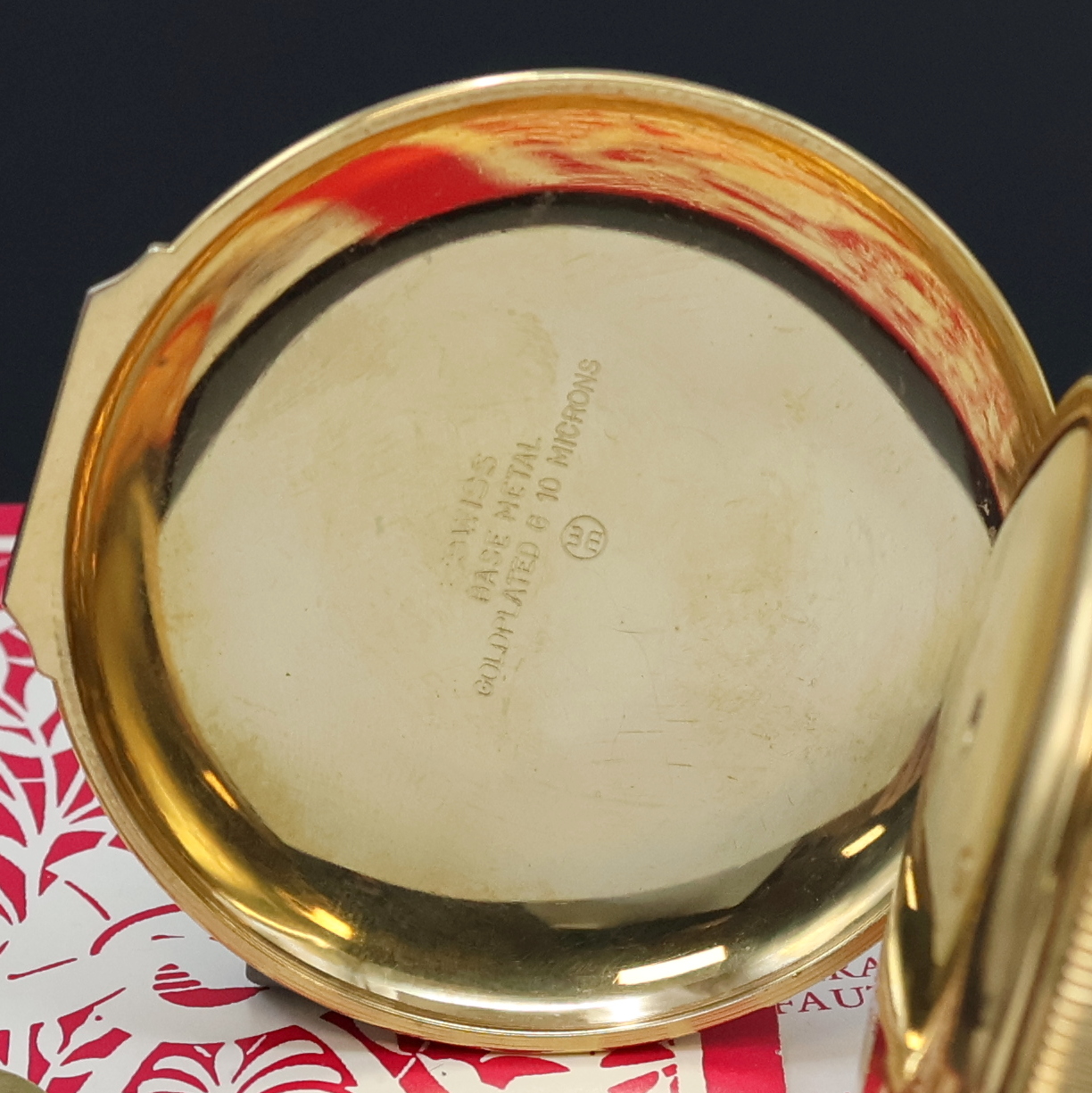 Pap. 08/1980, verg. Geh., Rückdeckel m. grav. Musikinstrumenten, weißes Zifferbl.