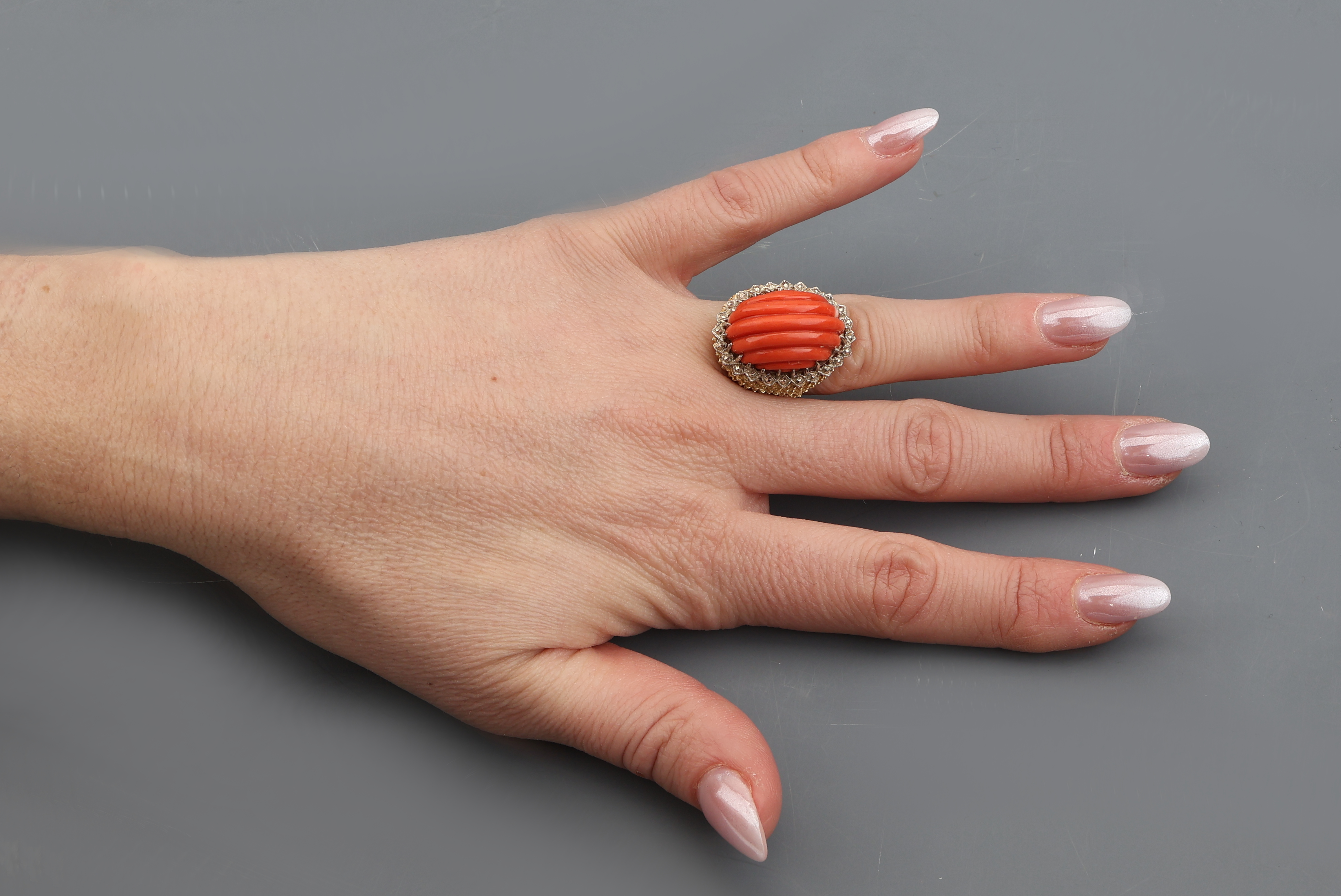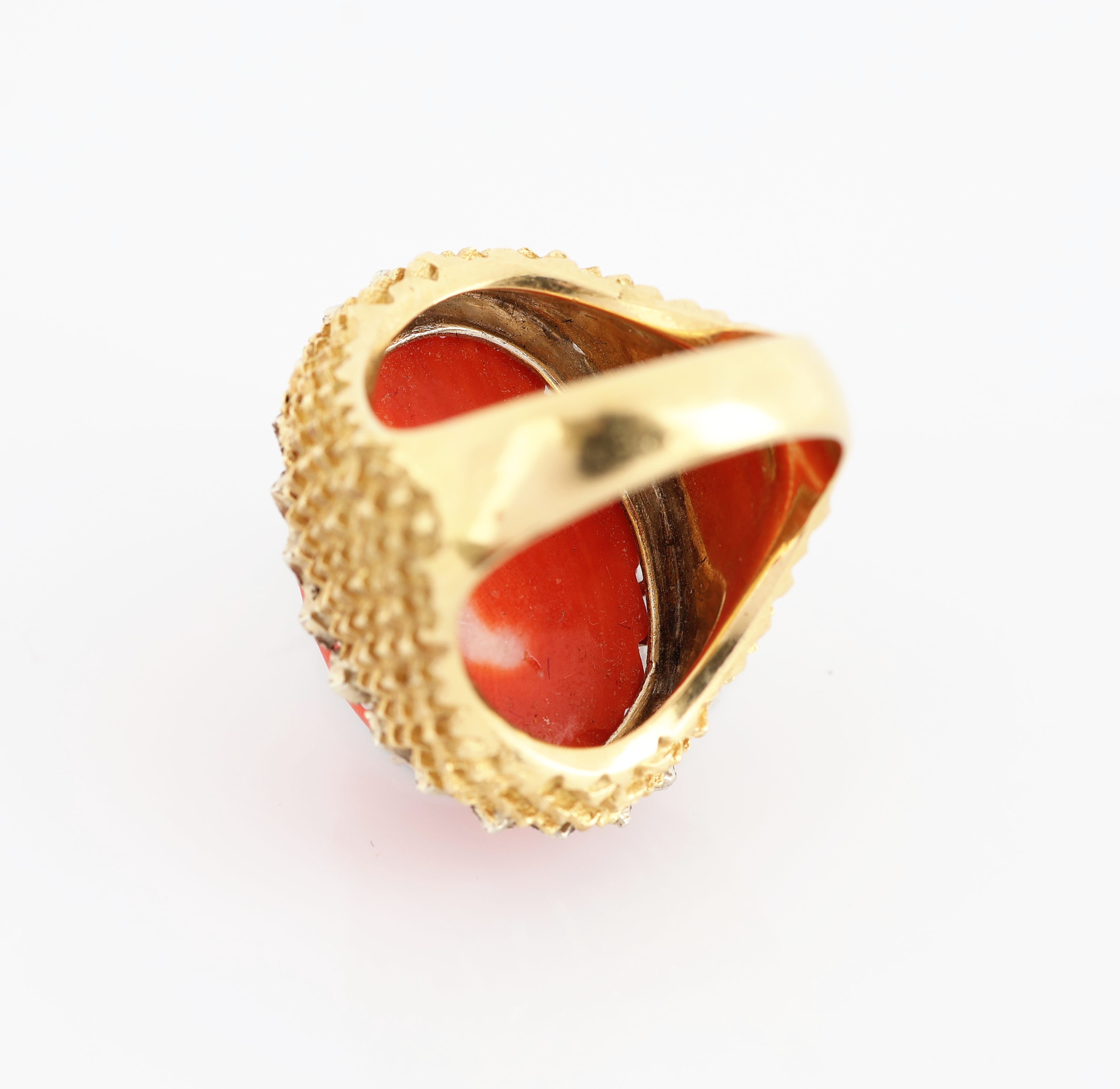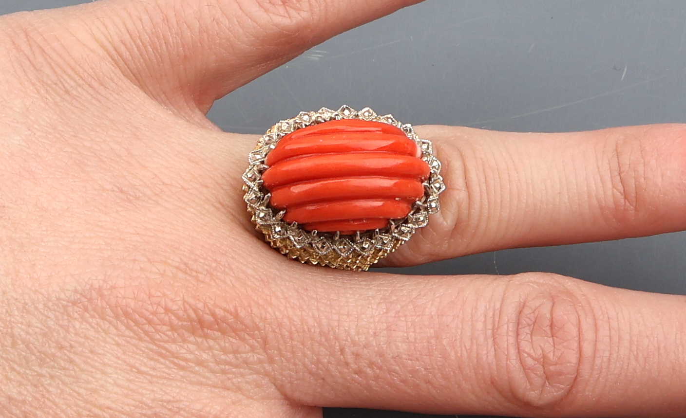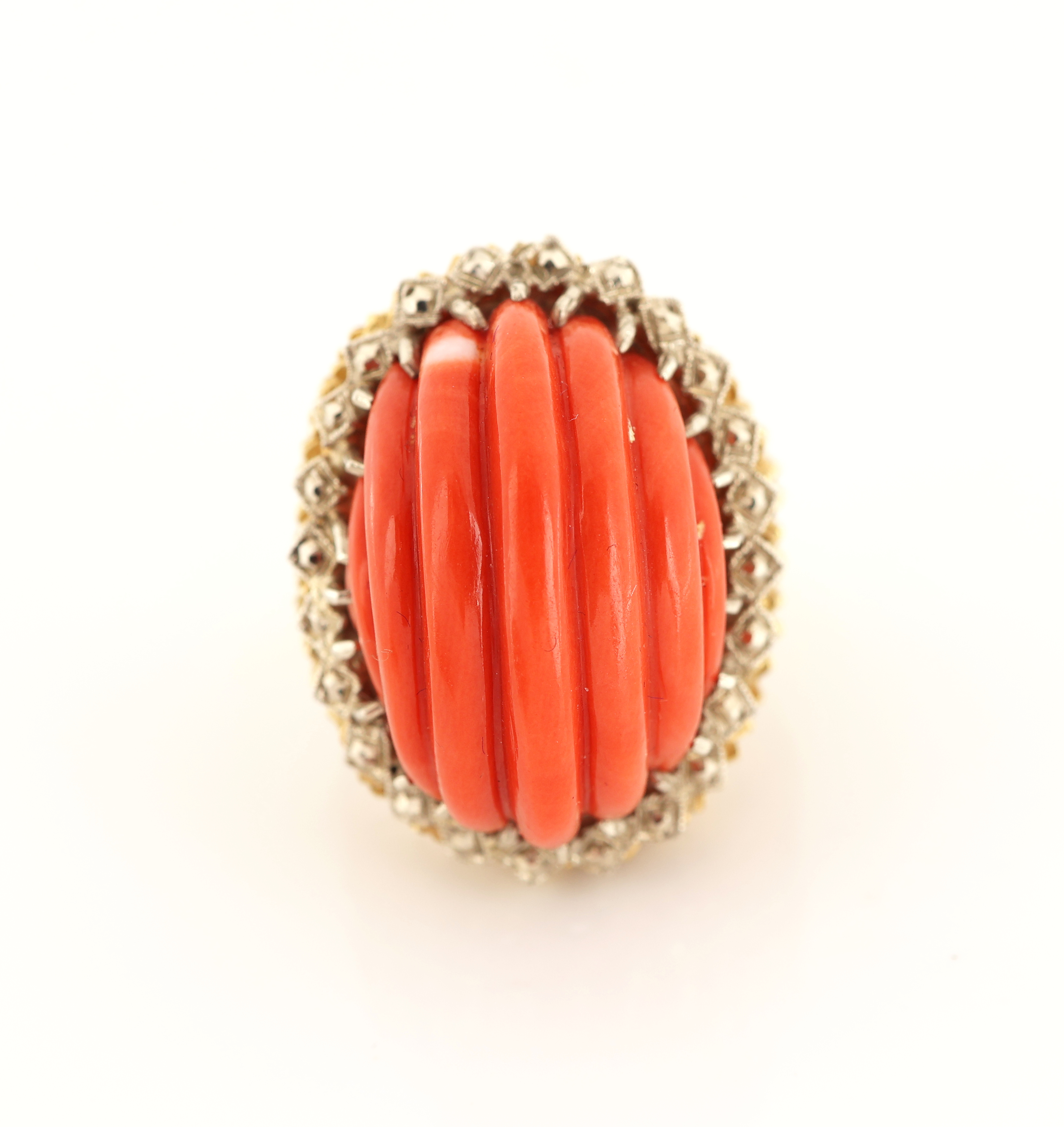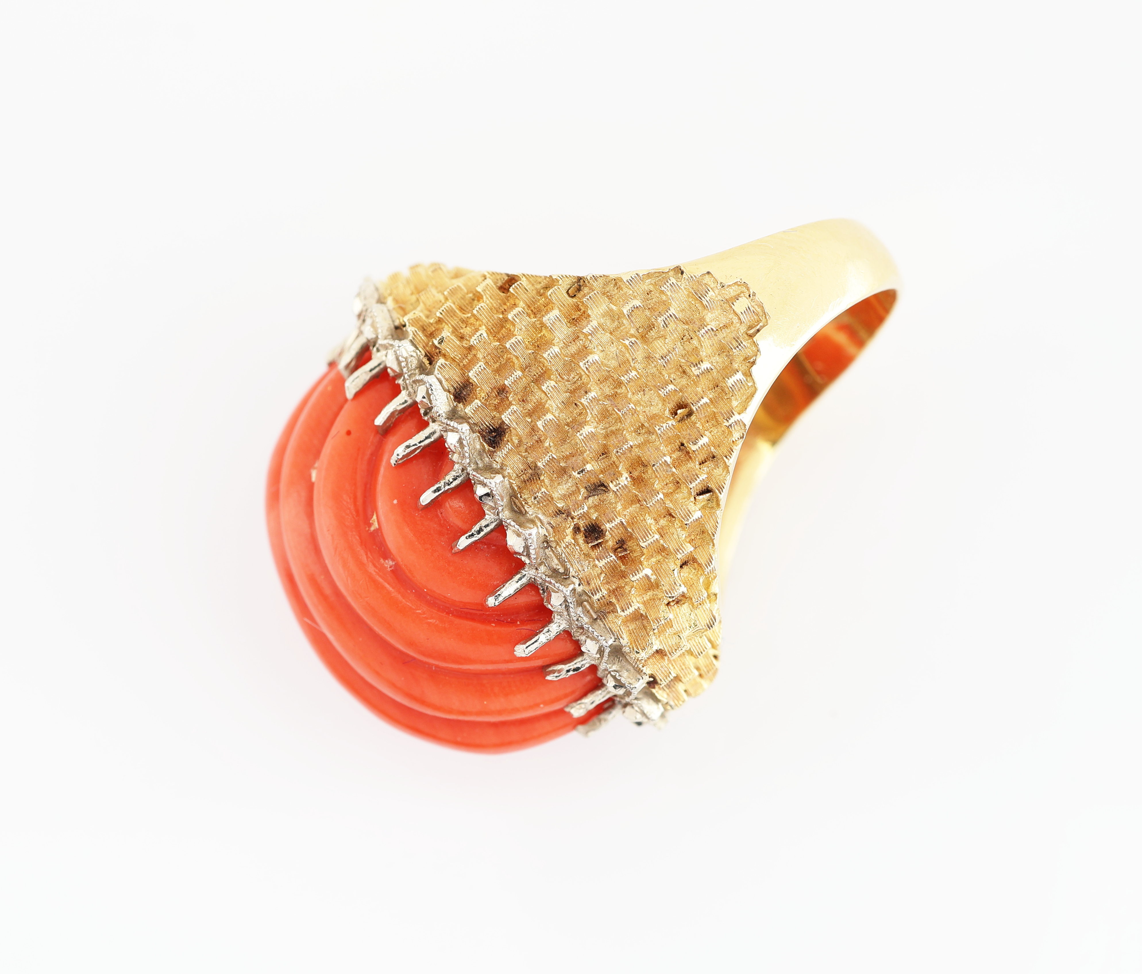 18 kt Gold Korallen-Ring, GG/WG 750/000, außergewöhnliche Gestaltung, geriefte