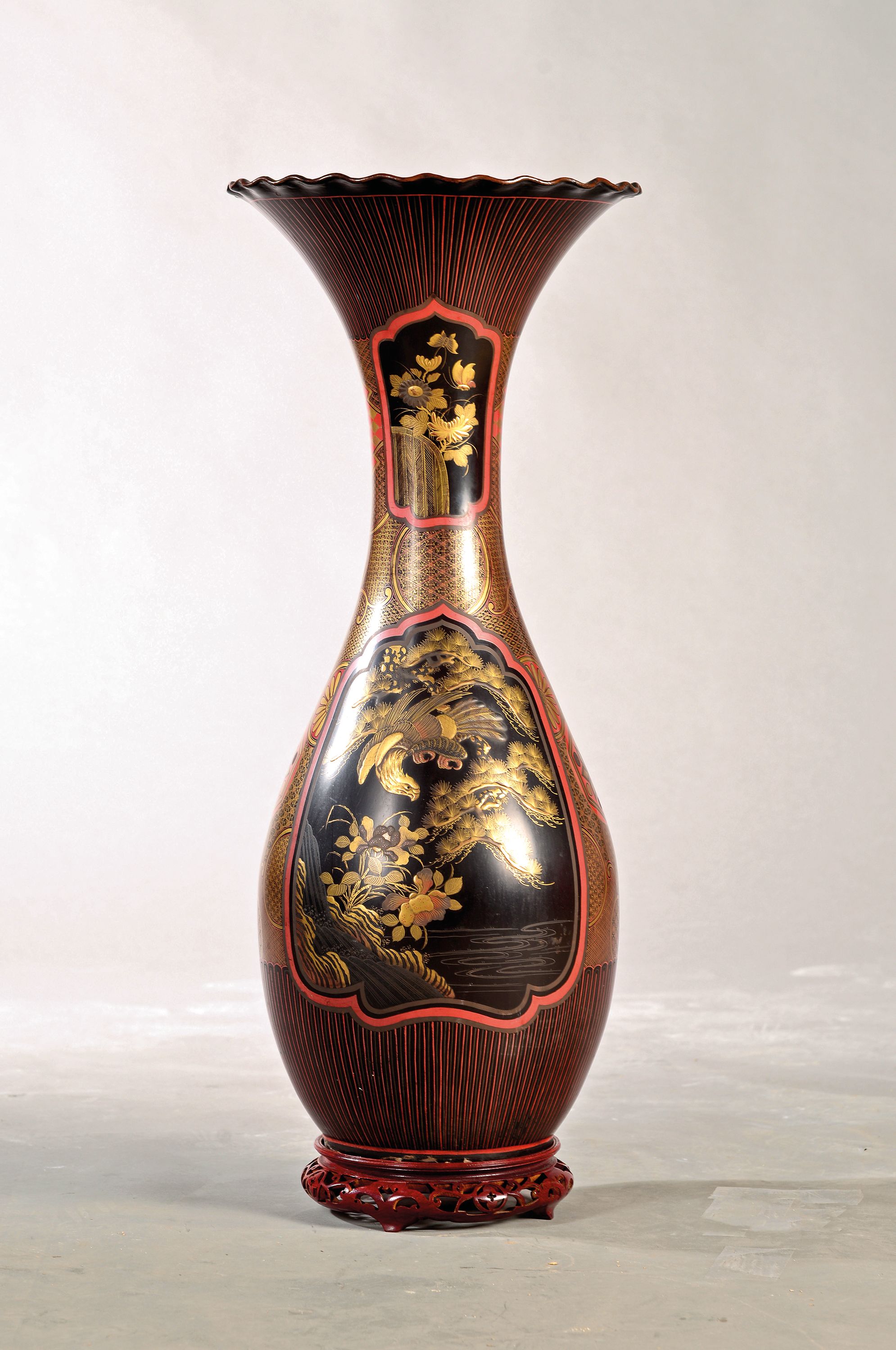 schwarz/rotgrundig glasiert, Goldmalerei, mit Holzsockel, H. 75 cm